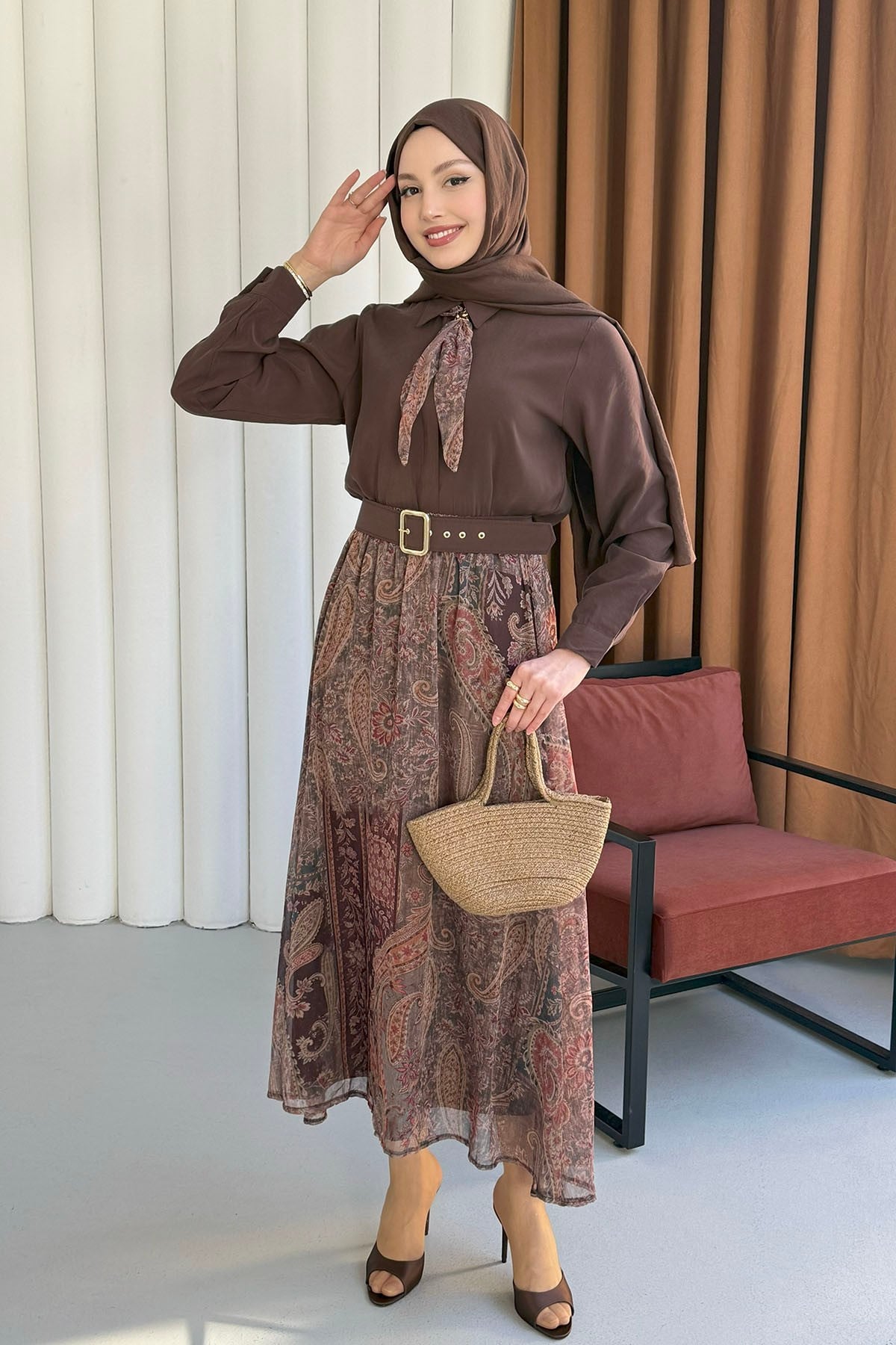 Fular Detaylı Şifon Etekli Tesettür Takım-KAHVERENGİ (9030)