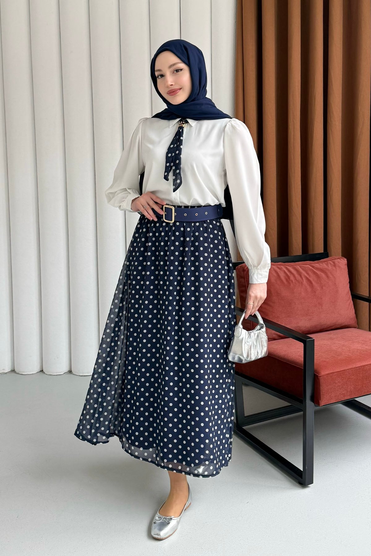 Fularlı Gömlek & Puantiye Etekli Kemerli Tesettür Takım-LACİVERT (9028)