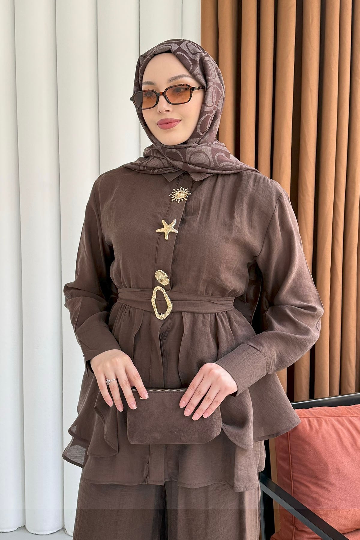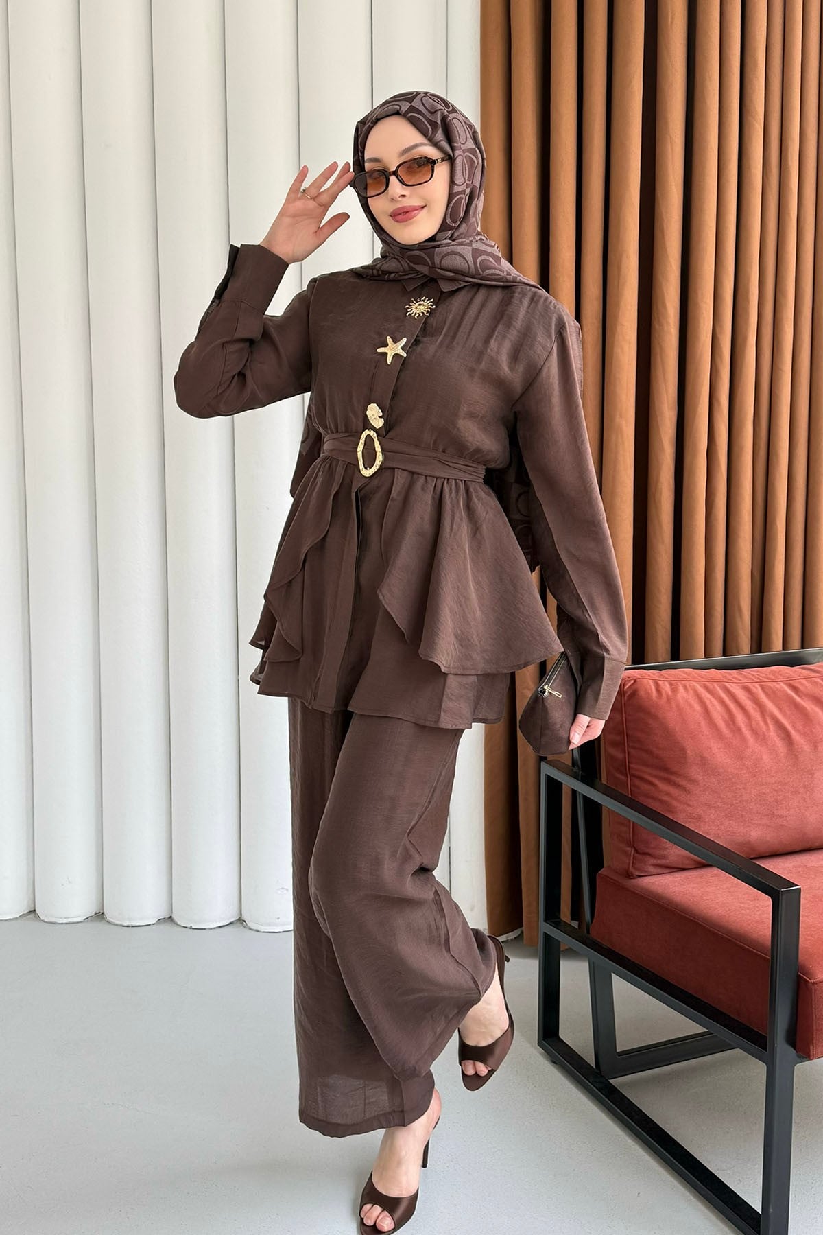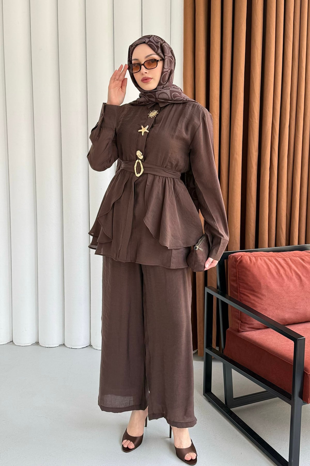 Gold Aksesuarlı Pantolonlu Tesettür Takım-KAHVERENGİ (038)