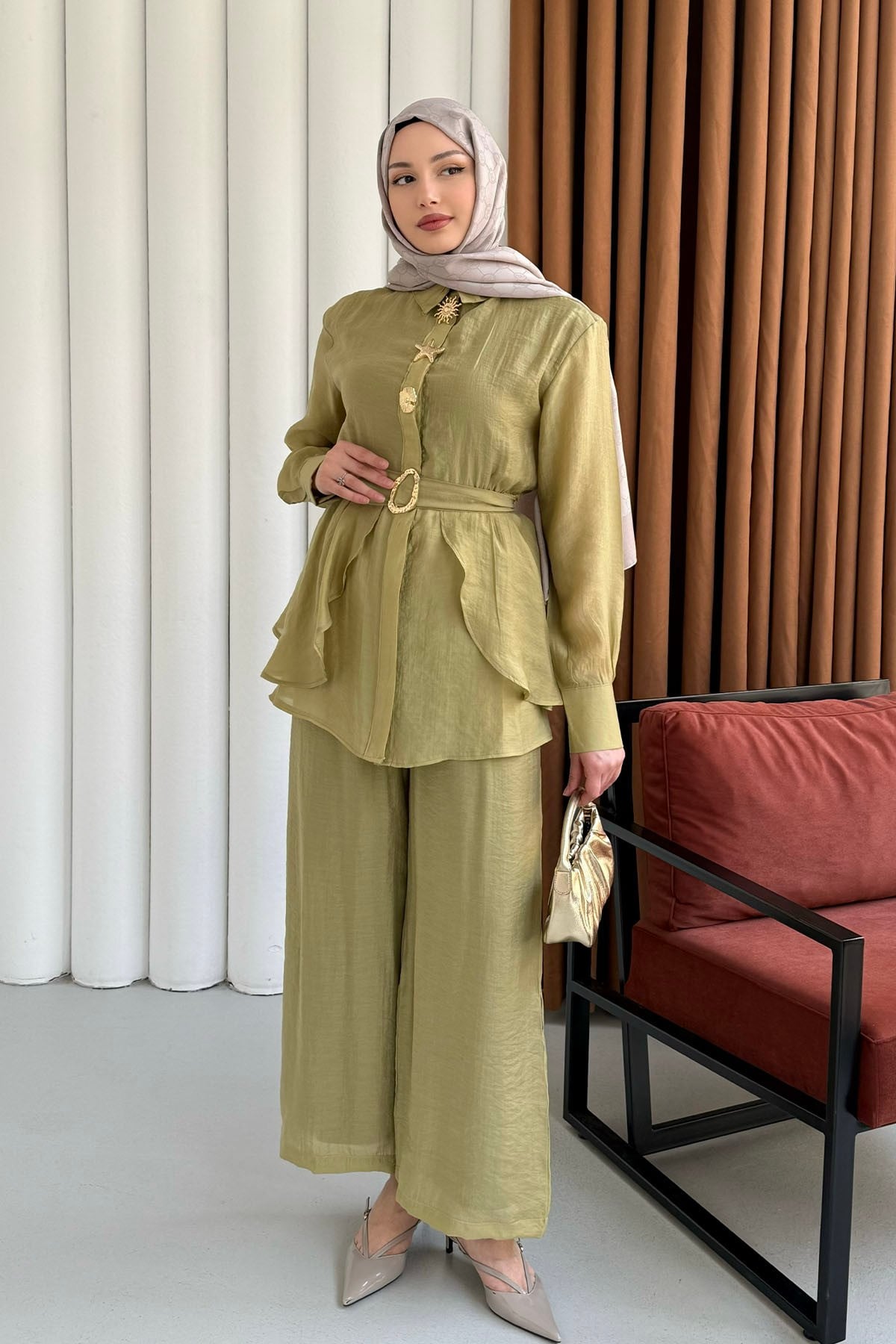 Gold Aksesuarlı Pantolonlu Tesettür Takım-YAĞ YEŞİLİ (038)