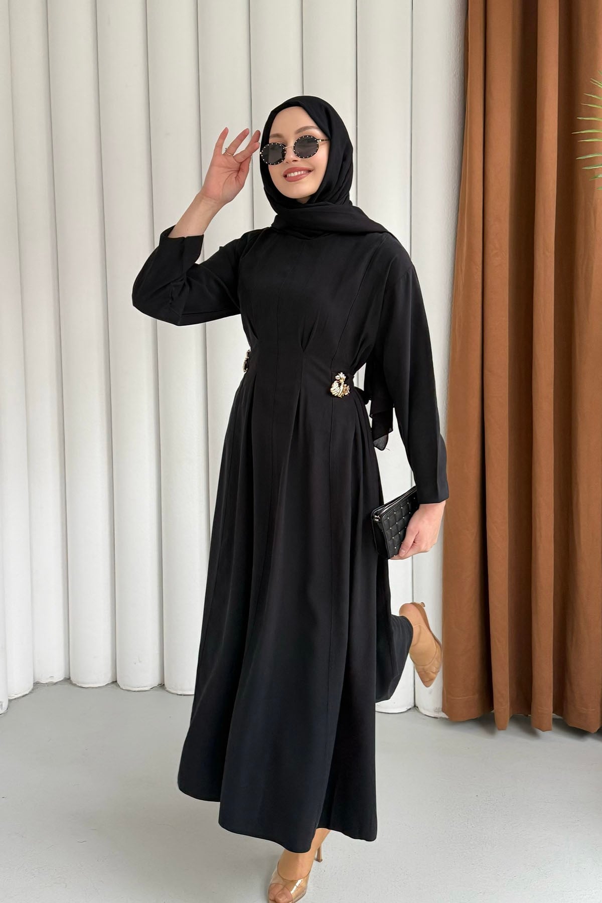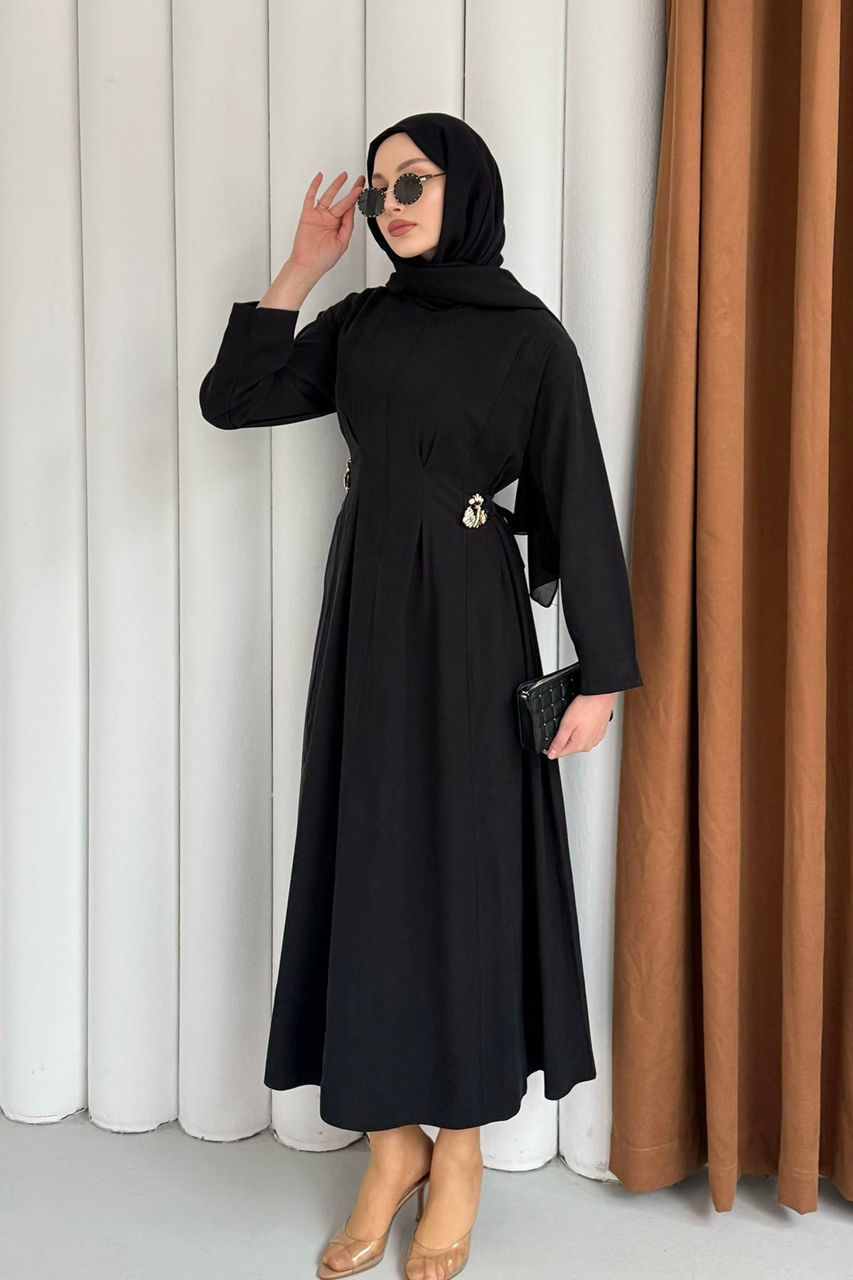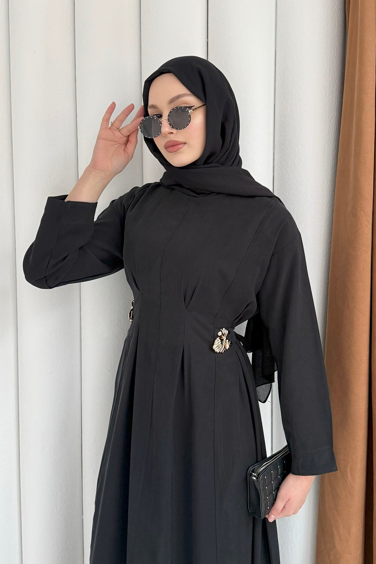 Gold Broş Bel Detaylı Tesettür Elbise-SİYAH (3138)