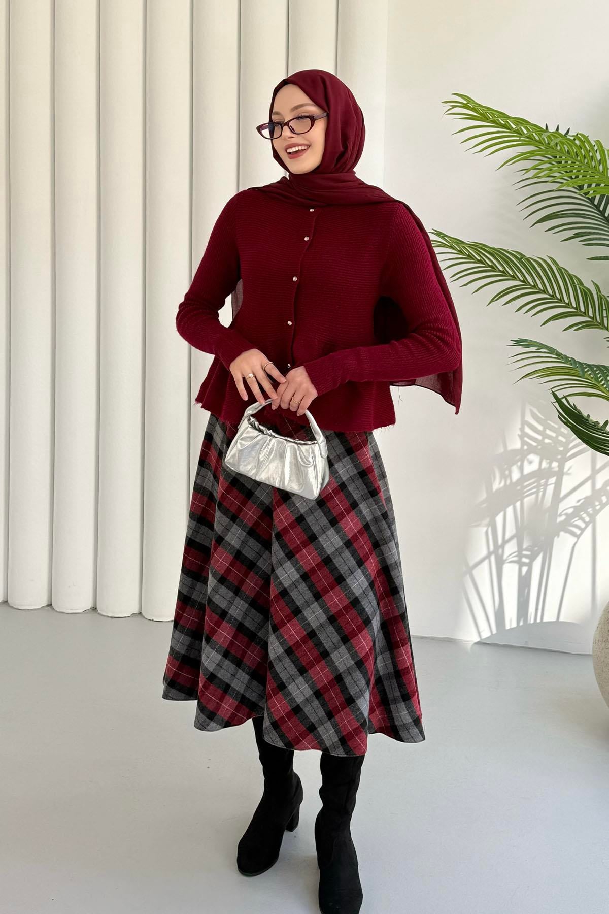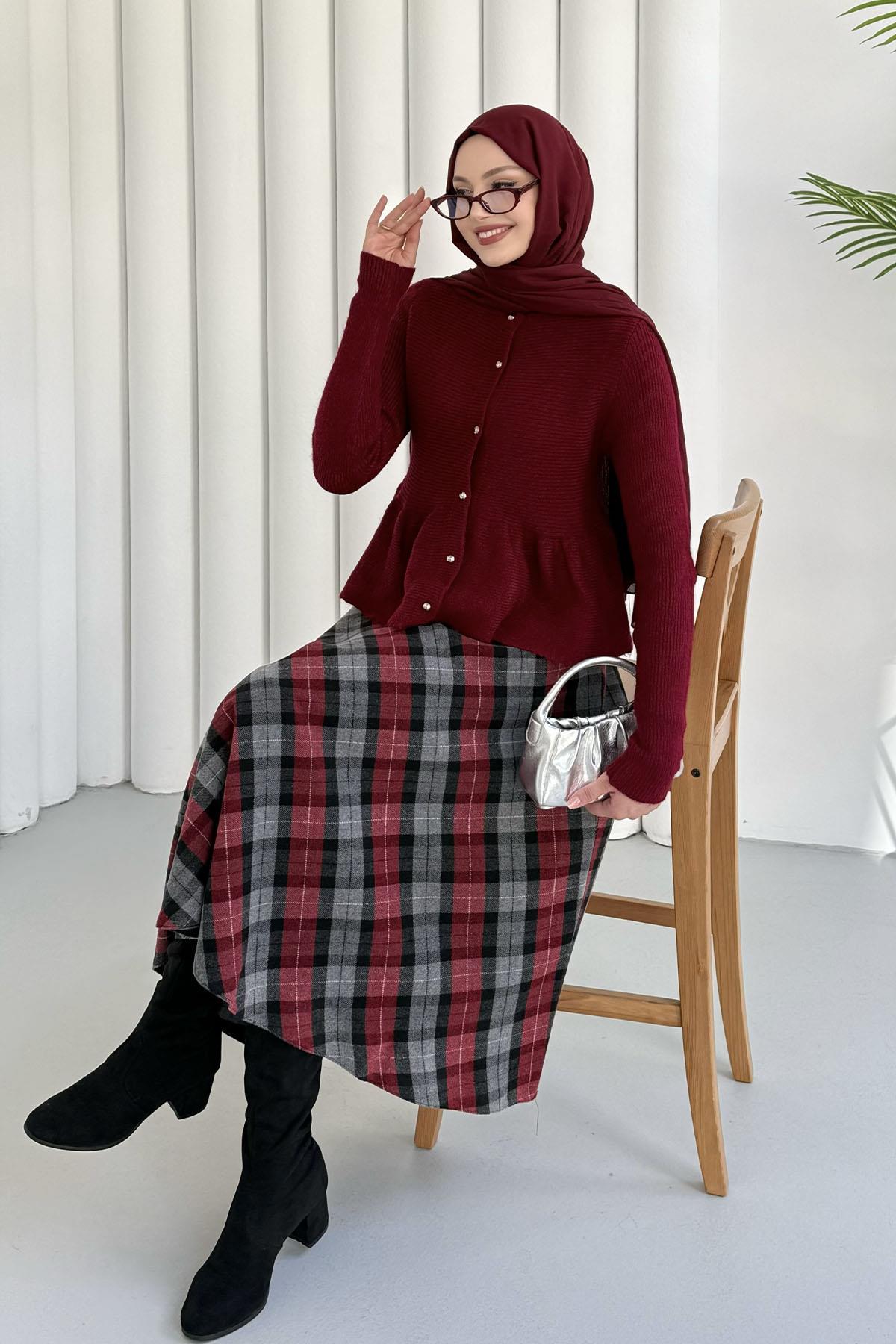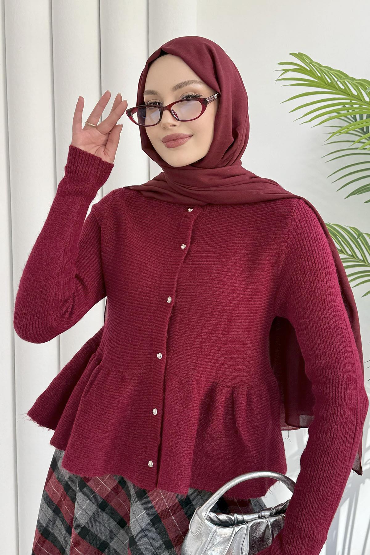 Gold Düğmeli Pileli Crop Hırka-BORDO (30037)