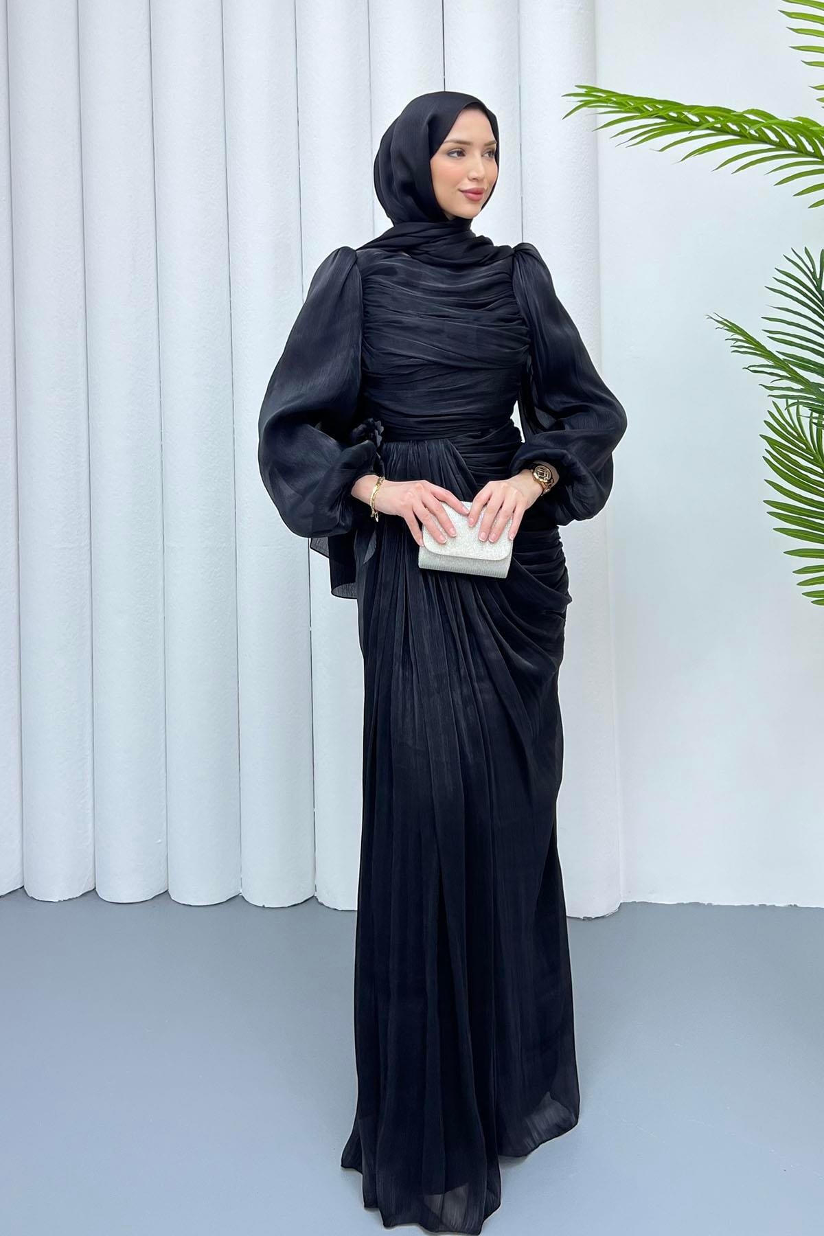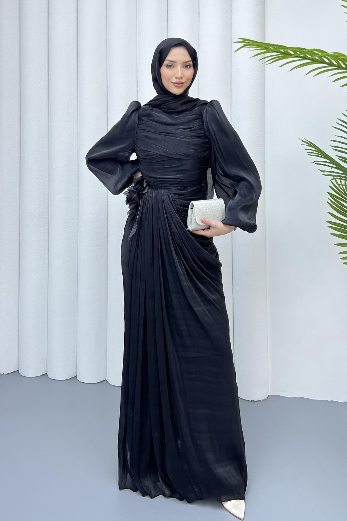 Gül Detaylı Drapeli Tesettür Abiye-SİYAH (5120)