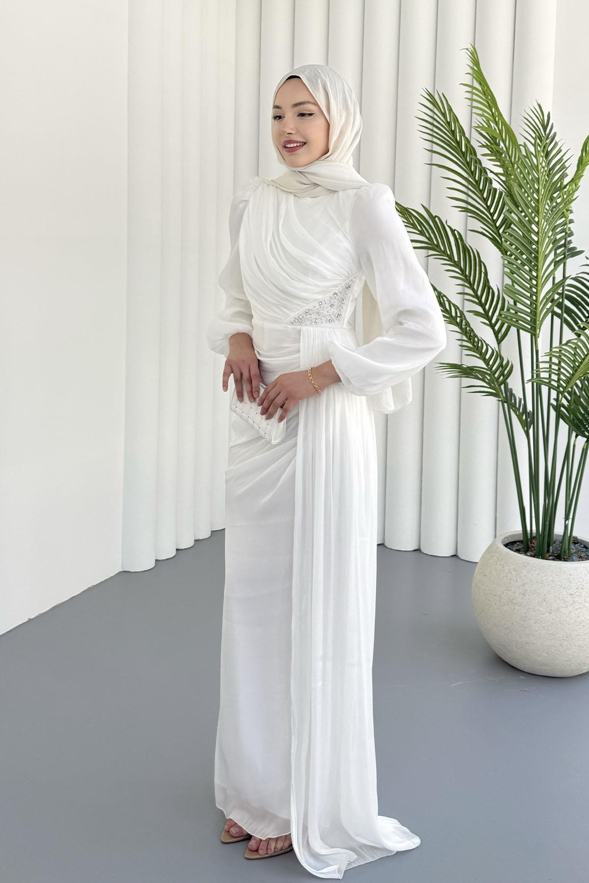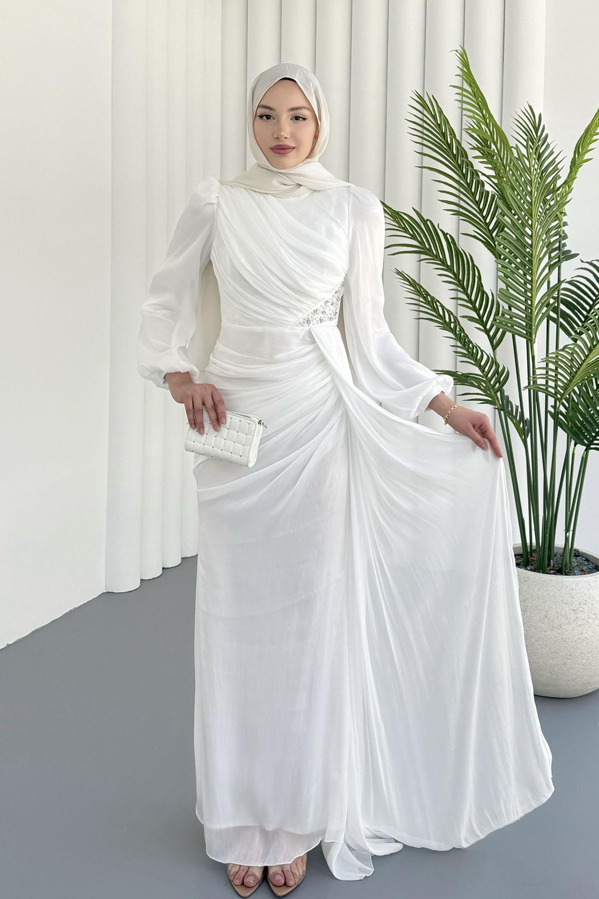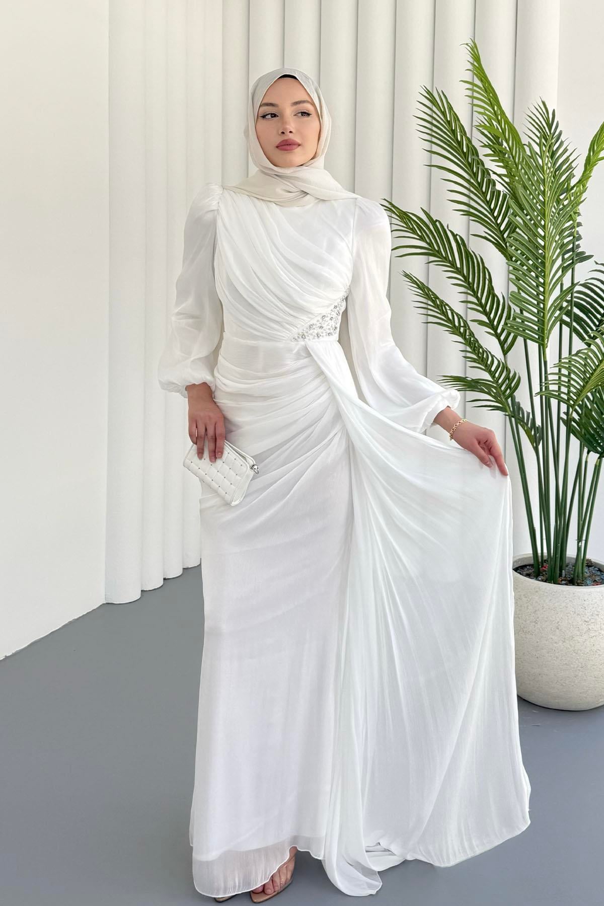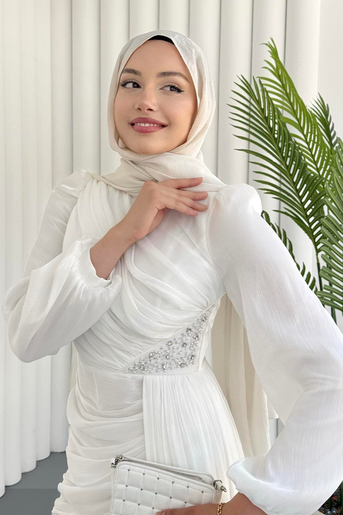 İnci İşlemeli Balon Kol Şifon Tesettür Abiye-BEYAZ (5258)