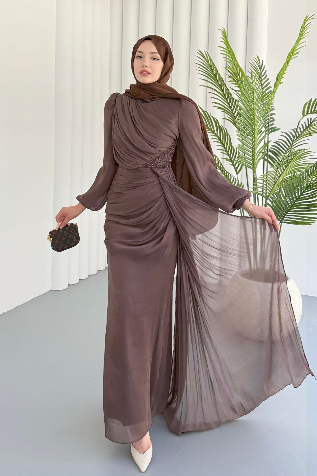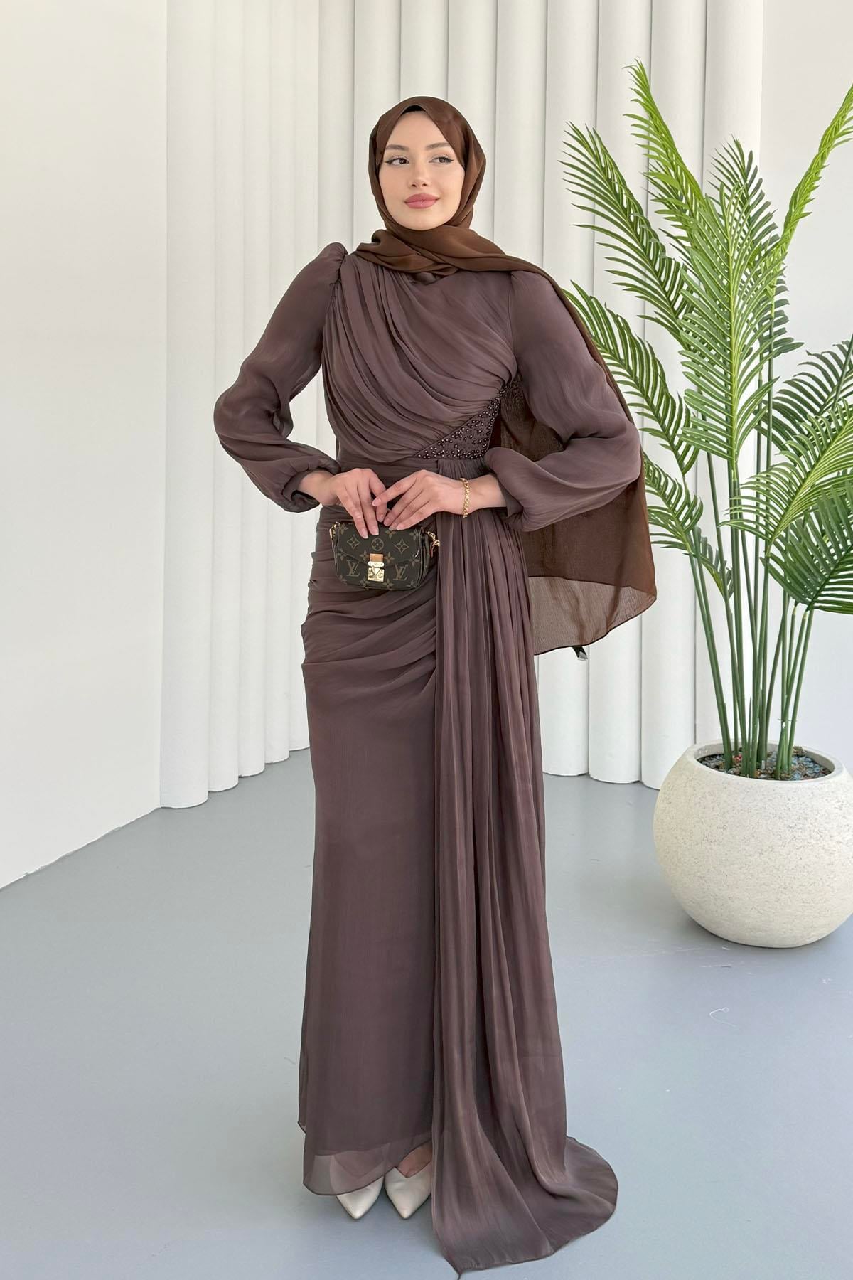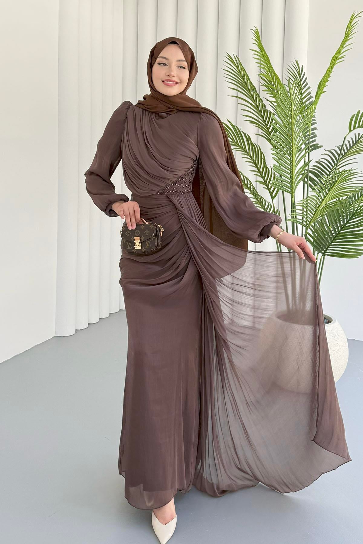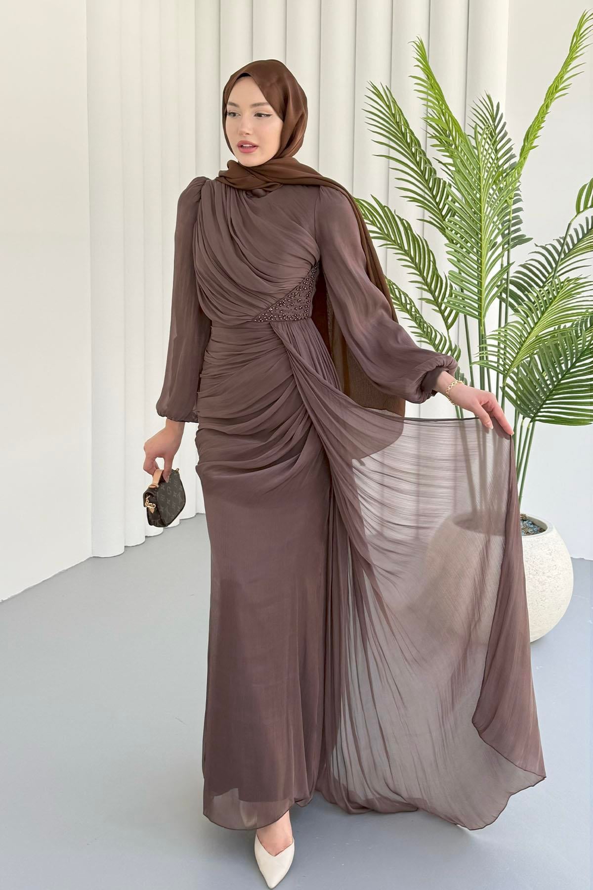 İnci İşlemeli Balon Kol Şifon Tesettür Abiye-KAHVERENGİ (5258)