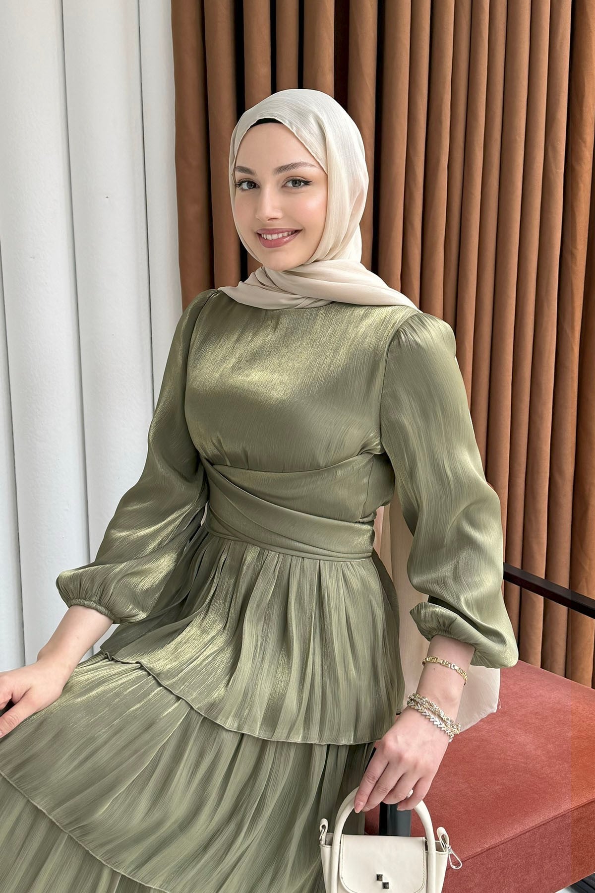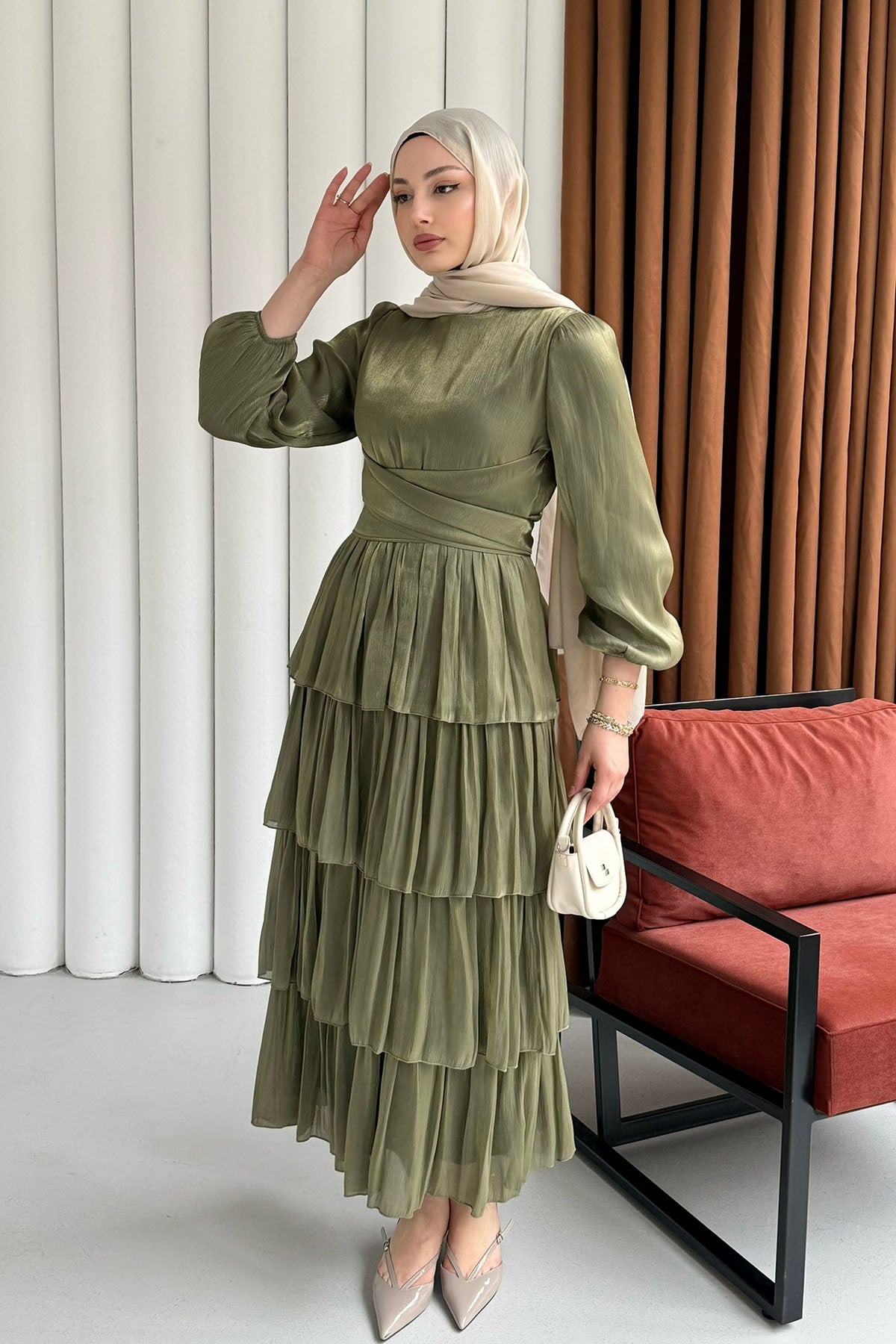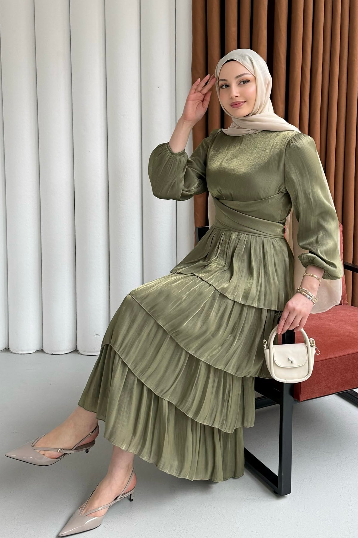 Kat Kat Kuşaklı Şifon Tesettür Elbise-HAKİ YEŞİL (5989)
