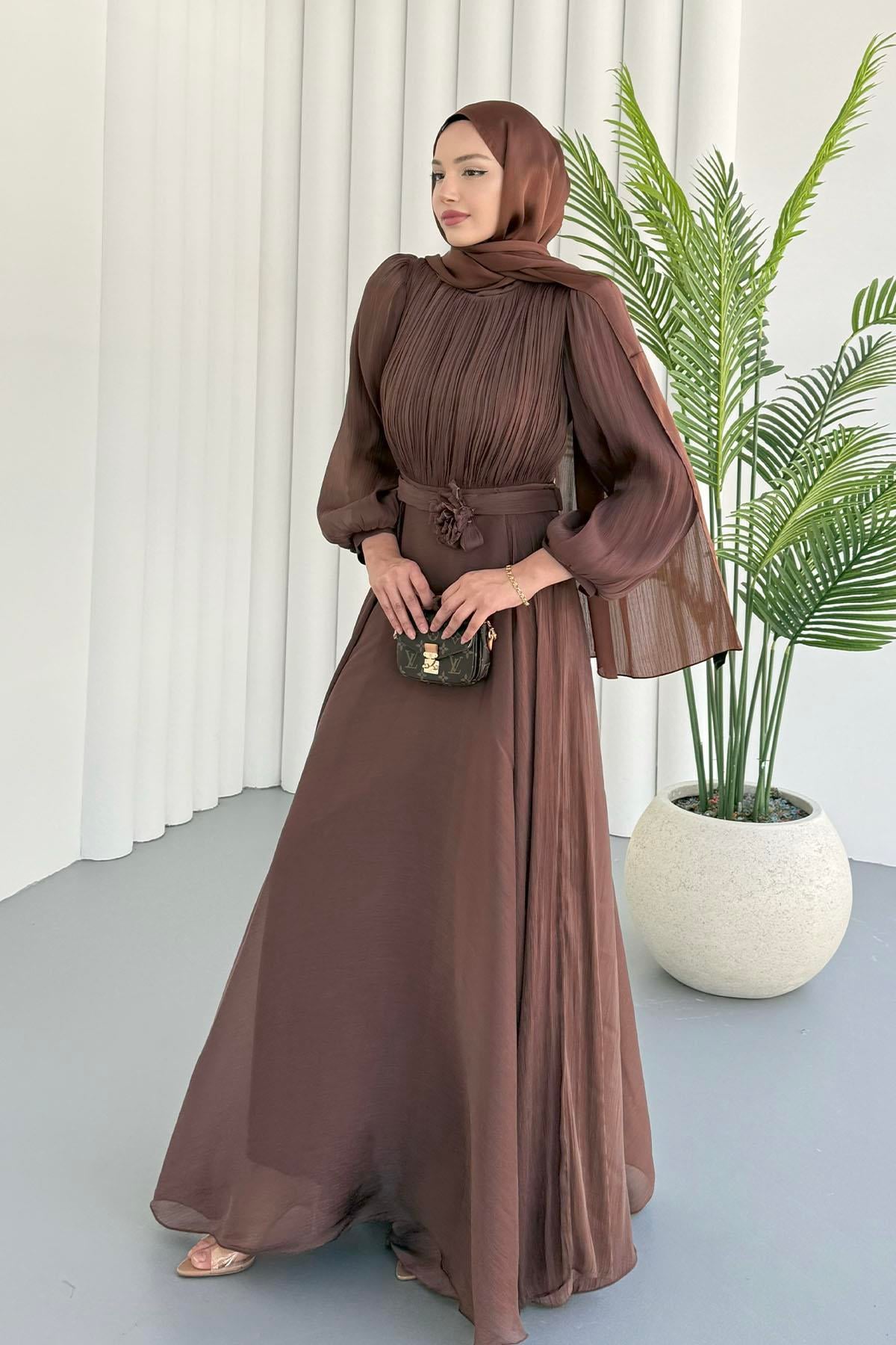Kemeri Güllü Balon Kol Tesettür Abiye-KAHVERENGİ (5107)
