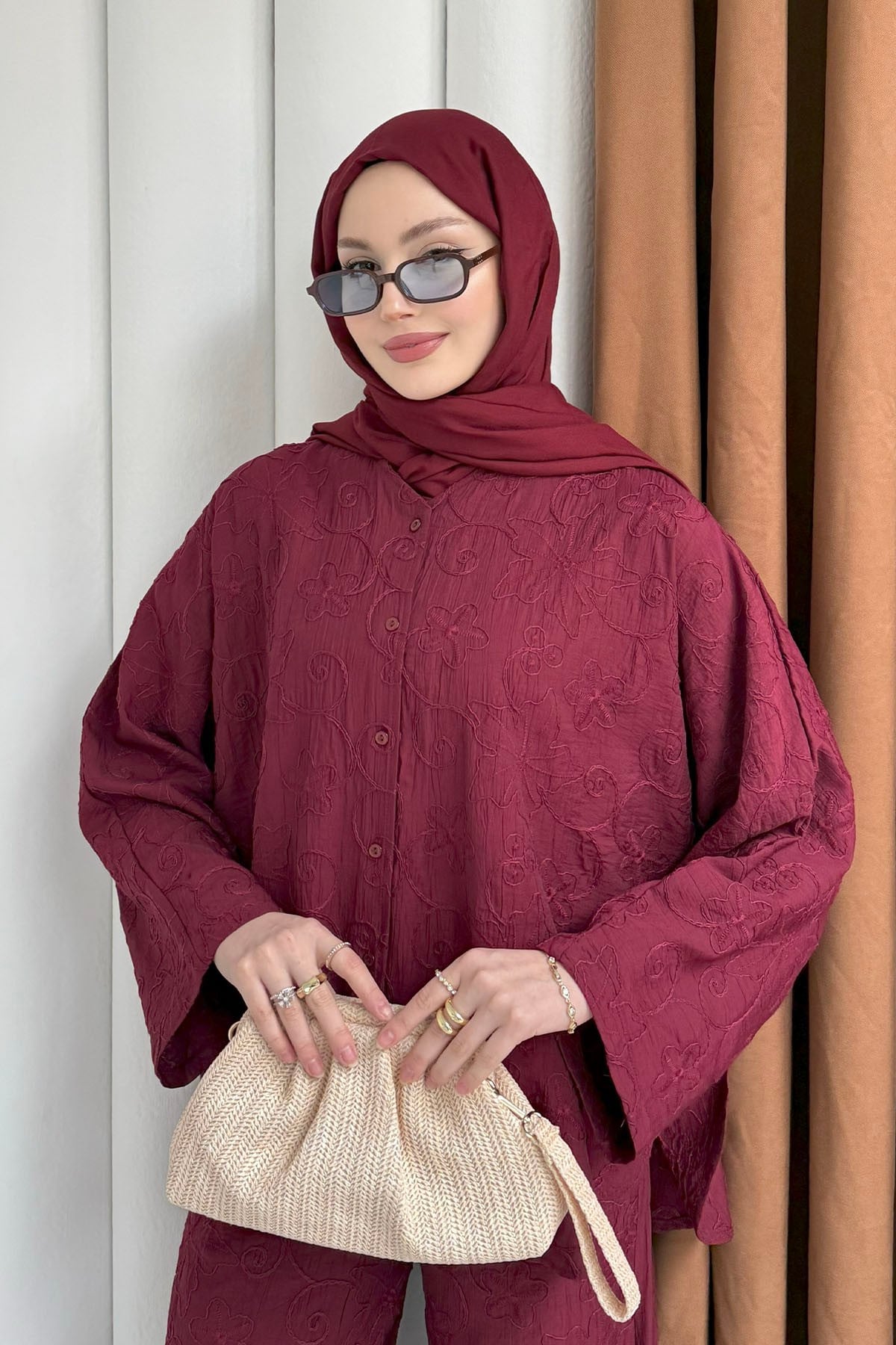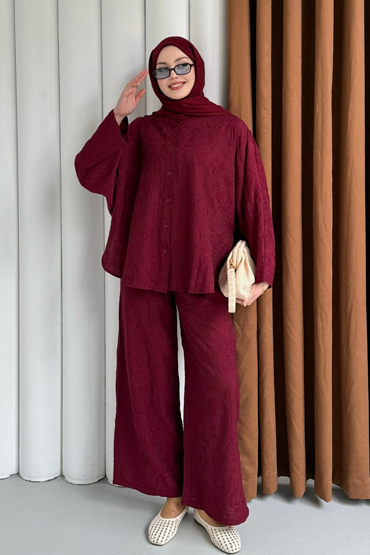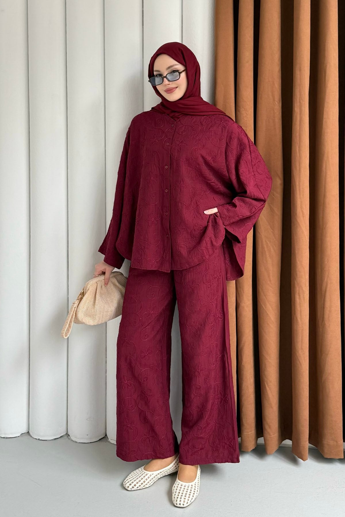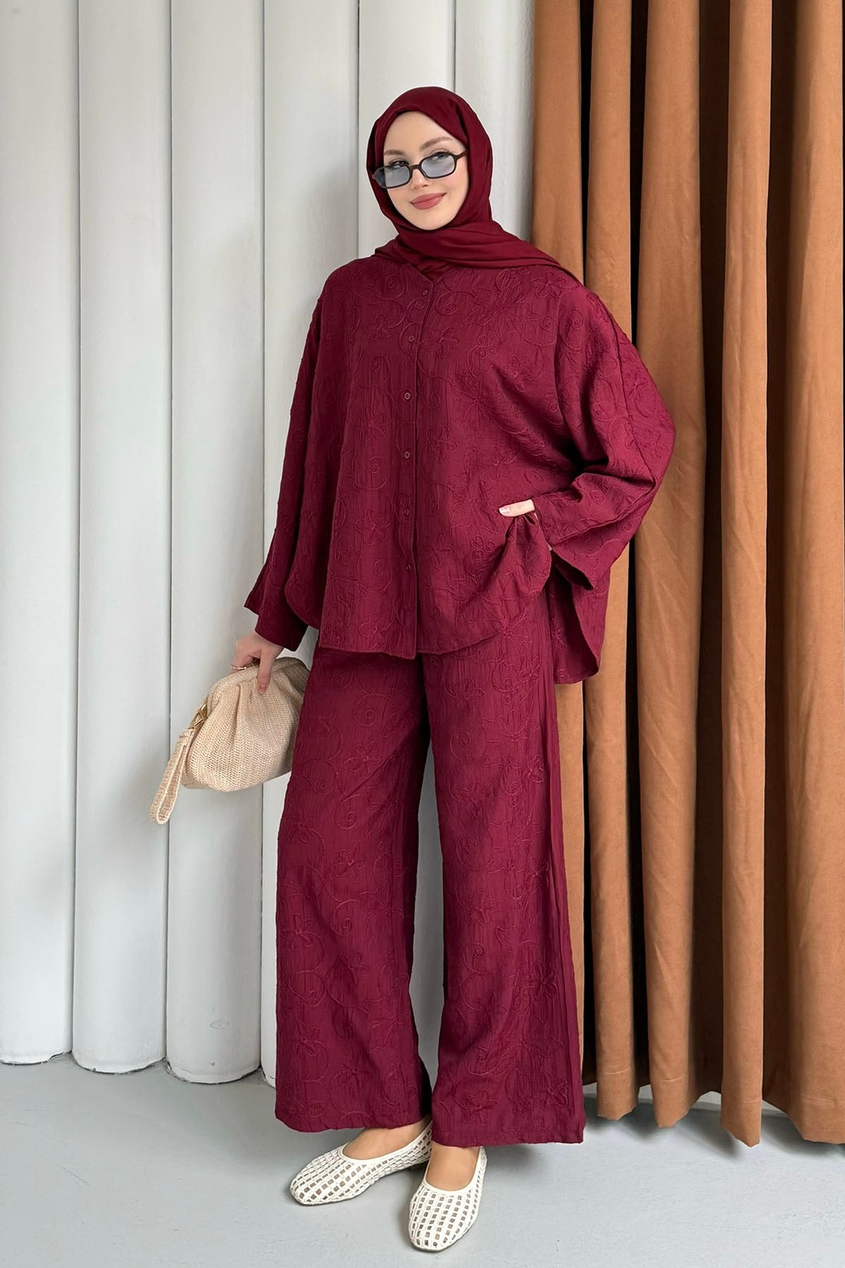 Kendinden Desenli Bel Lastikli Pantolon Tesettür Takım-BORDO (8988)