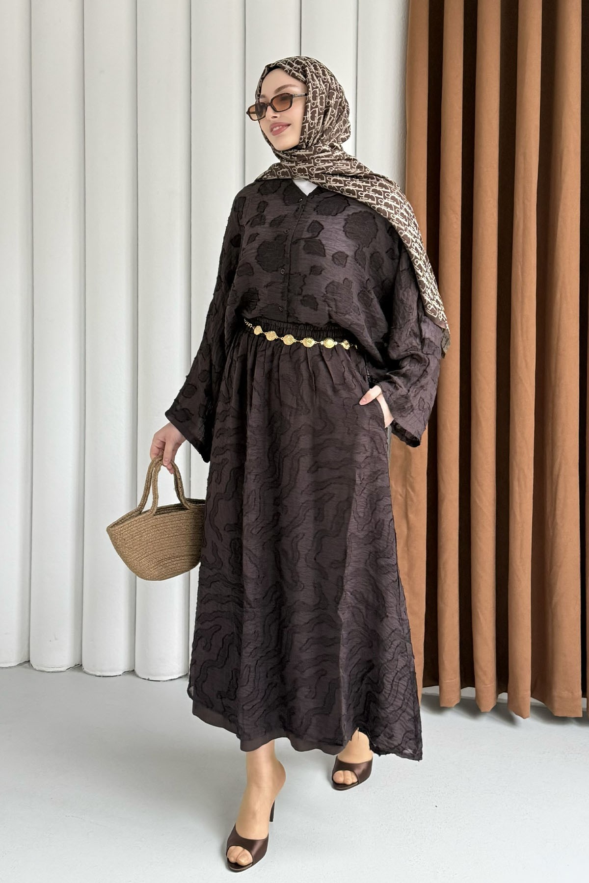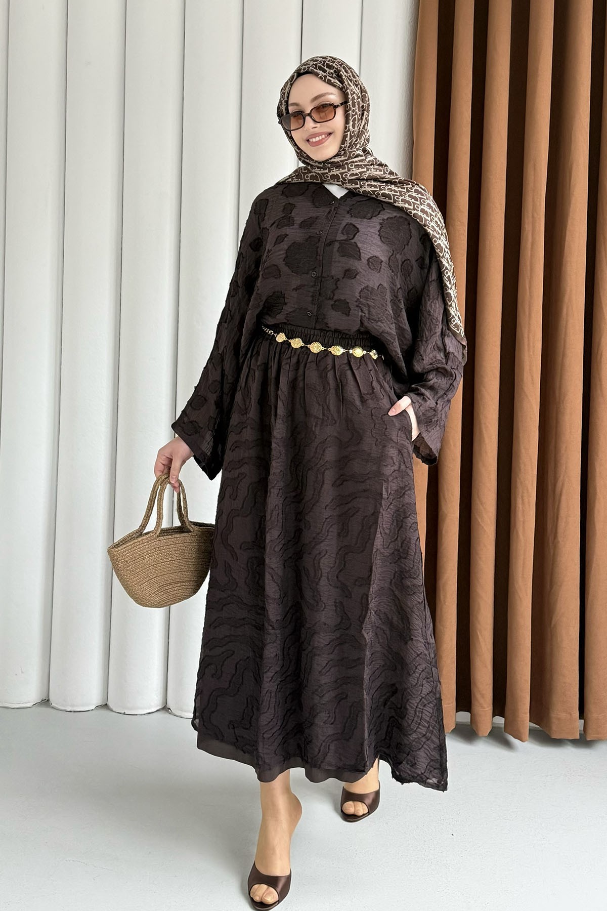 Kendinden Desenli Modal Kumaş Tesettür Takım-KAHVERENGİ (9012)