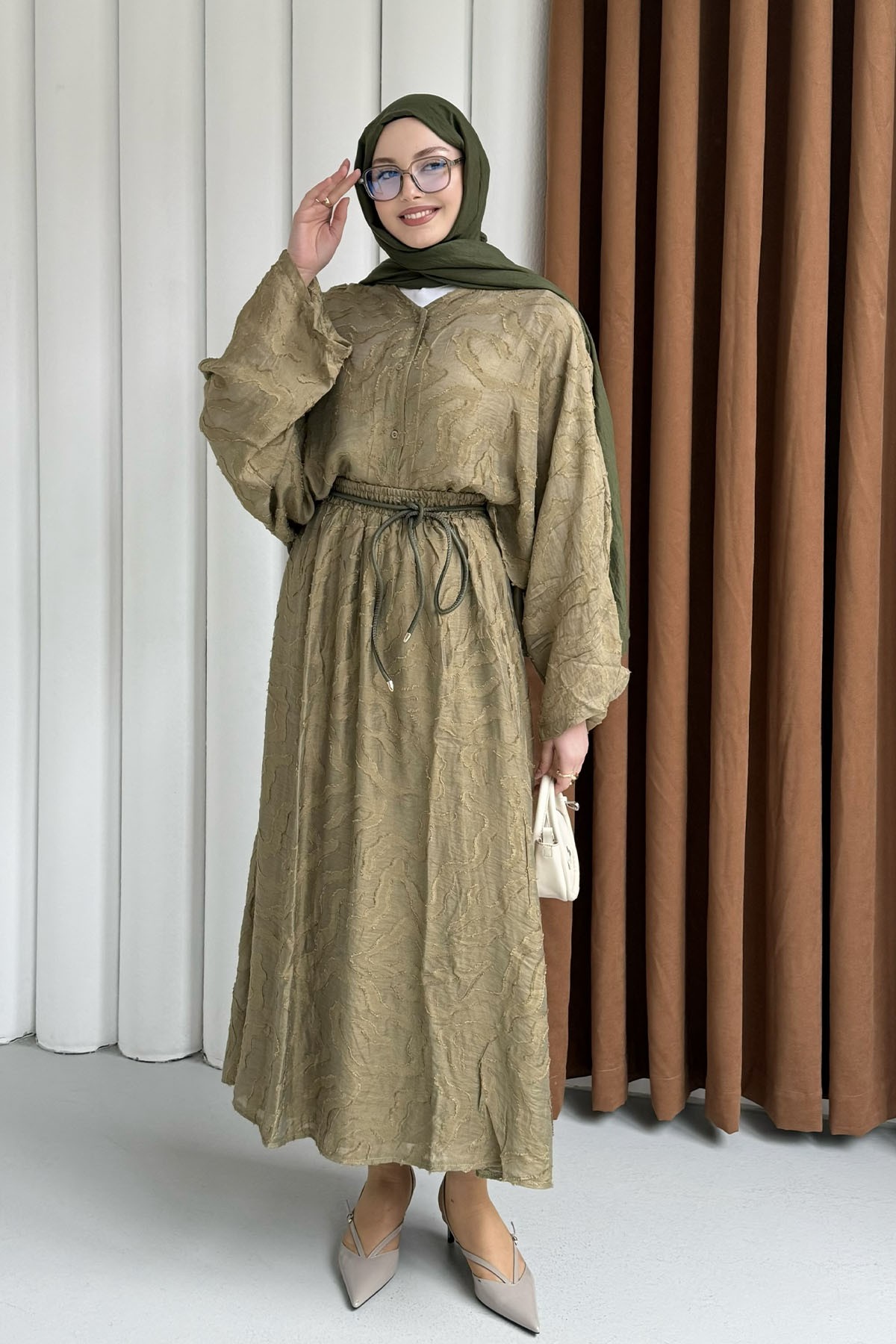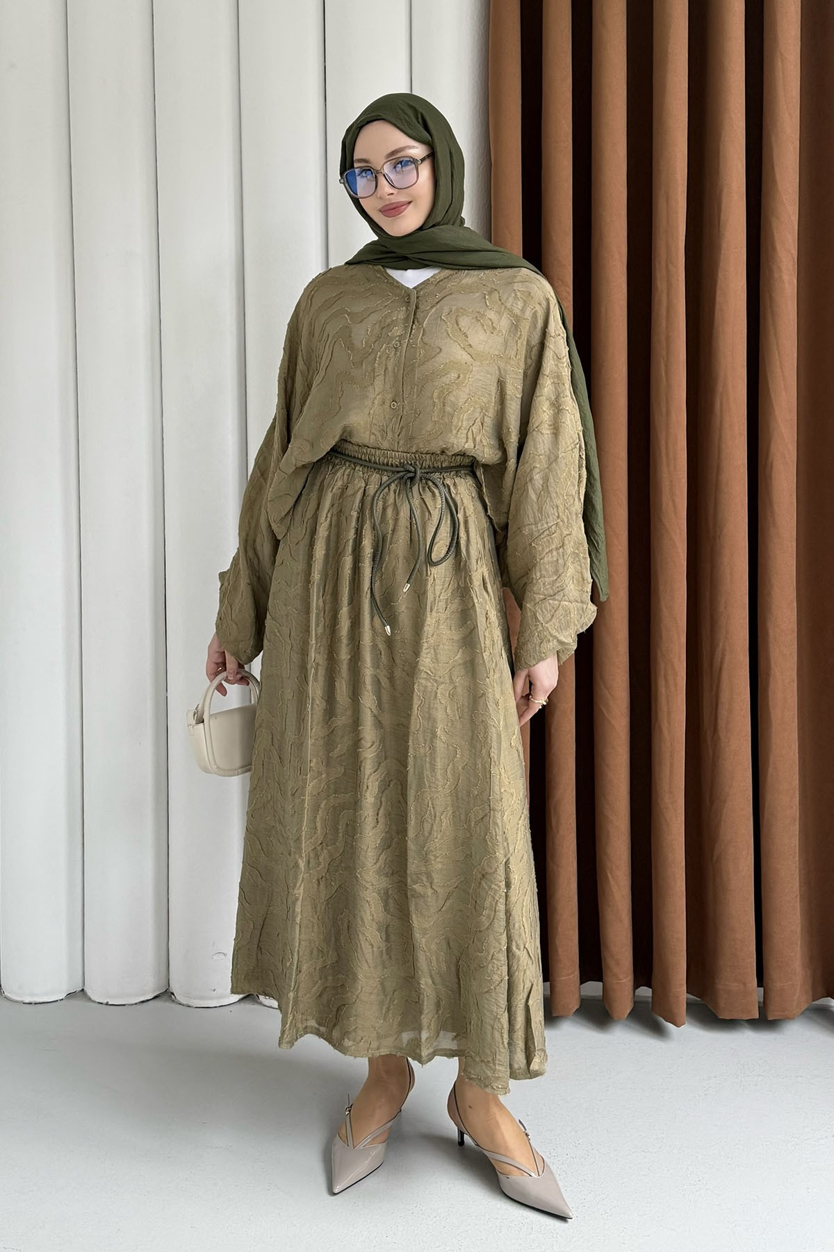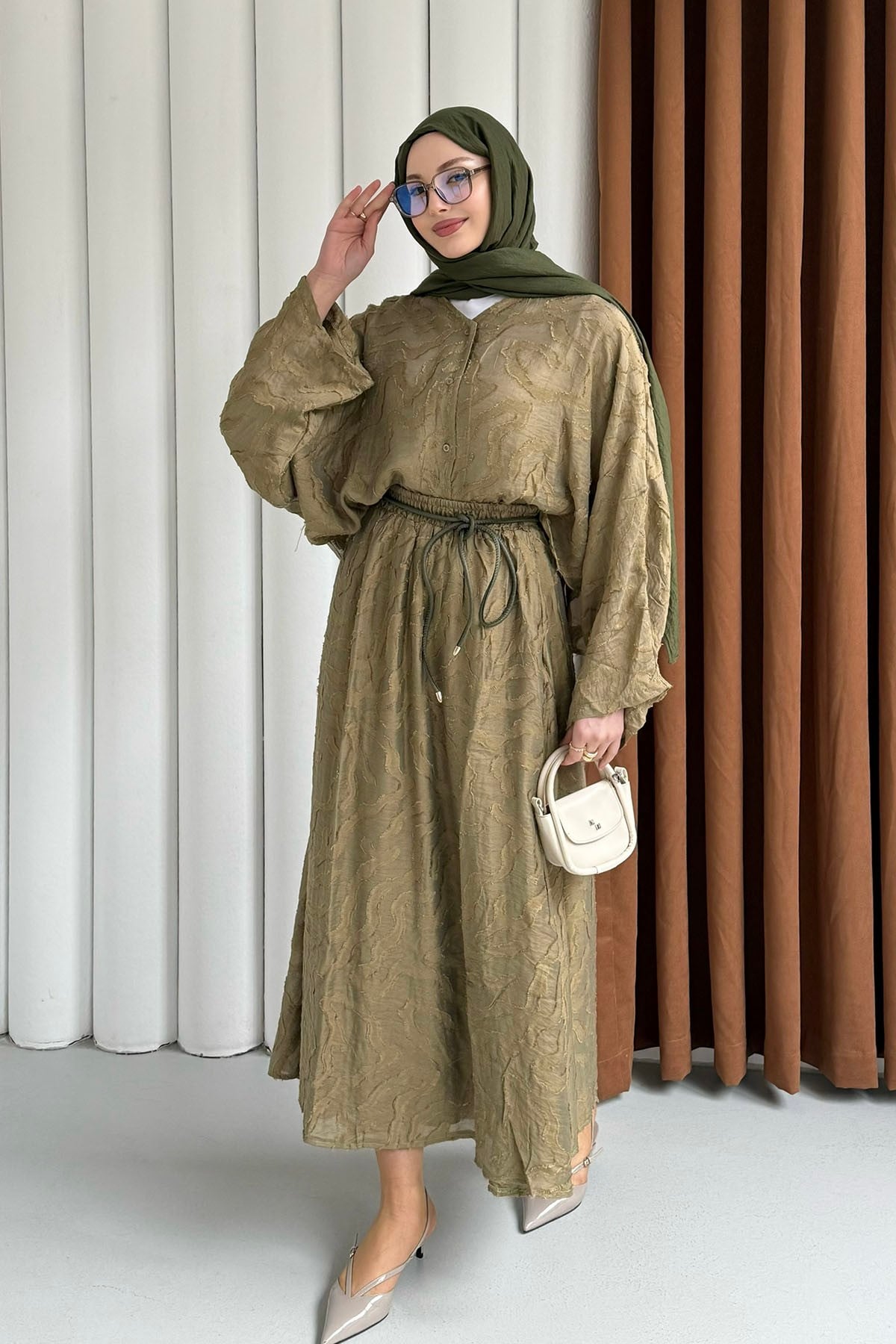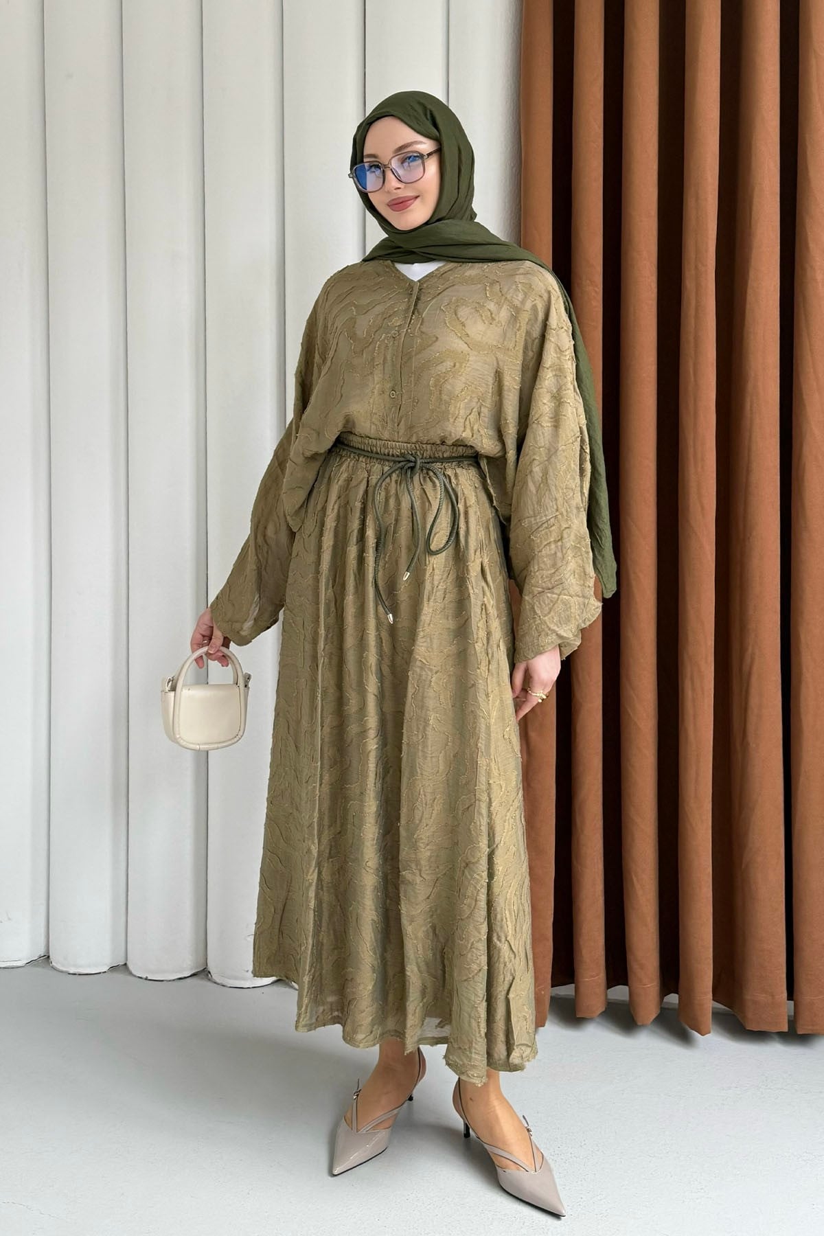 Kendinden Desenli Modal Kumaş Tesettür Takım-YEŞİL Kendinden Desenli Modal Kumaş Tesettür Takım-KAHVERENGİ Kendinden Desenli Modal Kumaş Tesettür Takım-BORDO