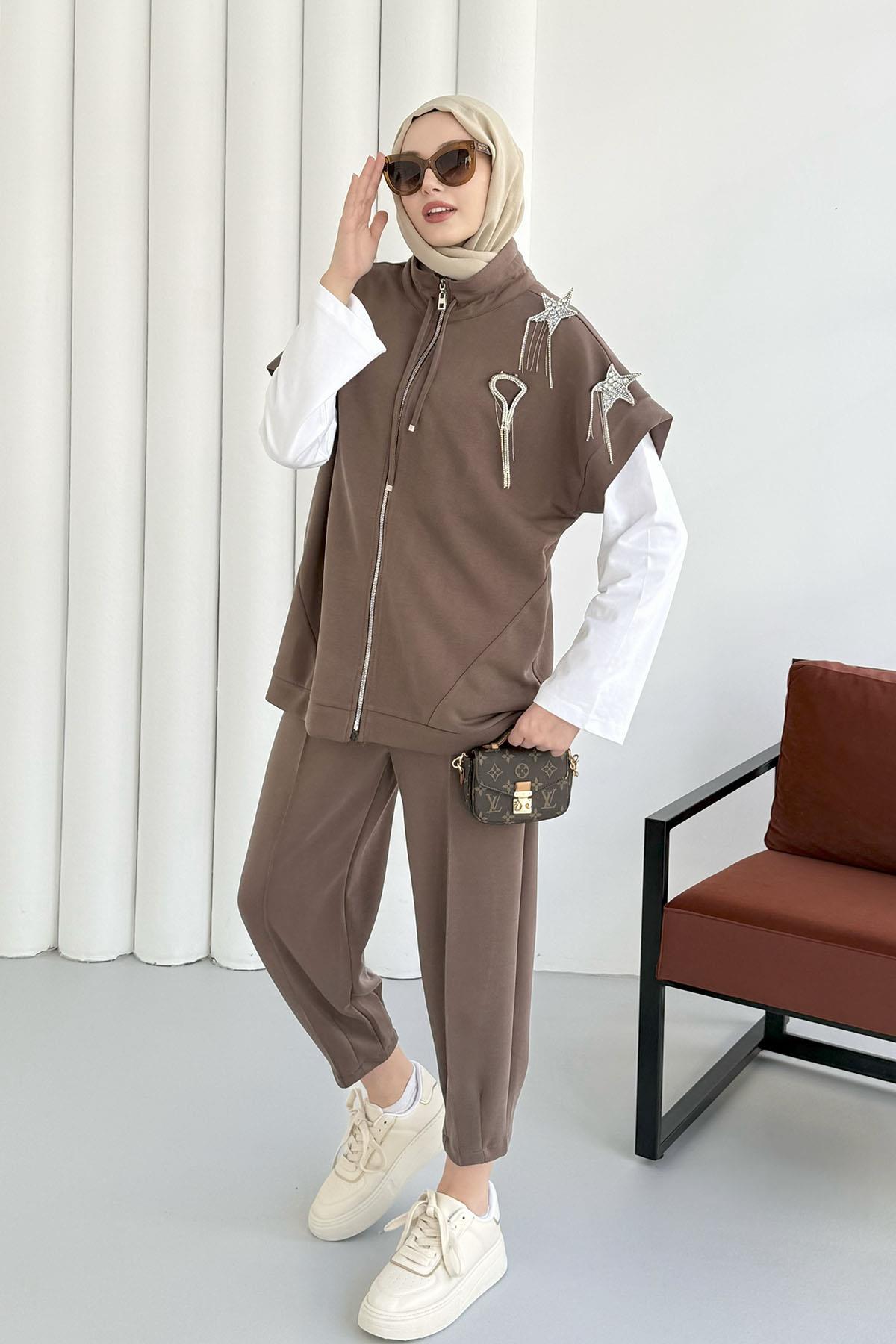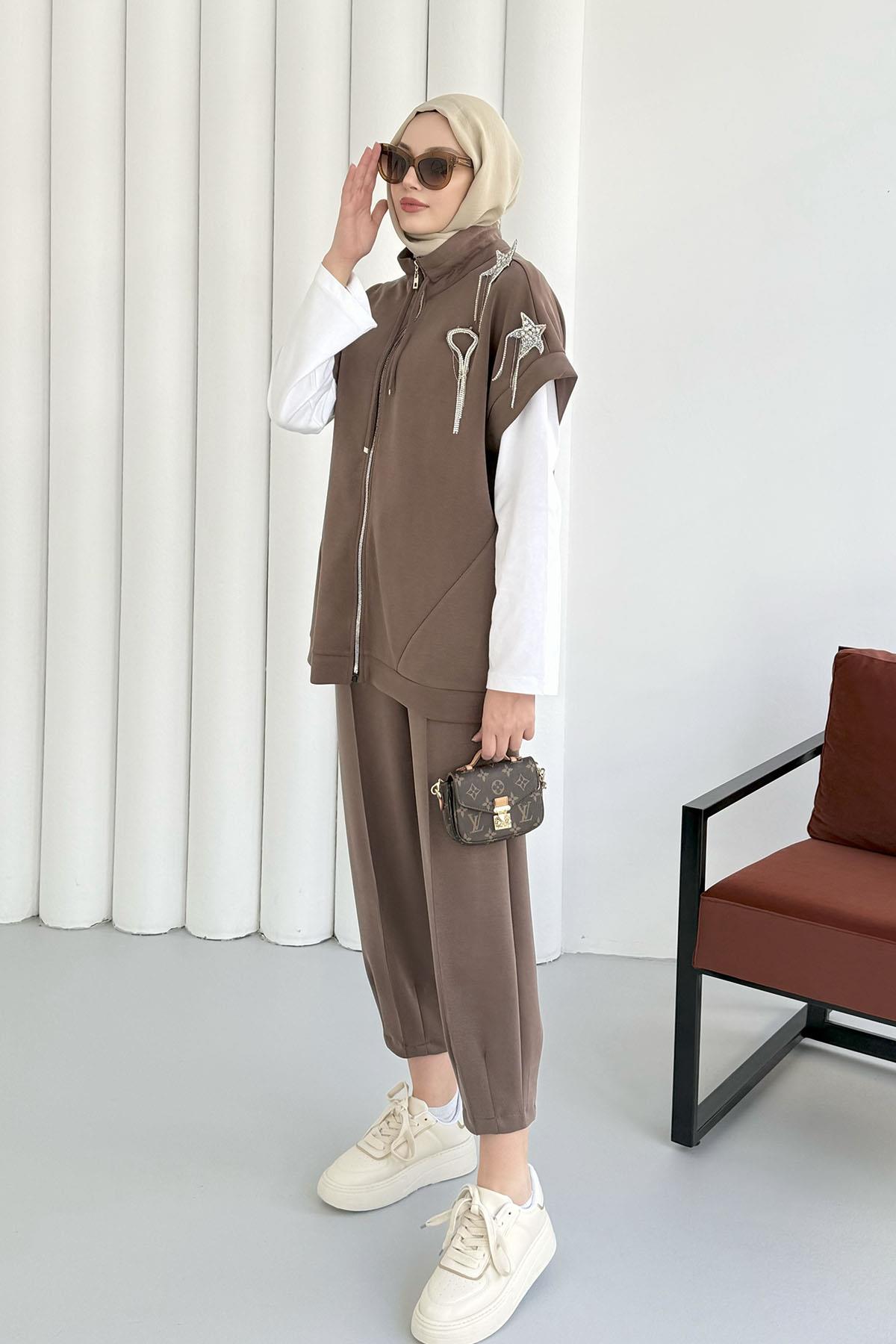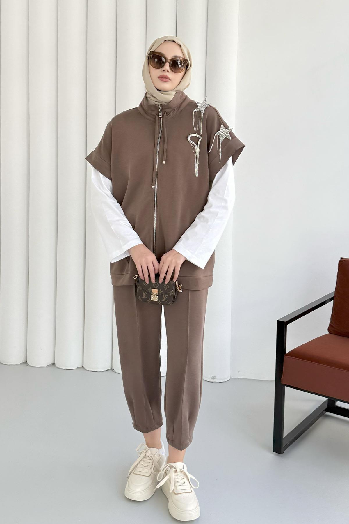 Kısa Kol Yıldız Aksesuarlı Bomber Yelek-KAHVERENGİ (24353)