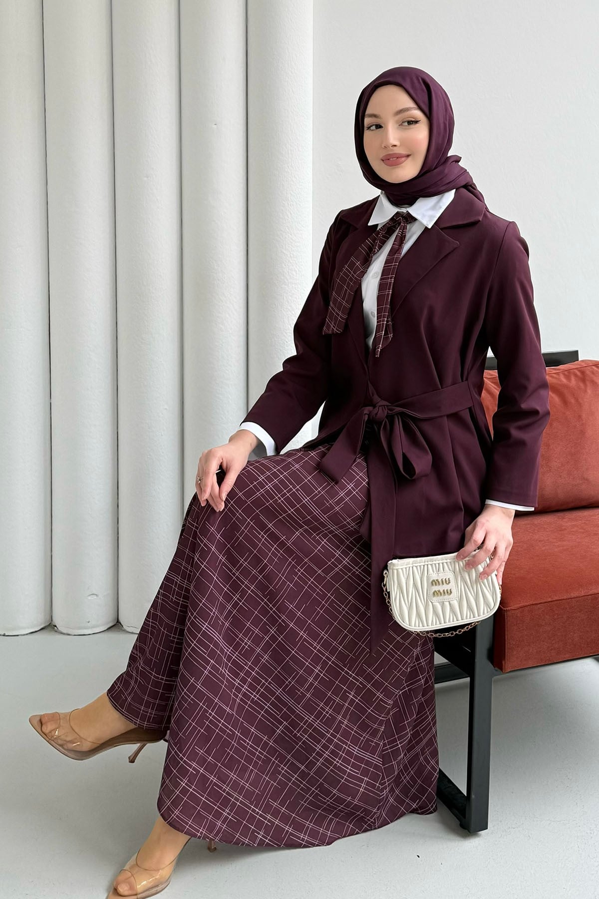 Kruvaze Yaka Ceket Etek Fularlı Tesettür Takım-BORDO (8717)