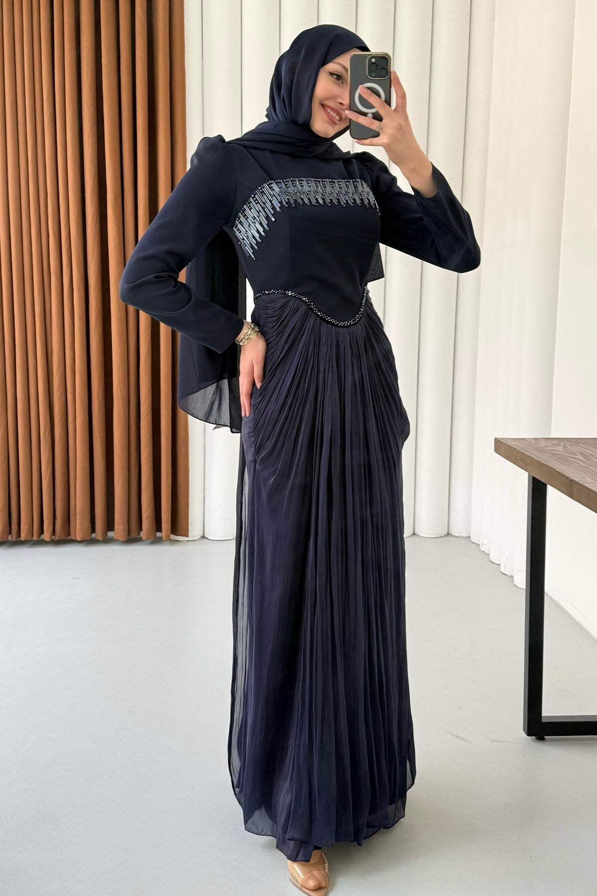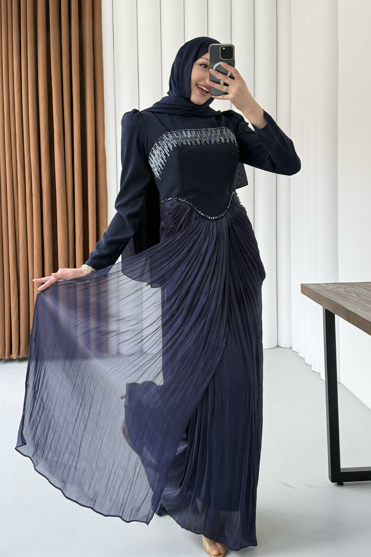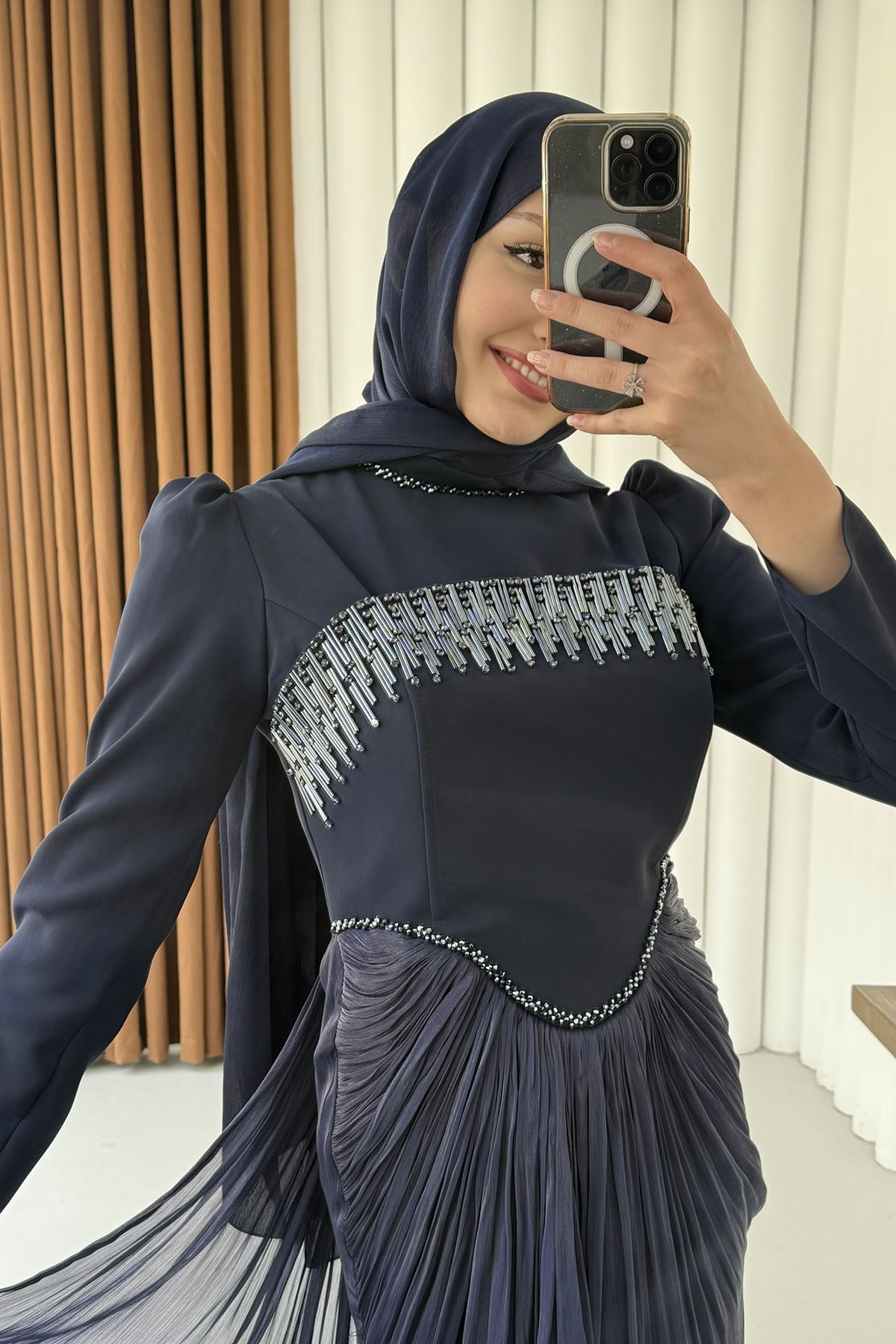 Lavin Premium Korseli Tesettür Abiye Elbise-LACİVERT (159)