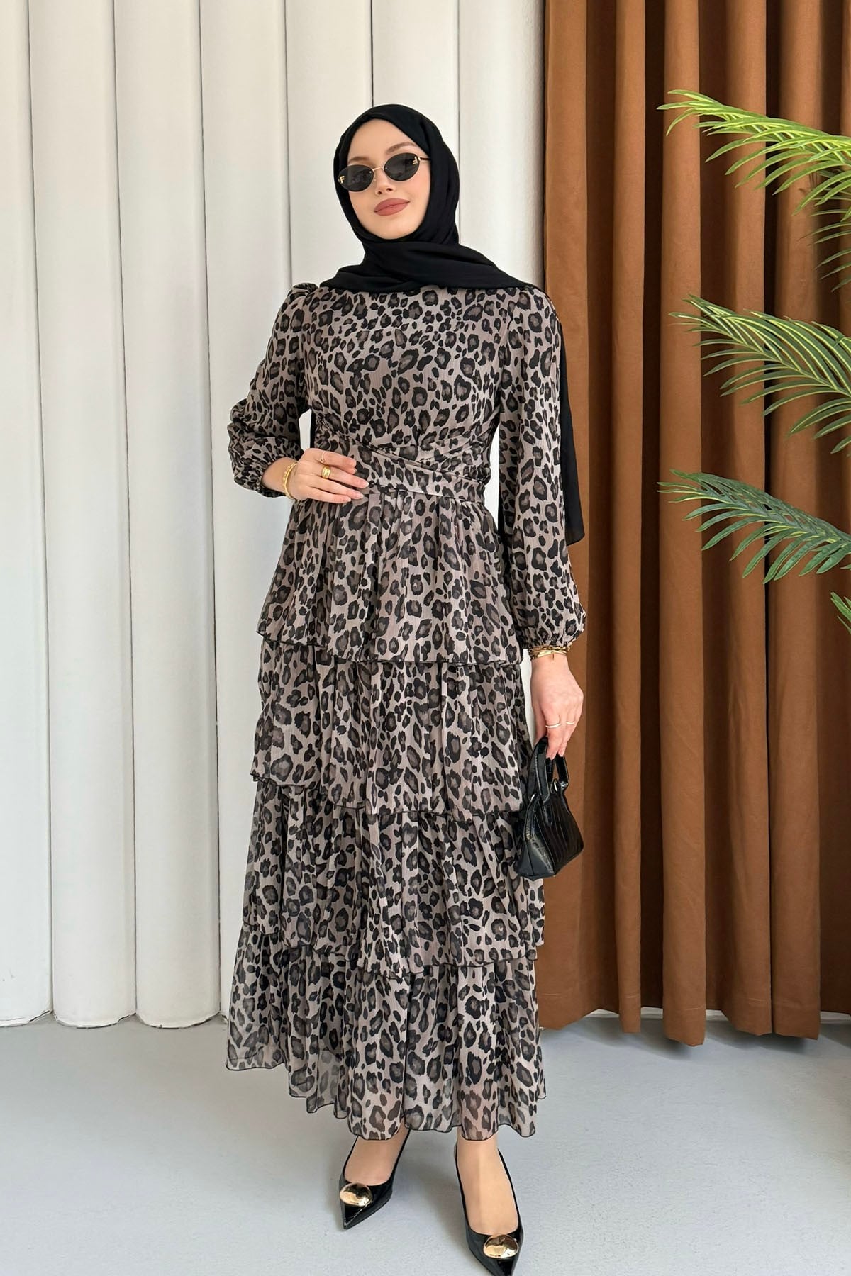 Leopar Volanlı Şifon Tesettür Elbise-KAHVERENGİ Leopar Volanlı Şifon Tesettür Elbise-TAŞ Leopar Volanlı Şifon Tesettür Elbise-BORDO