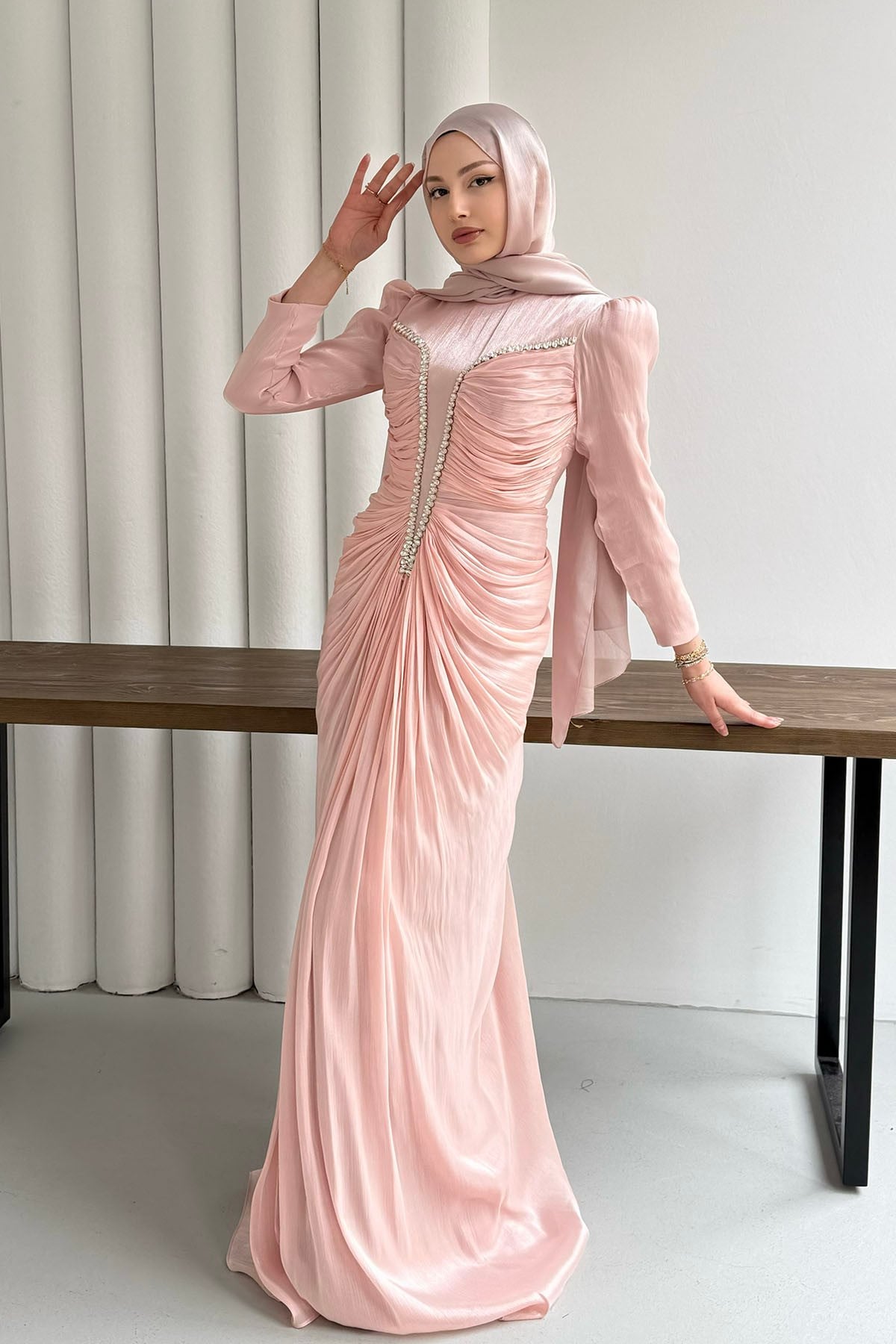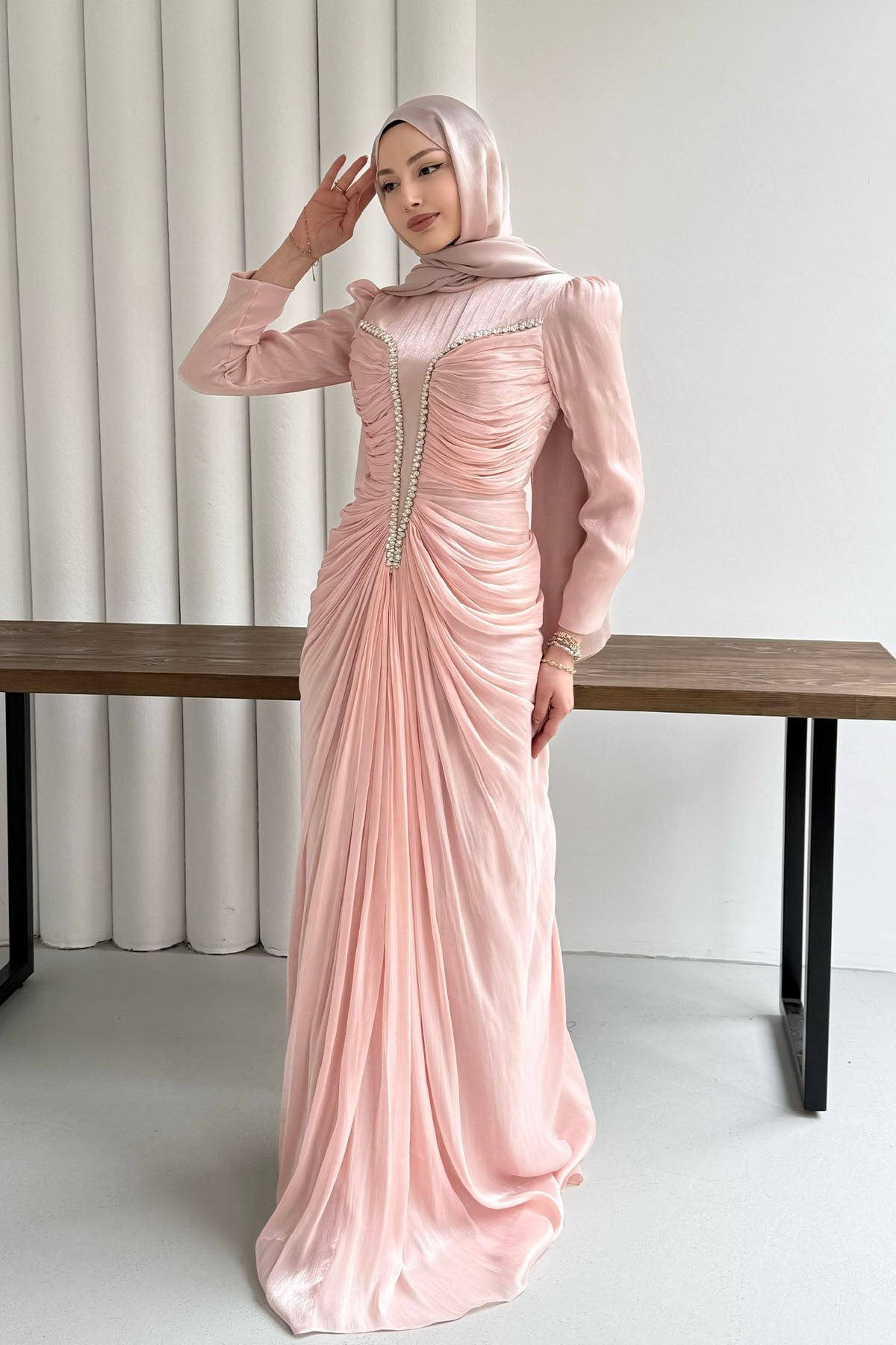 Luxe Ön Taş İşlemeli Tesettür Abiye-ŞEKER PEMBESİ (5201)