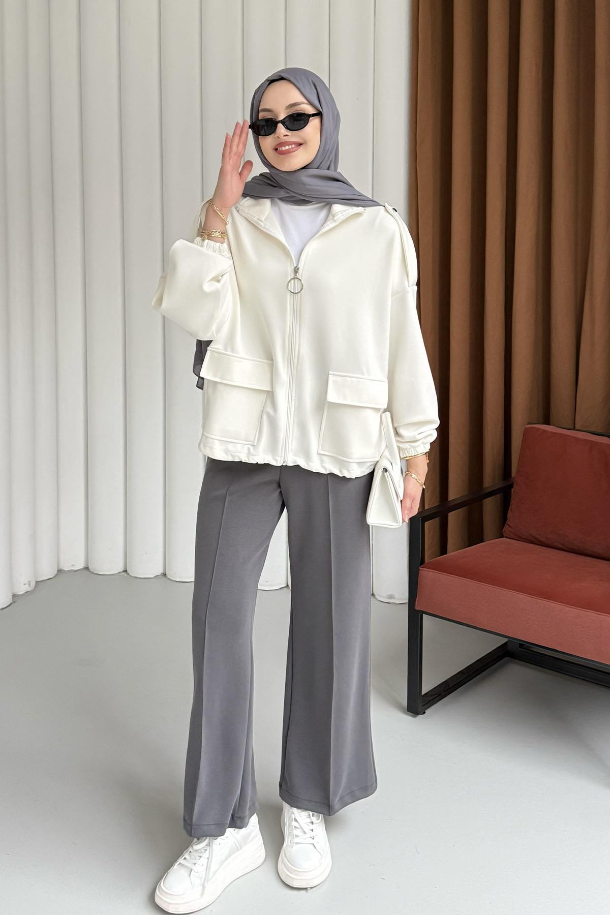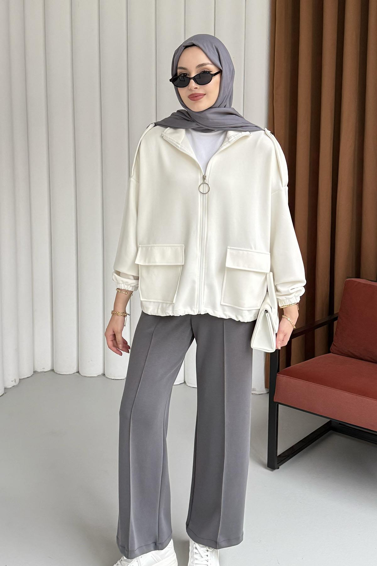 Modal Kumaş Önden Fermuarlı Ceket-EKRU (24354)