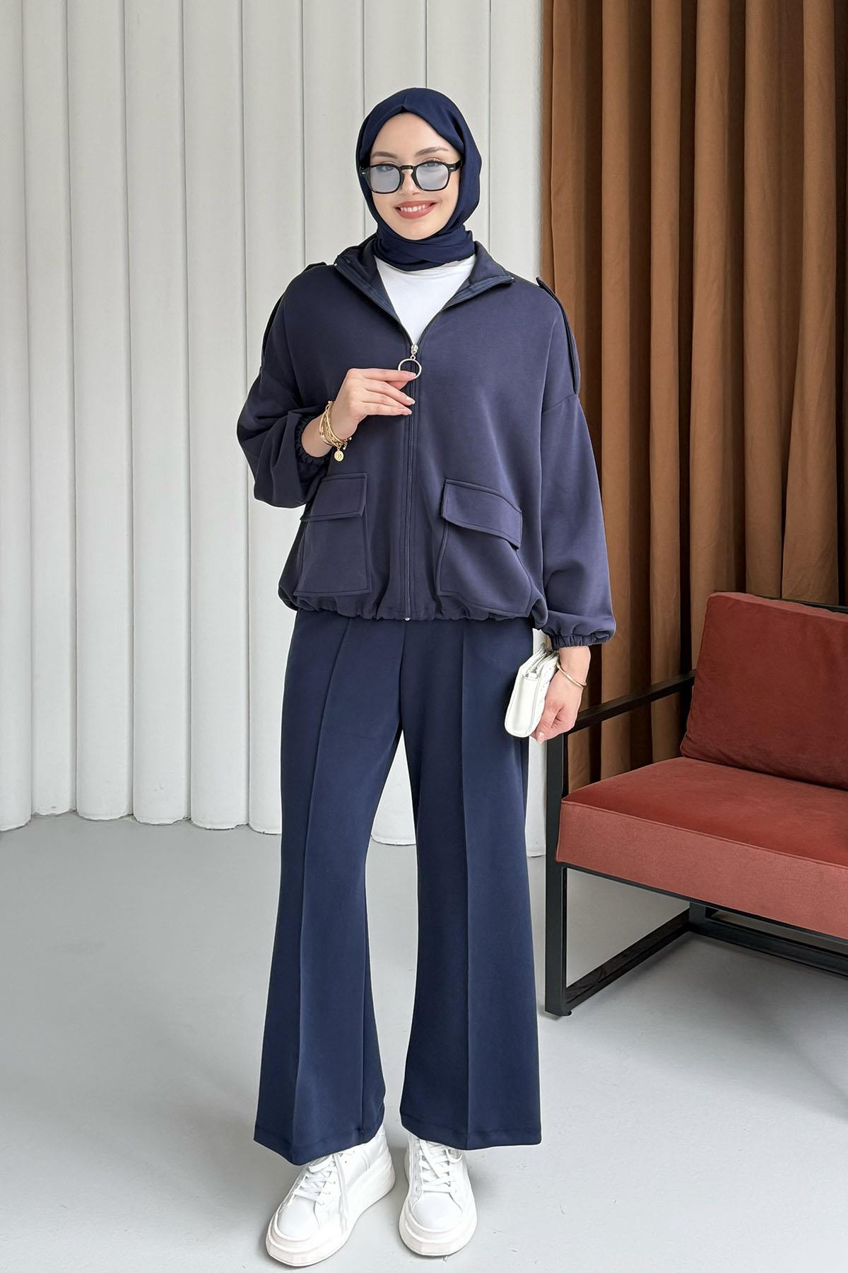 Modal Kumaş Önden Fermuarlı Ceket-LACİVERT (24354)