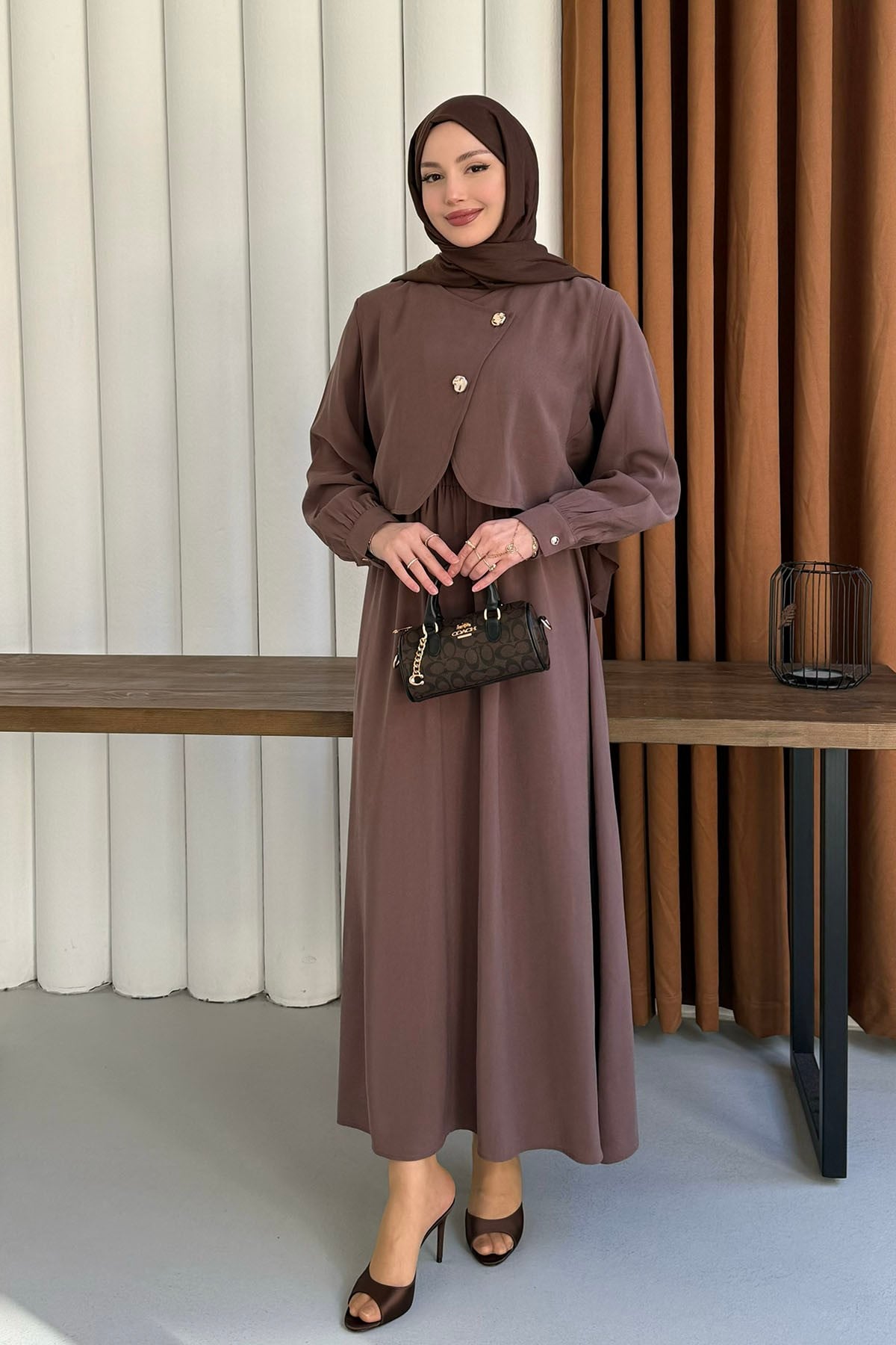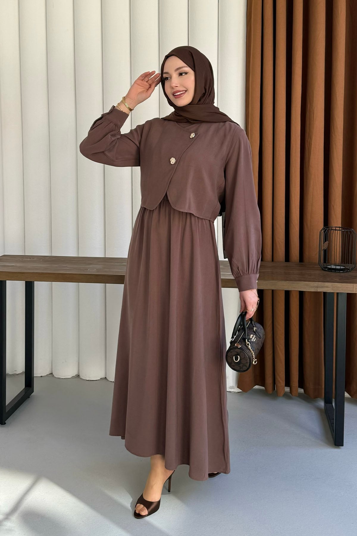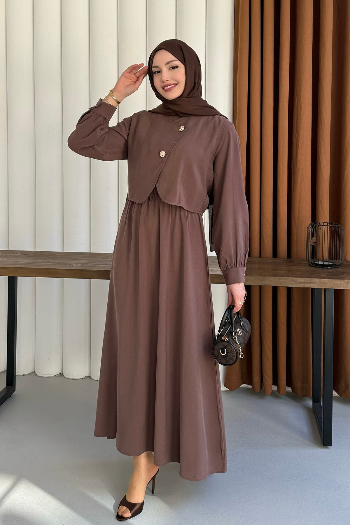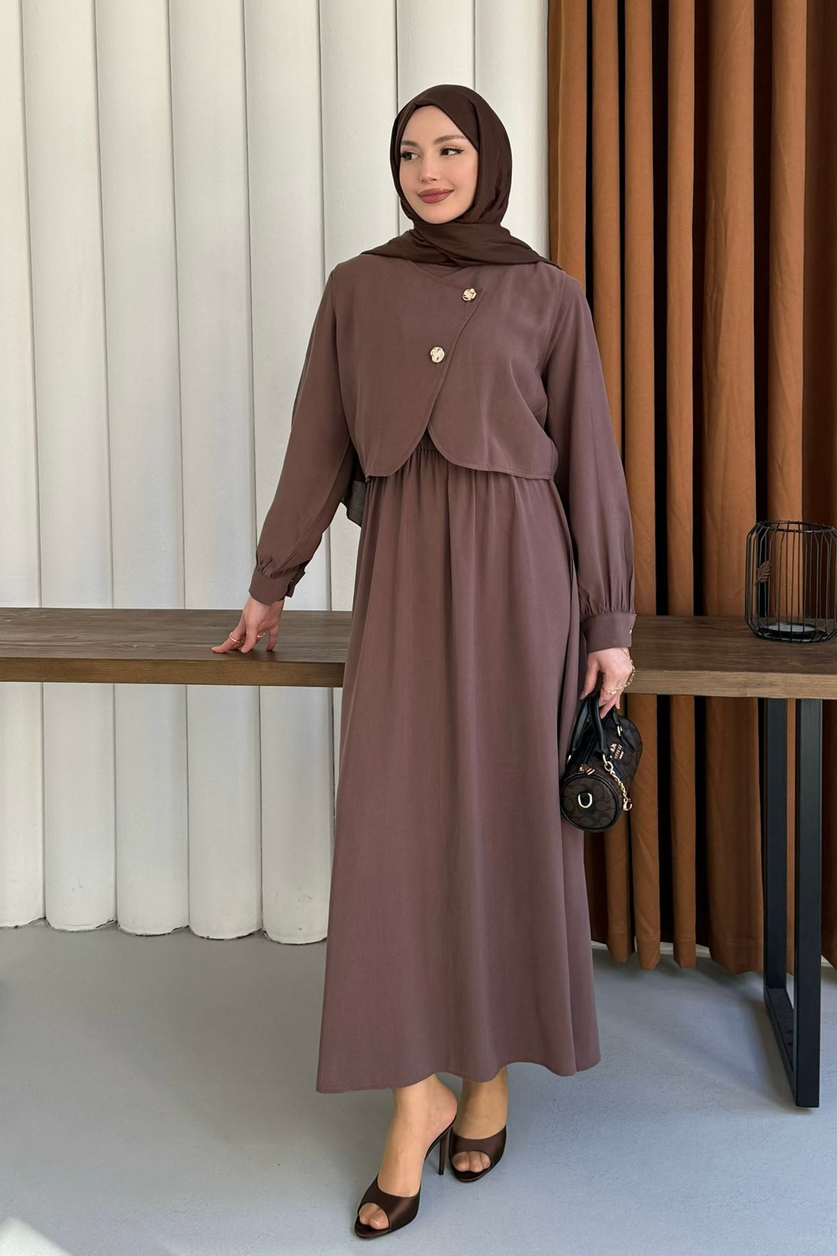Mono Beli Lastikli Yelek Detaylı Tesettür Elbise-KAHVERENGİ (8984)