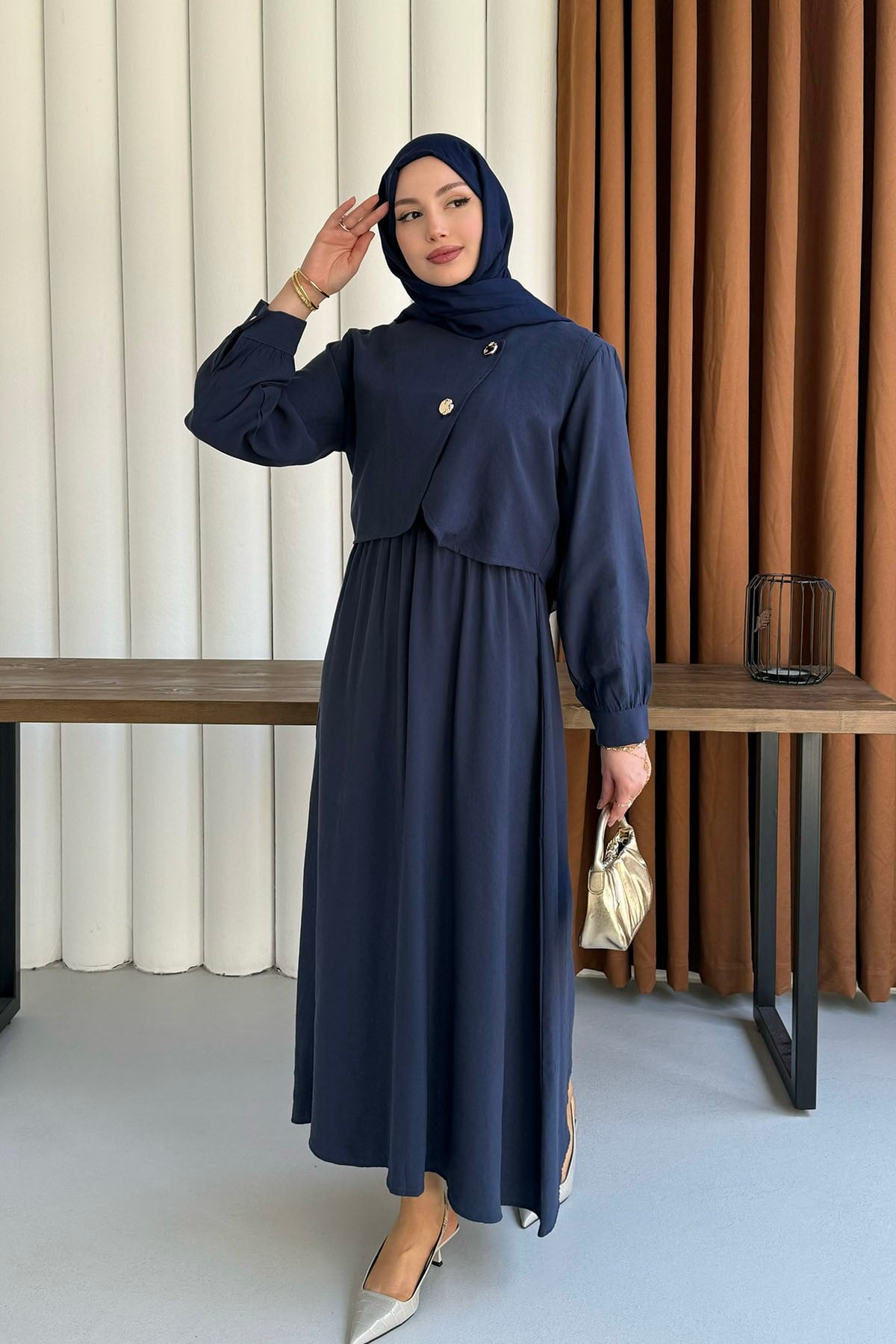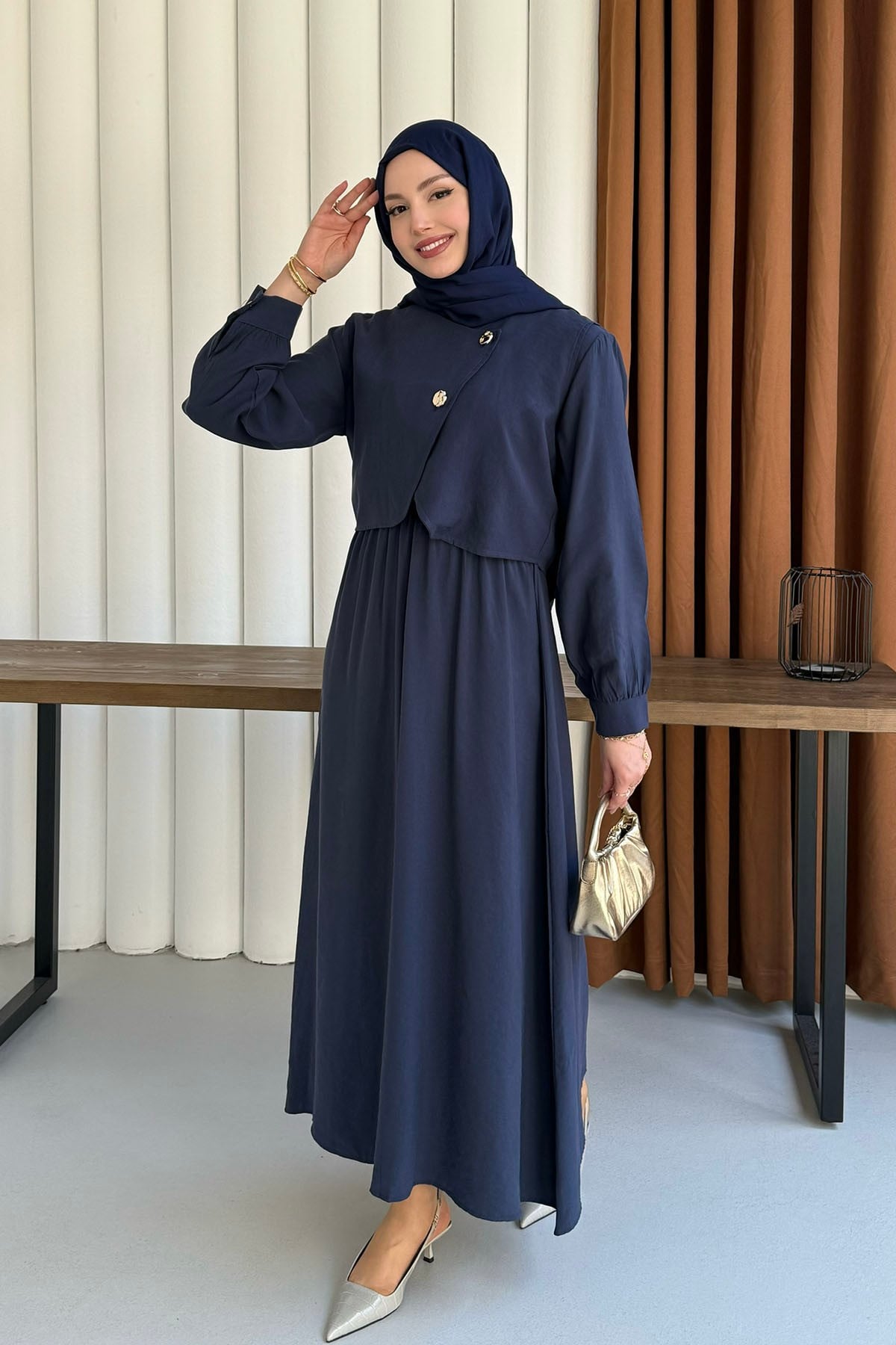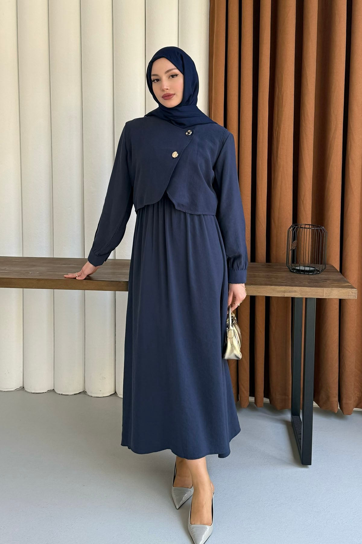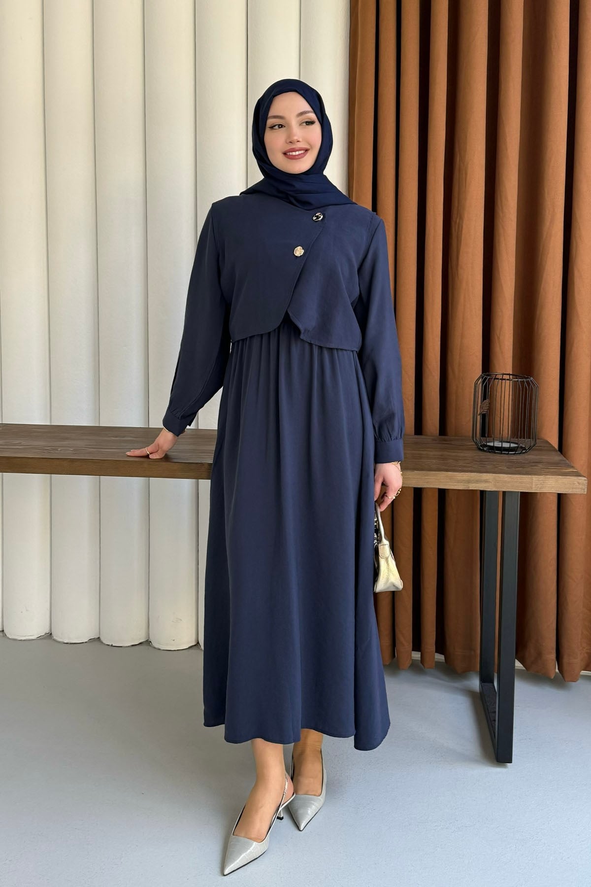 Mono Beli Lastikli Yelek Detaylı Tesettür Elbise-LACİVERT (8984)