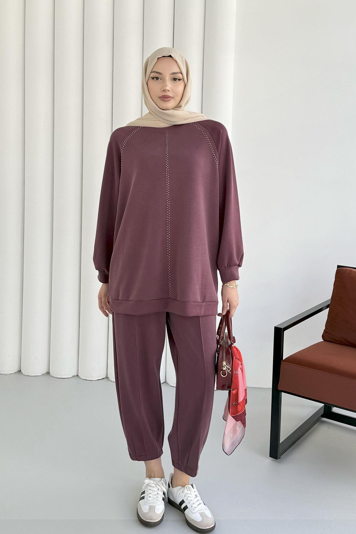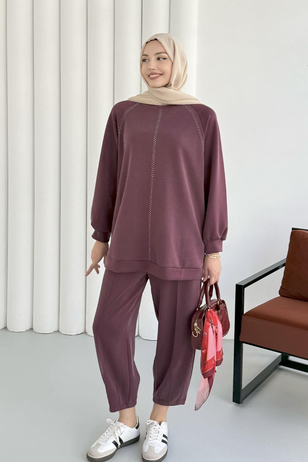 Nakış İşlemeli Oysho Kumaş Pantolonlu Tesettür Takım-BORDO (22766)