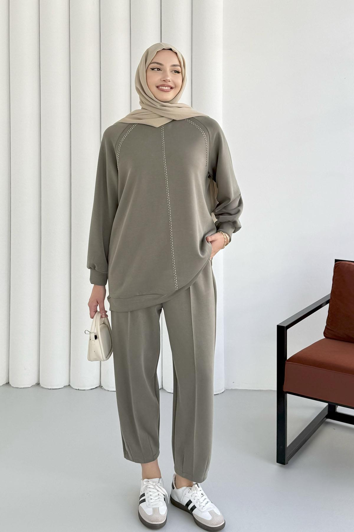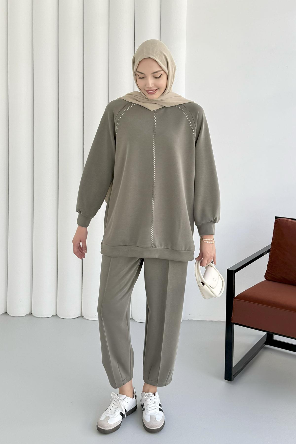 Nakış İşlemeli Oysho Kumaş Pantolonlu Tesettür Takım-MİNT YEŞİLİ (22766)
