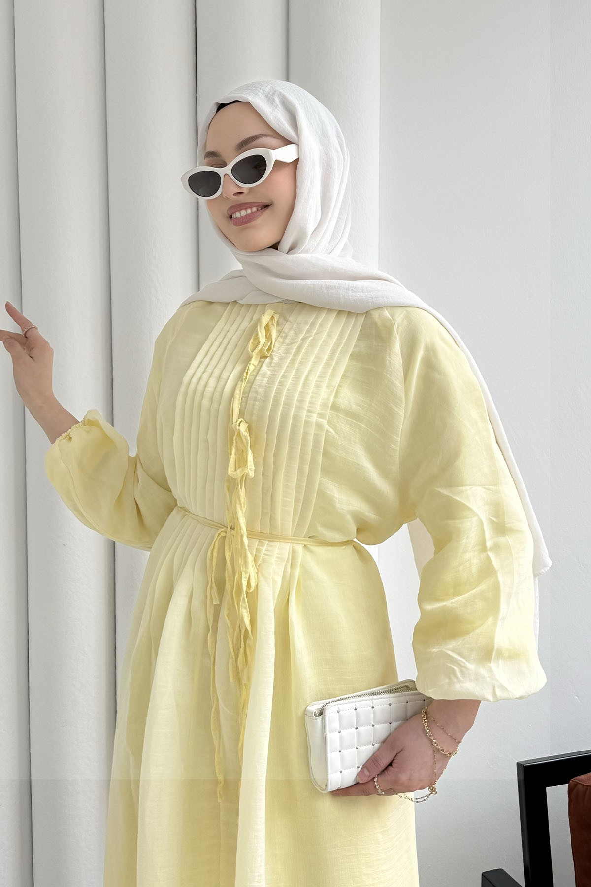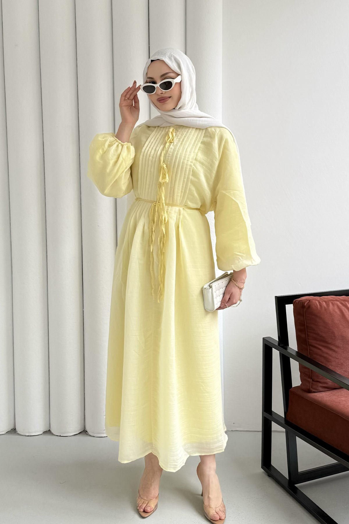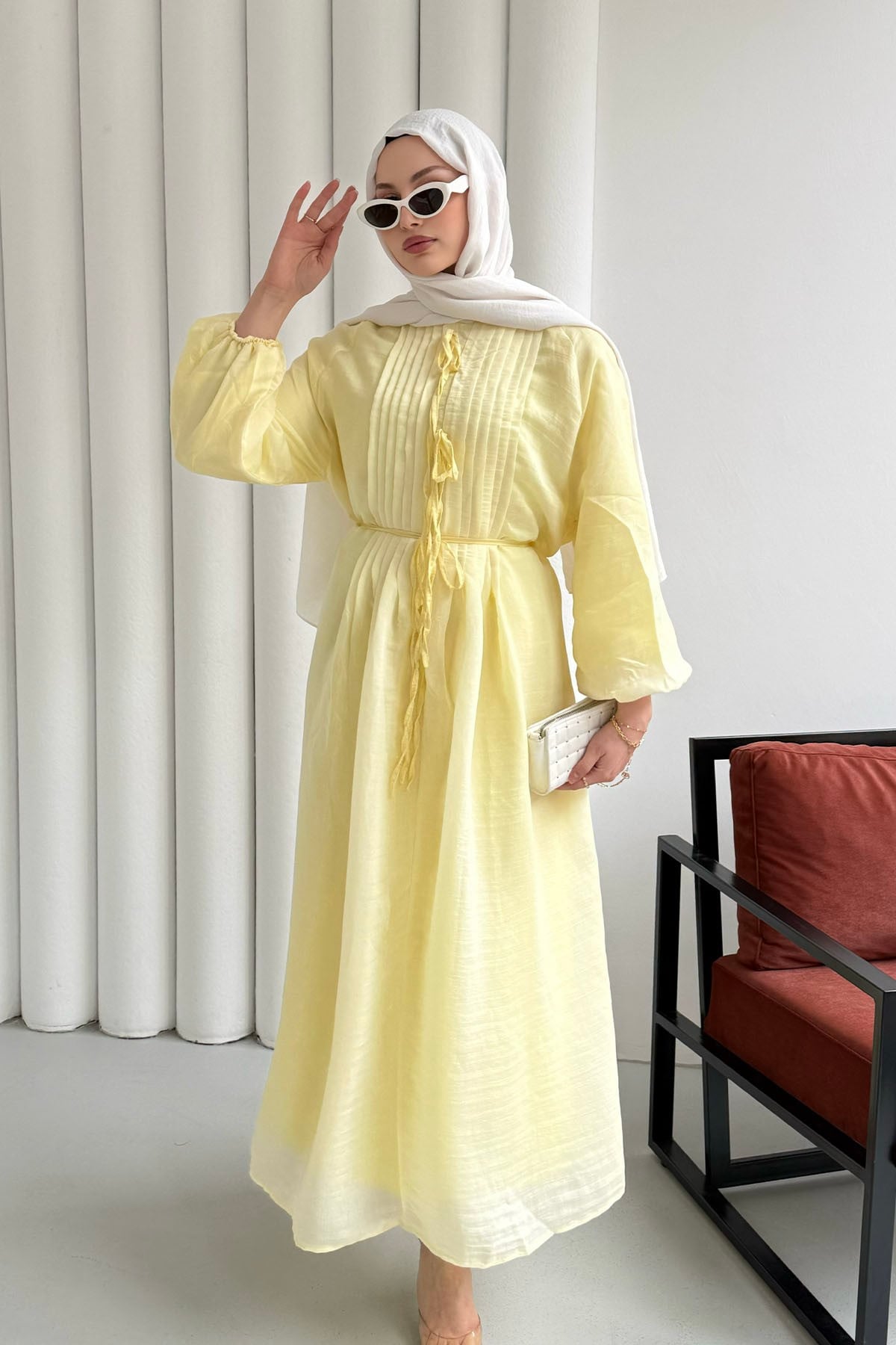 Nervür Dikişli Biye Kemerli Tesettür Elbise-SARI (51539)