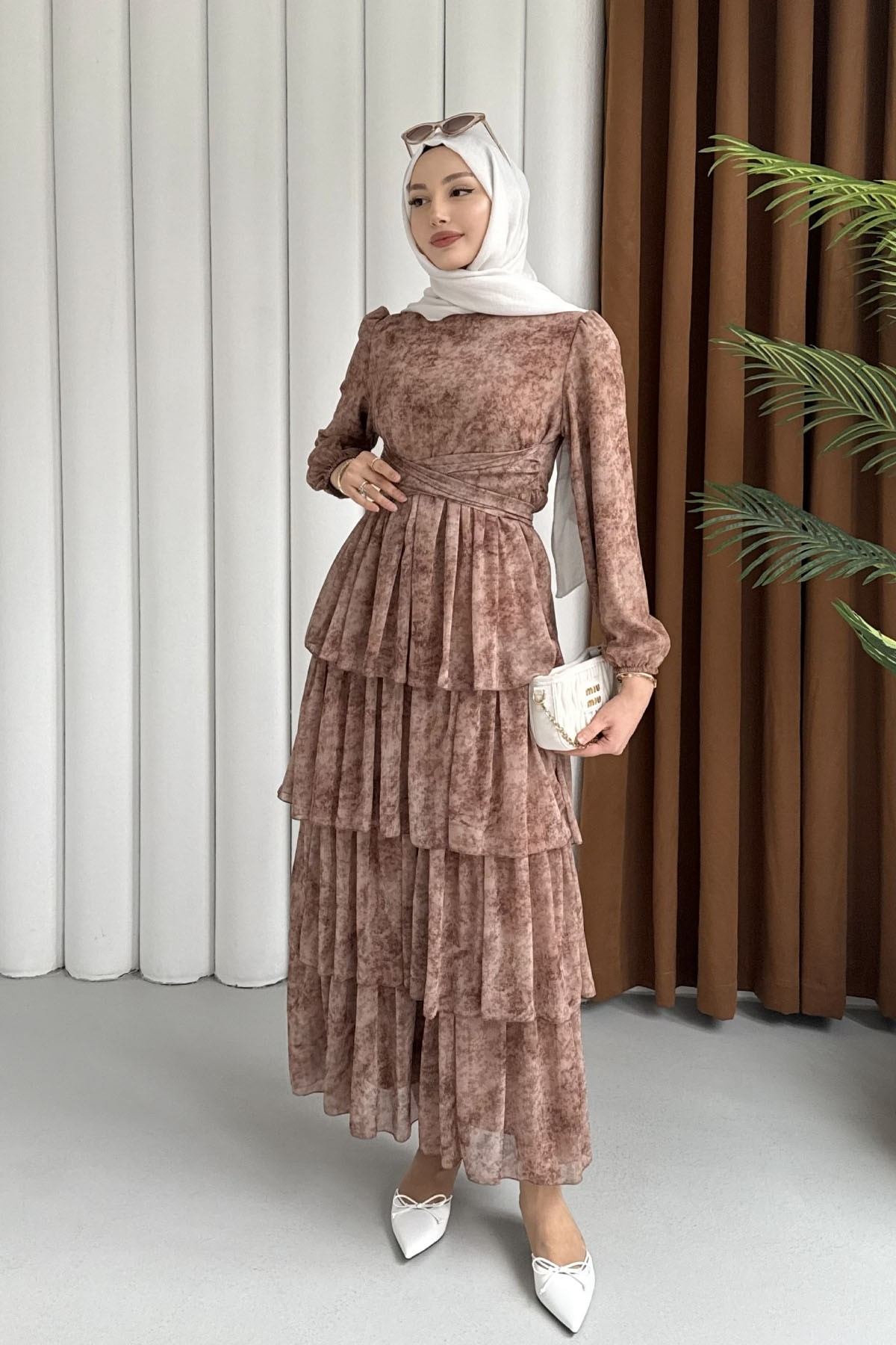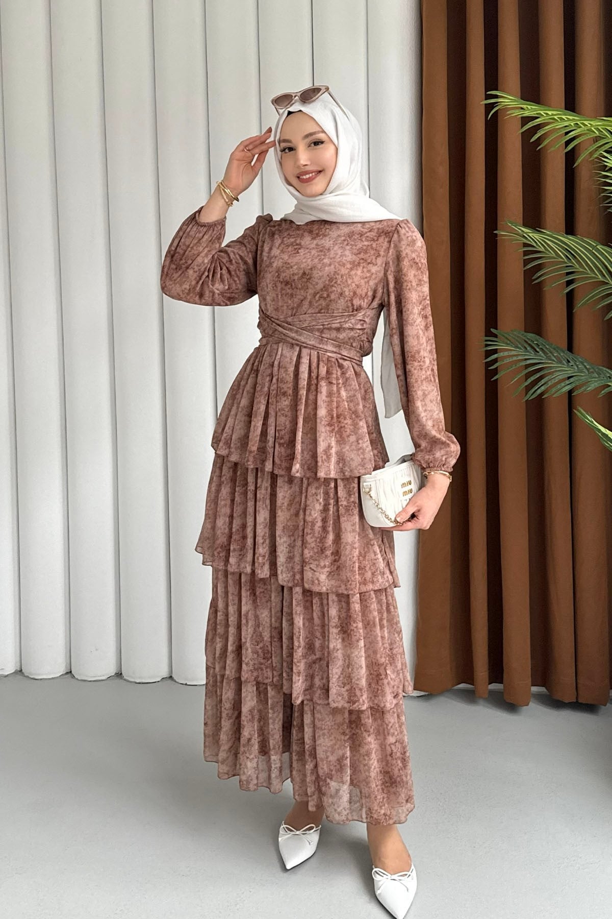 Neva Otantik Motifli Şifon Tesettür Elbise-TOPRAK (5981)