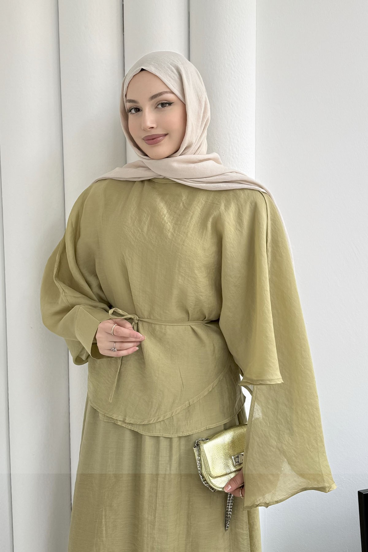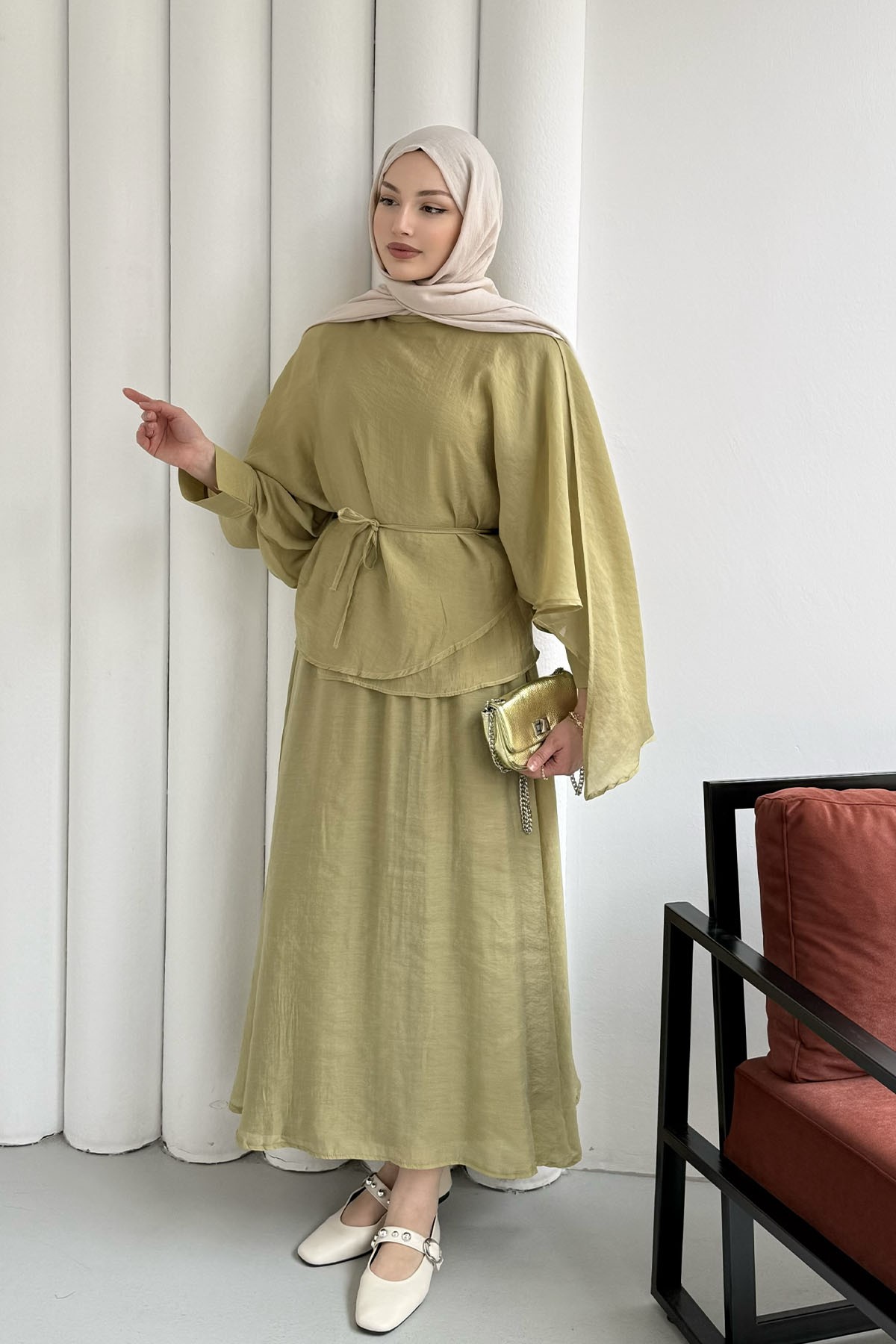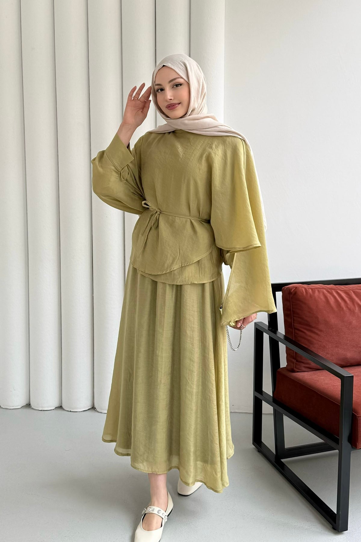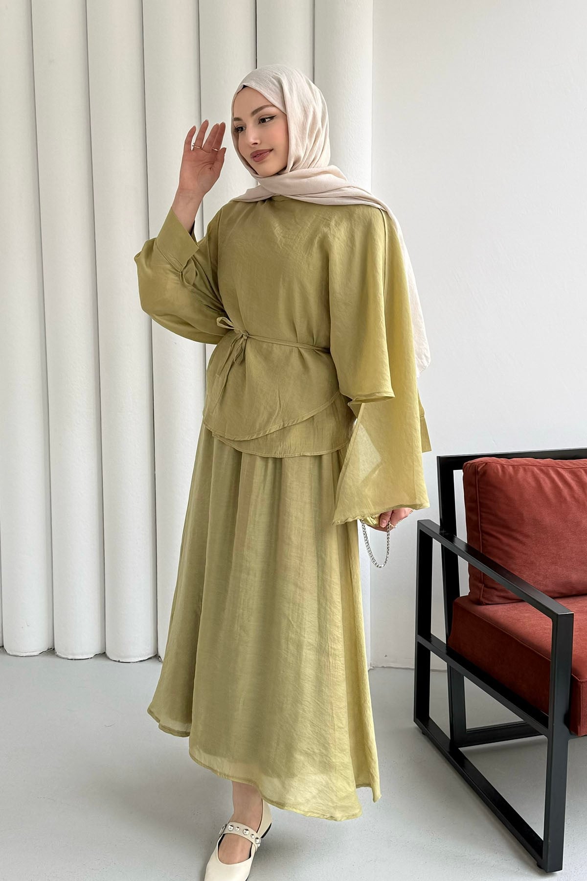 Omuzdan Şallı Biye Kemerli Etekli Tesettür Takım-YEŞİL (9040)