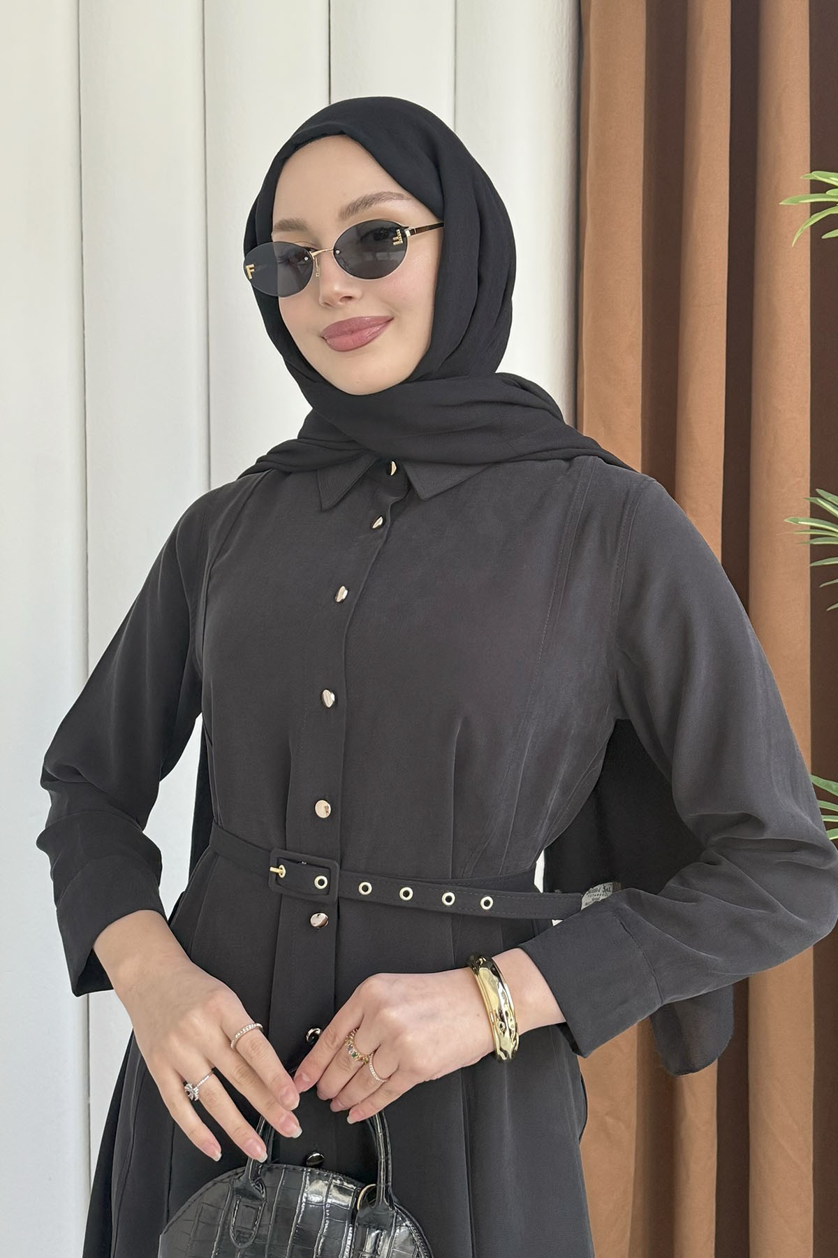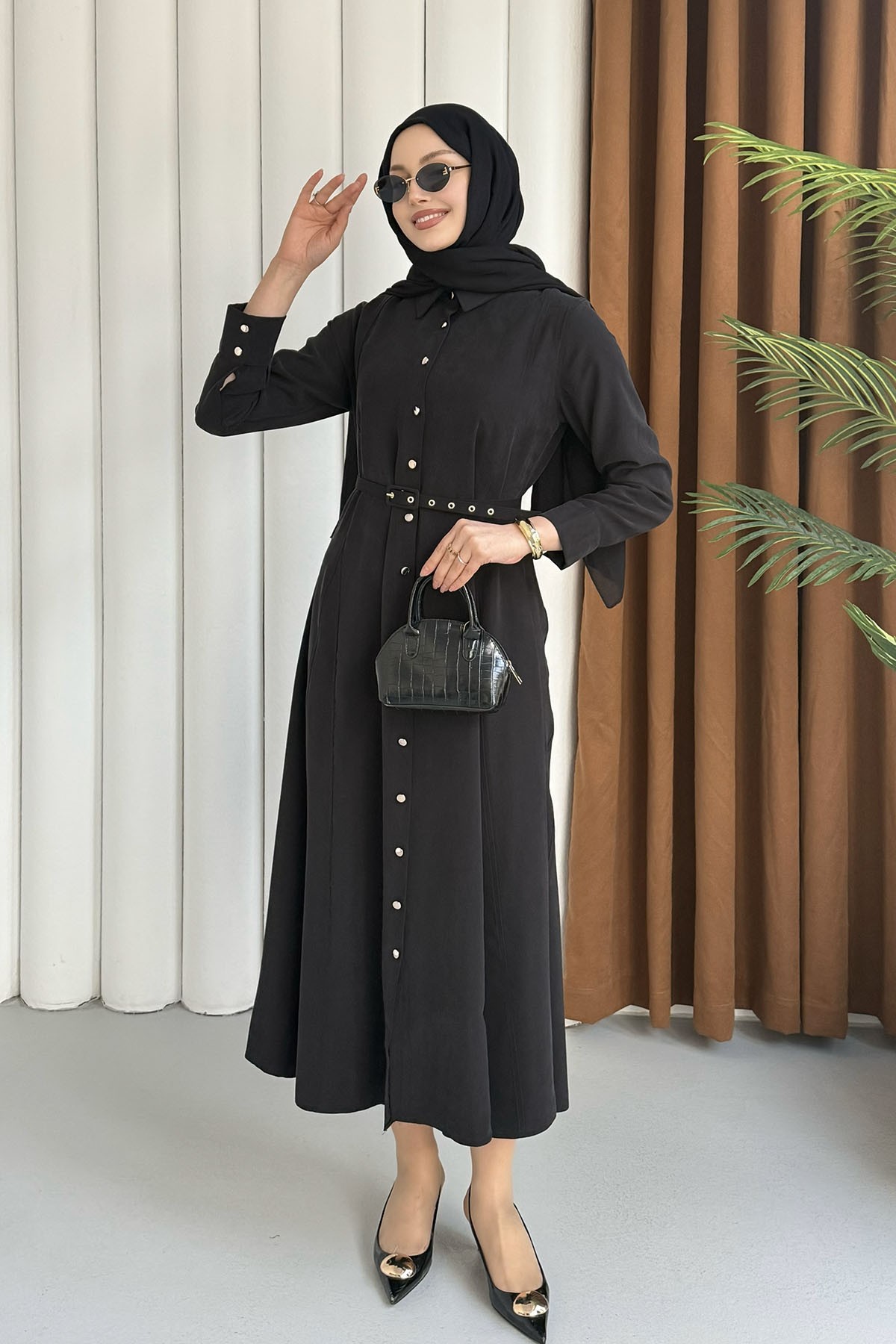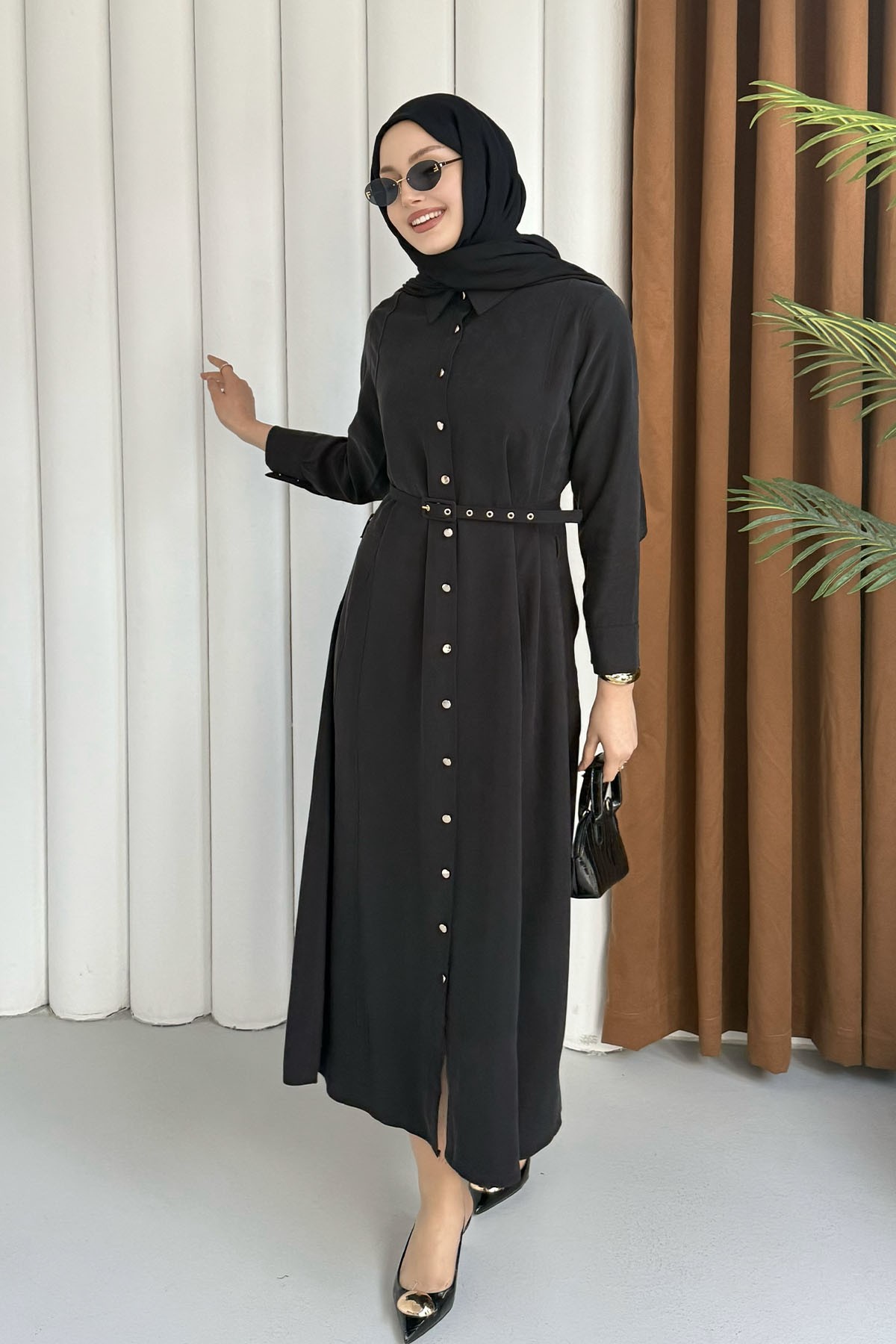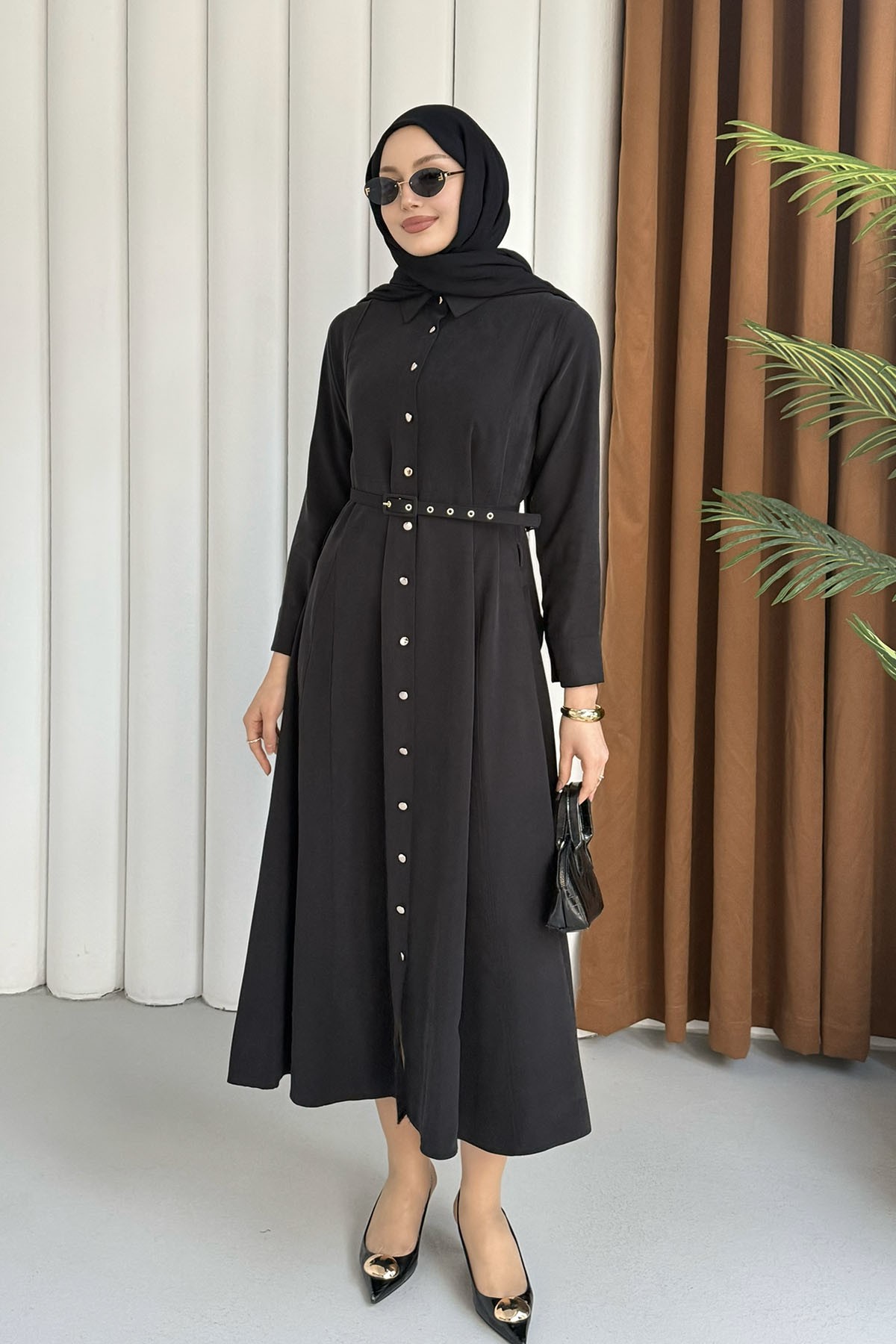 Ön Düğmeli Kemerli Tencel Gömlek Tesettür Elbise-SİYAH (5499)