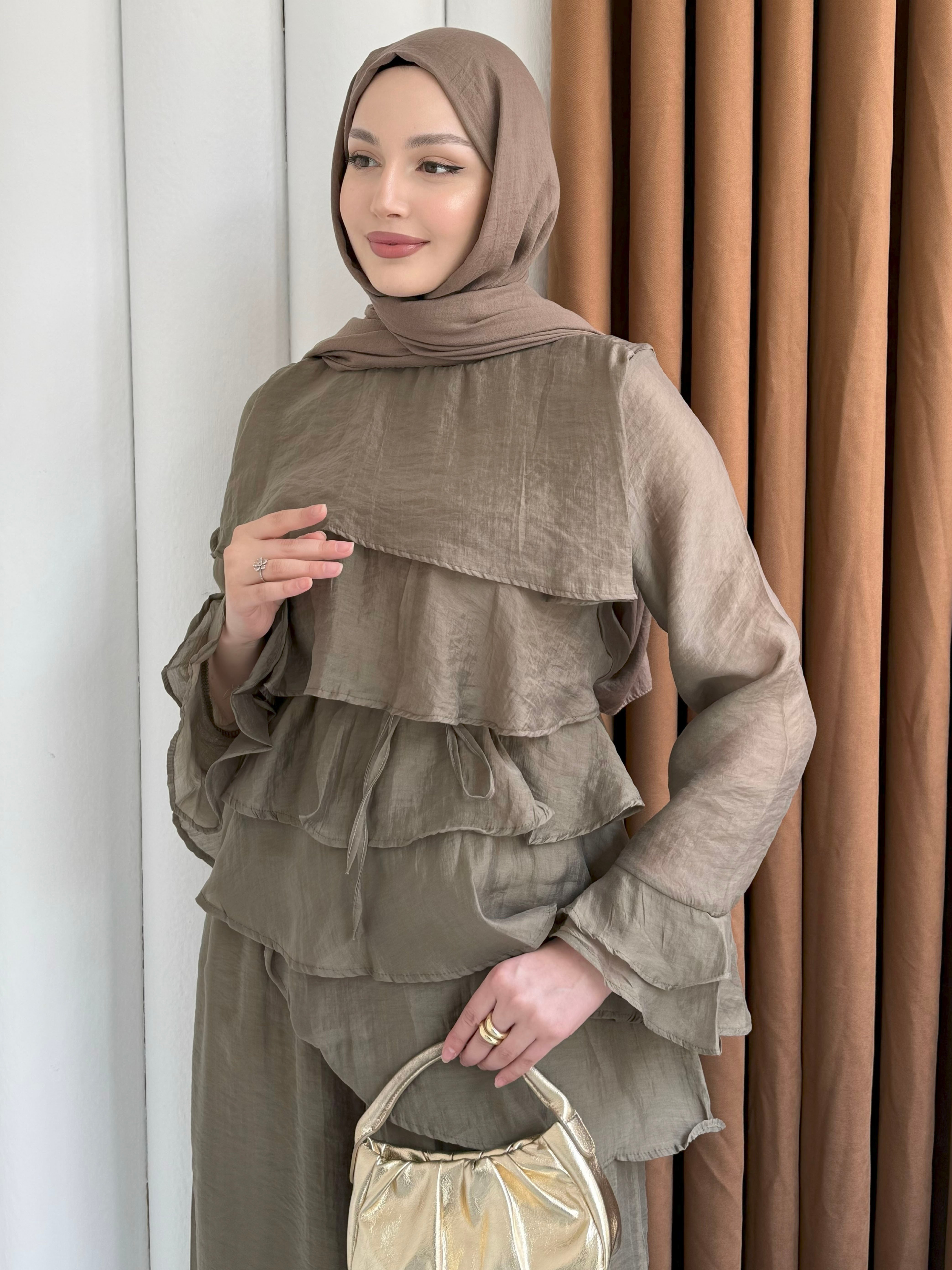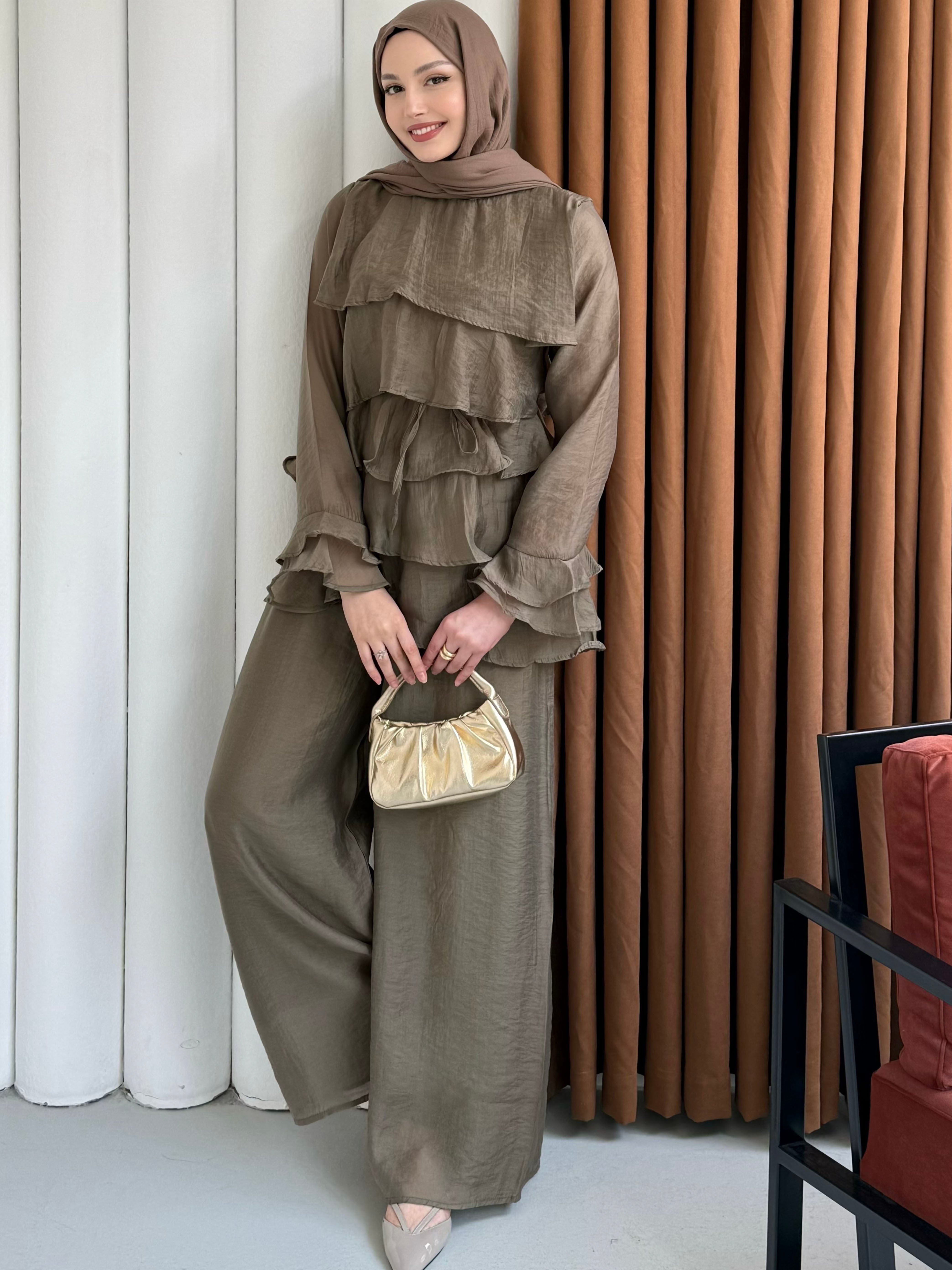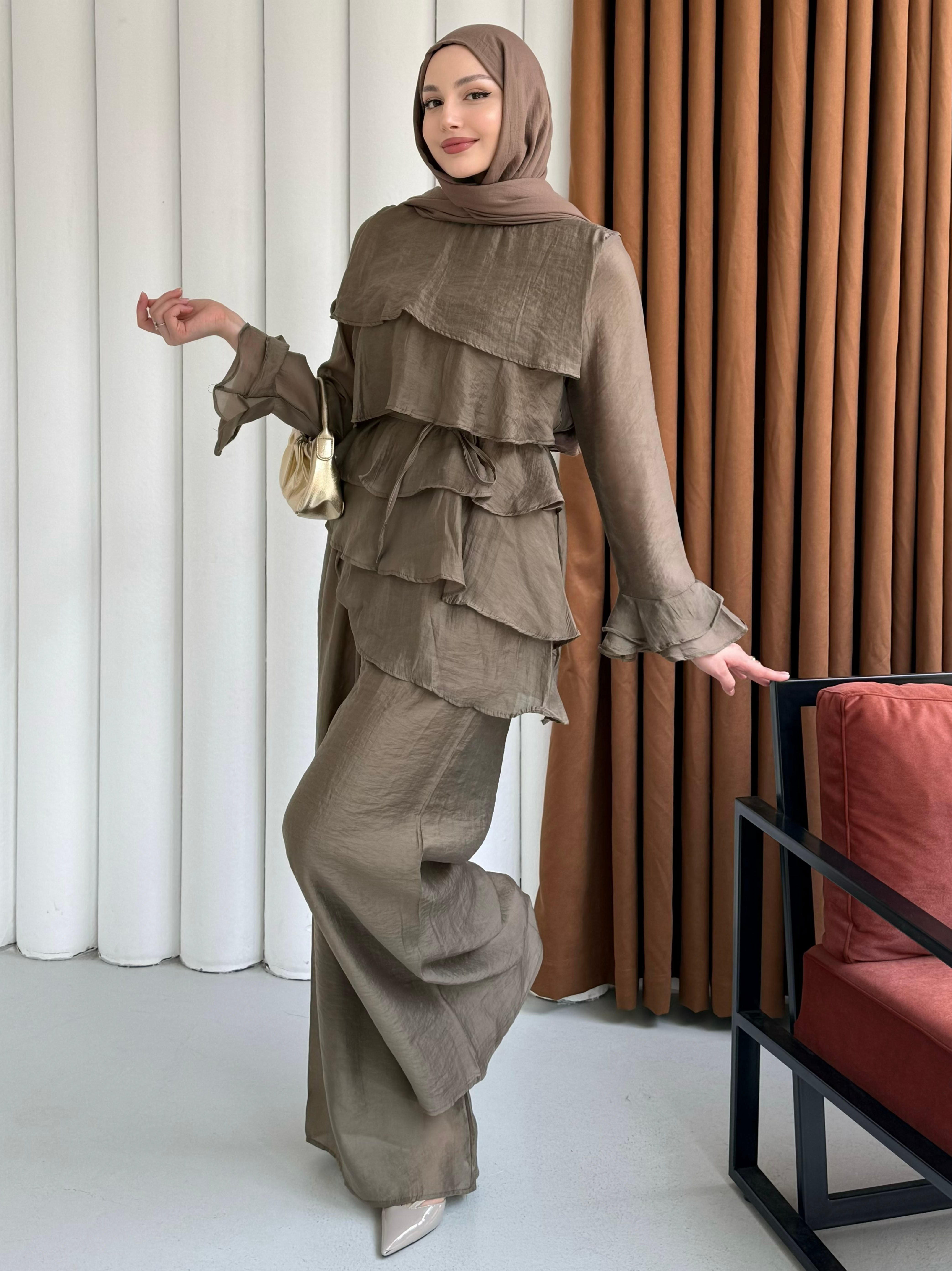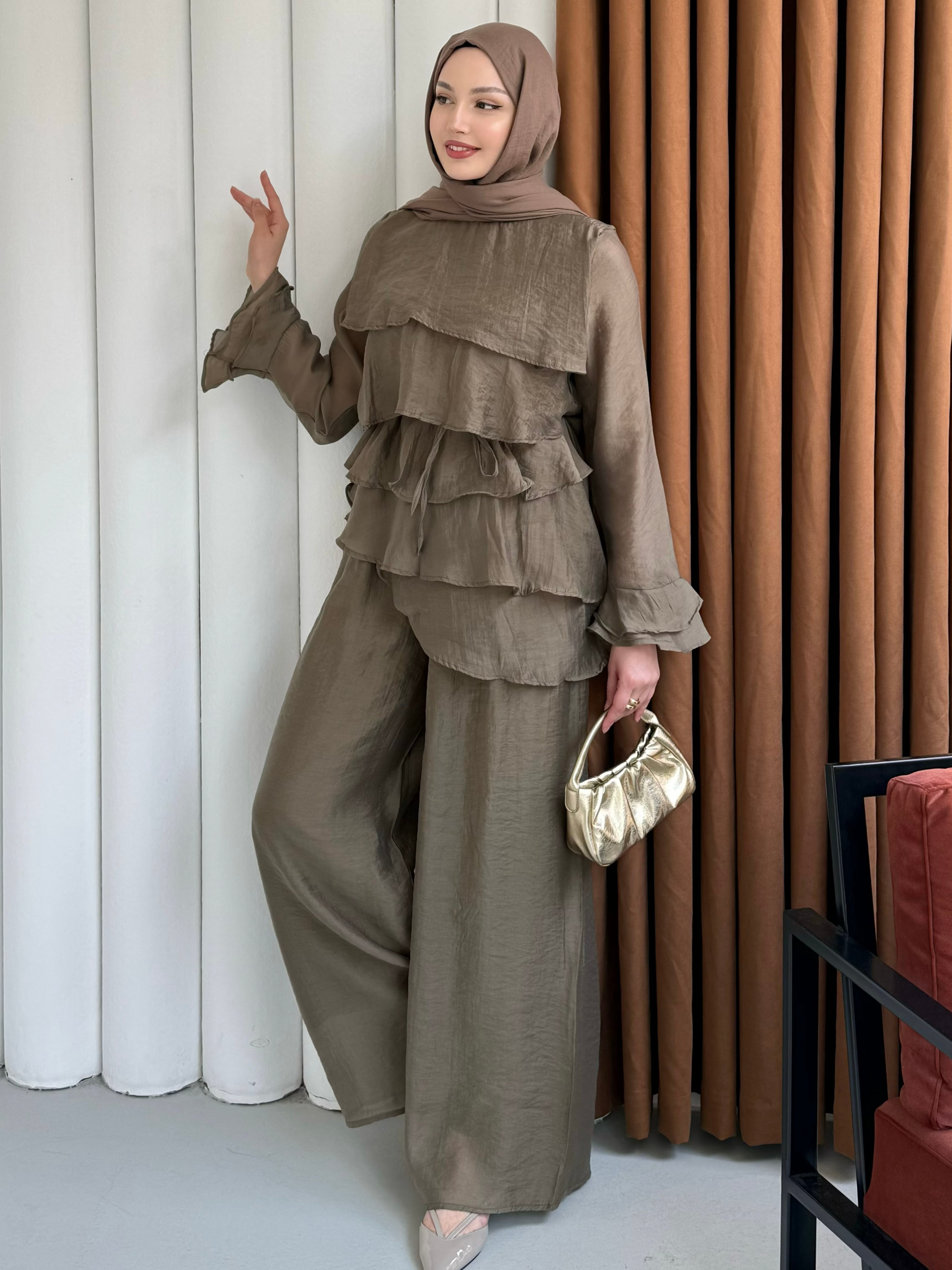 Ön Kat Kat Detaylı Asimetrik Kesim Pantolon Tesettür Takım-HAKİ YEŞİL (9033)