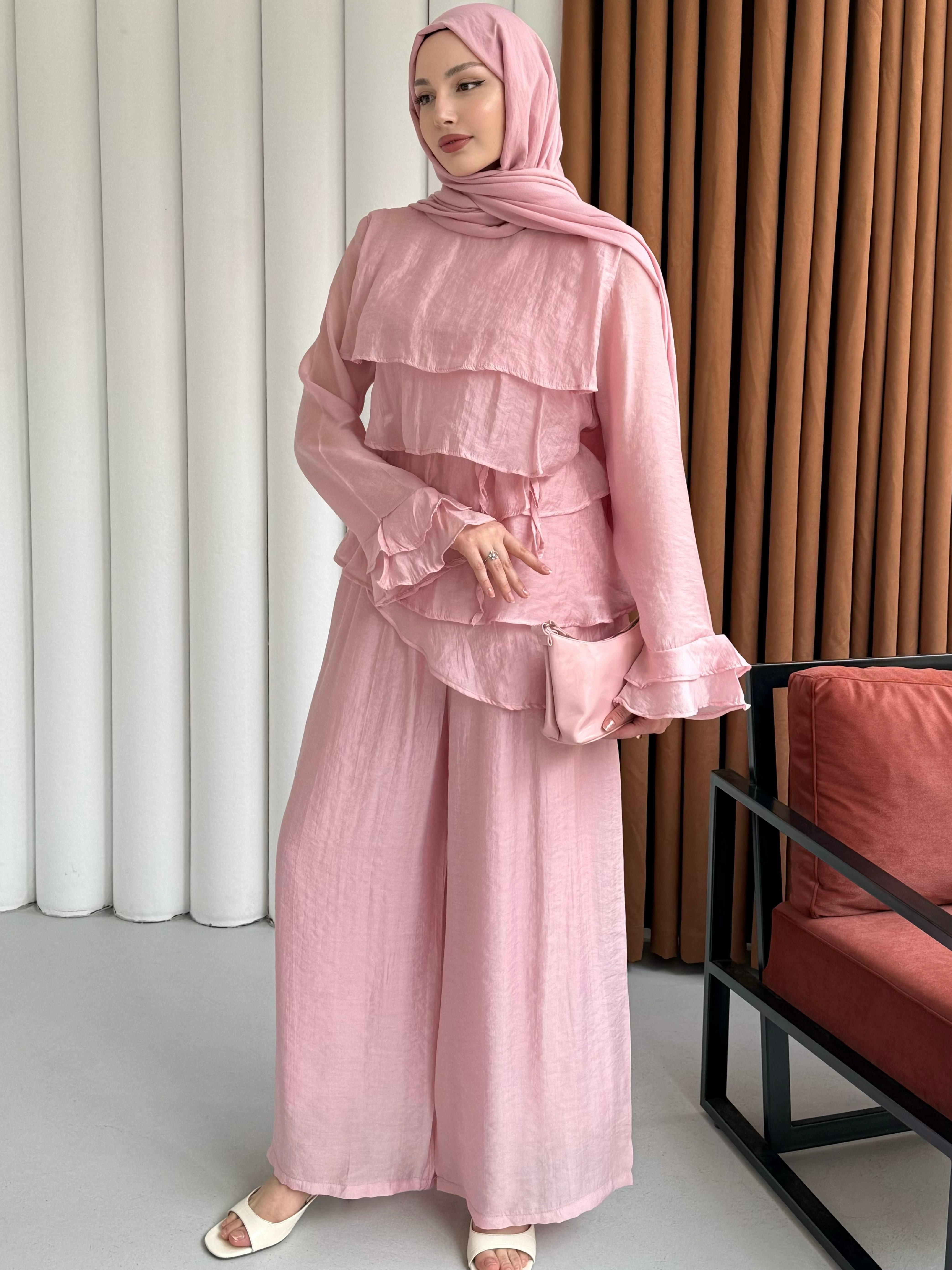 Ön Kat Kat Detaylı Asimetrik Kesim Pantolon Tesettür Takım-PEMBE (9033)