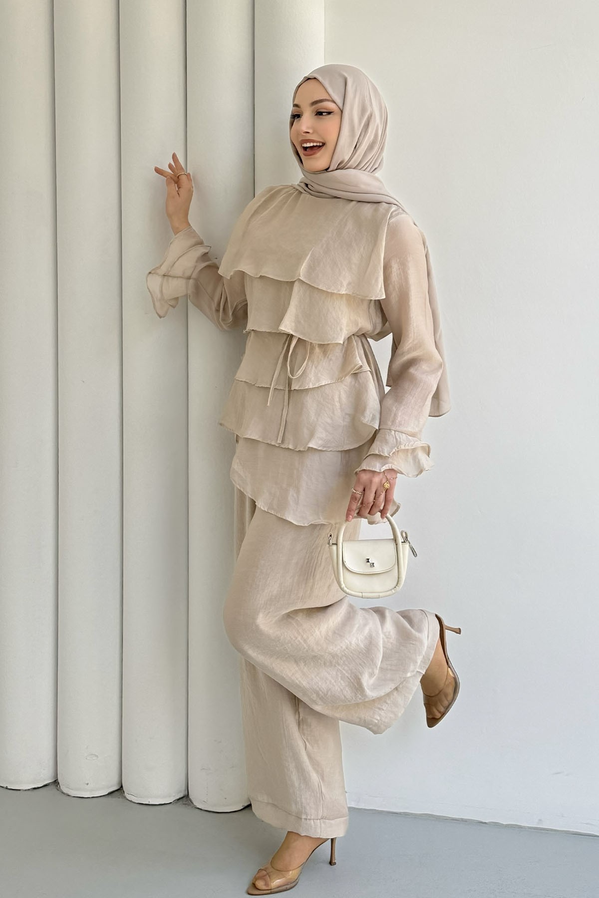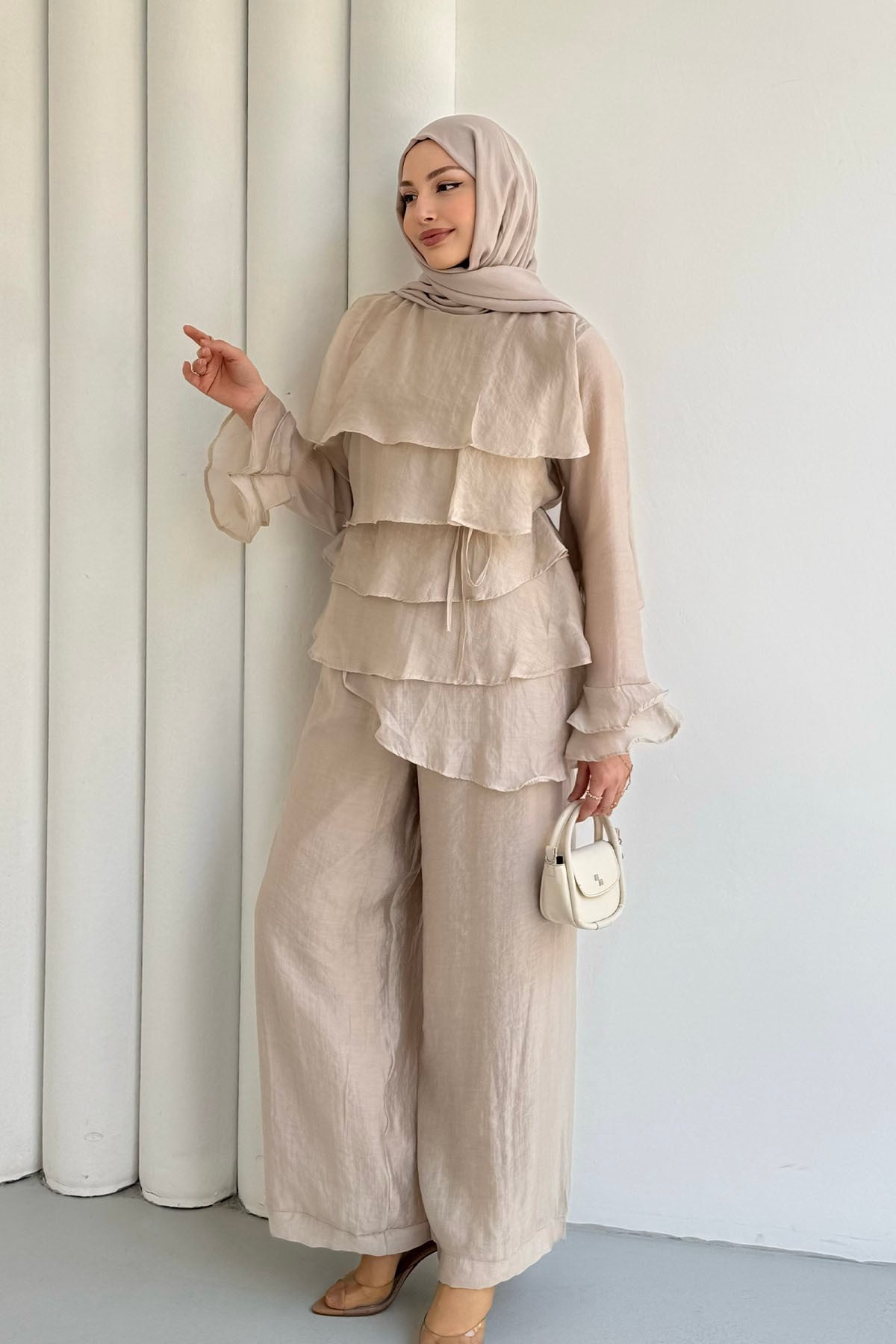 Ön Kat Kat Detaylı Asimetrik Kesim Pantolon Tesettür Takım-TAŞ (9033)