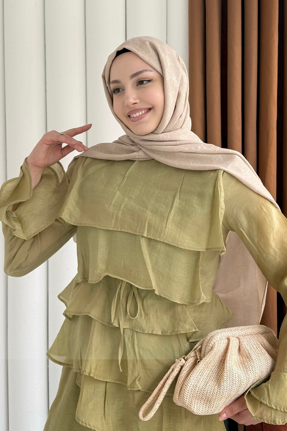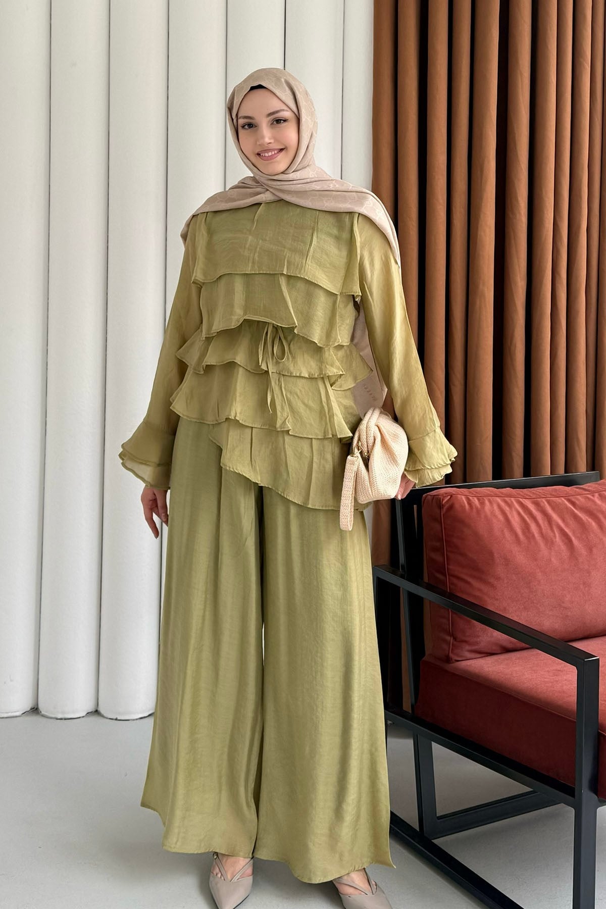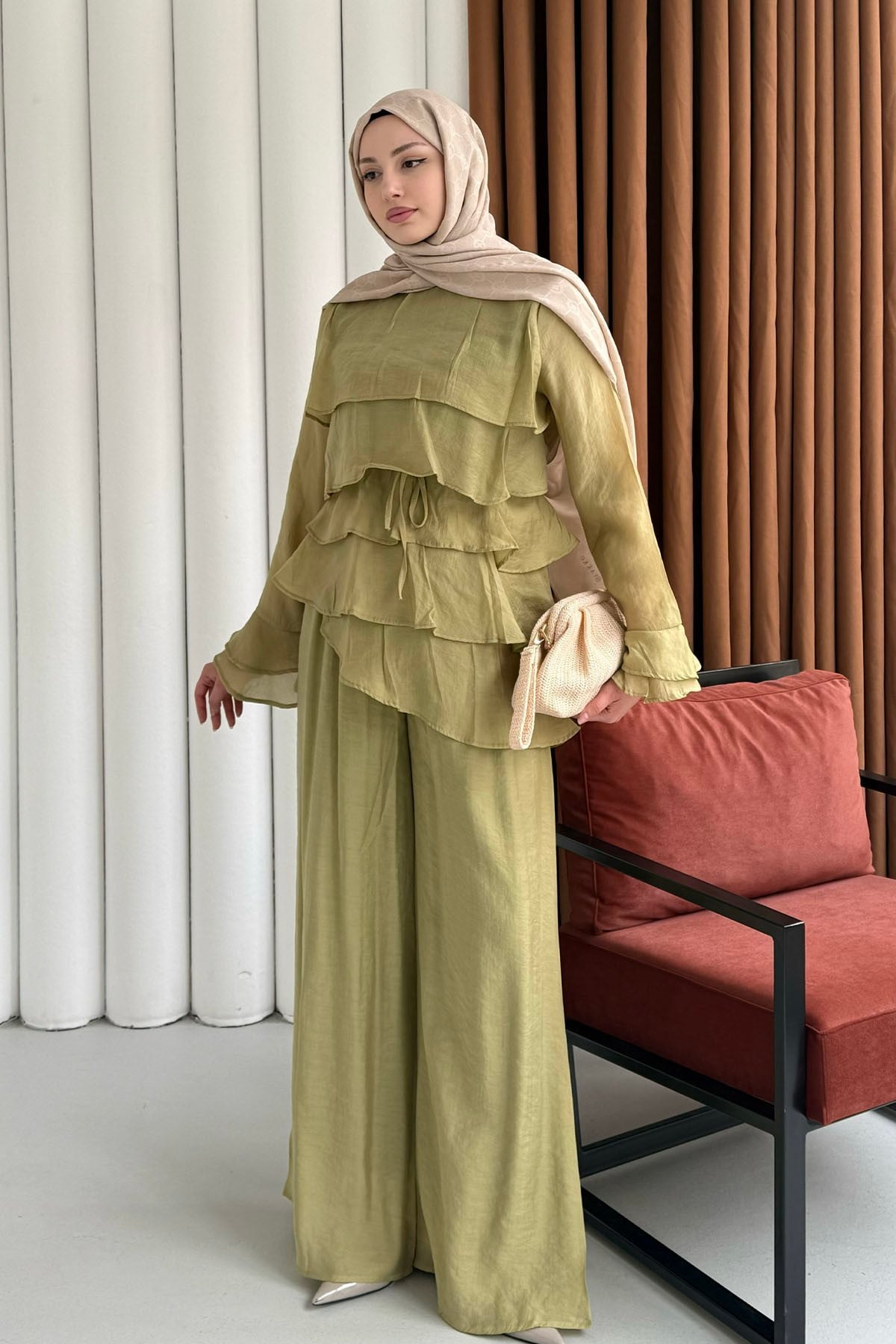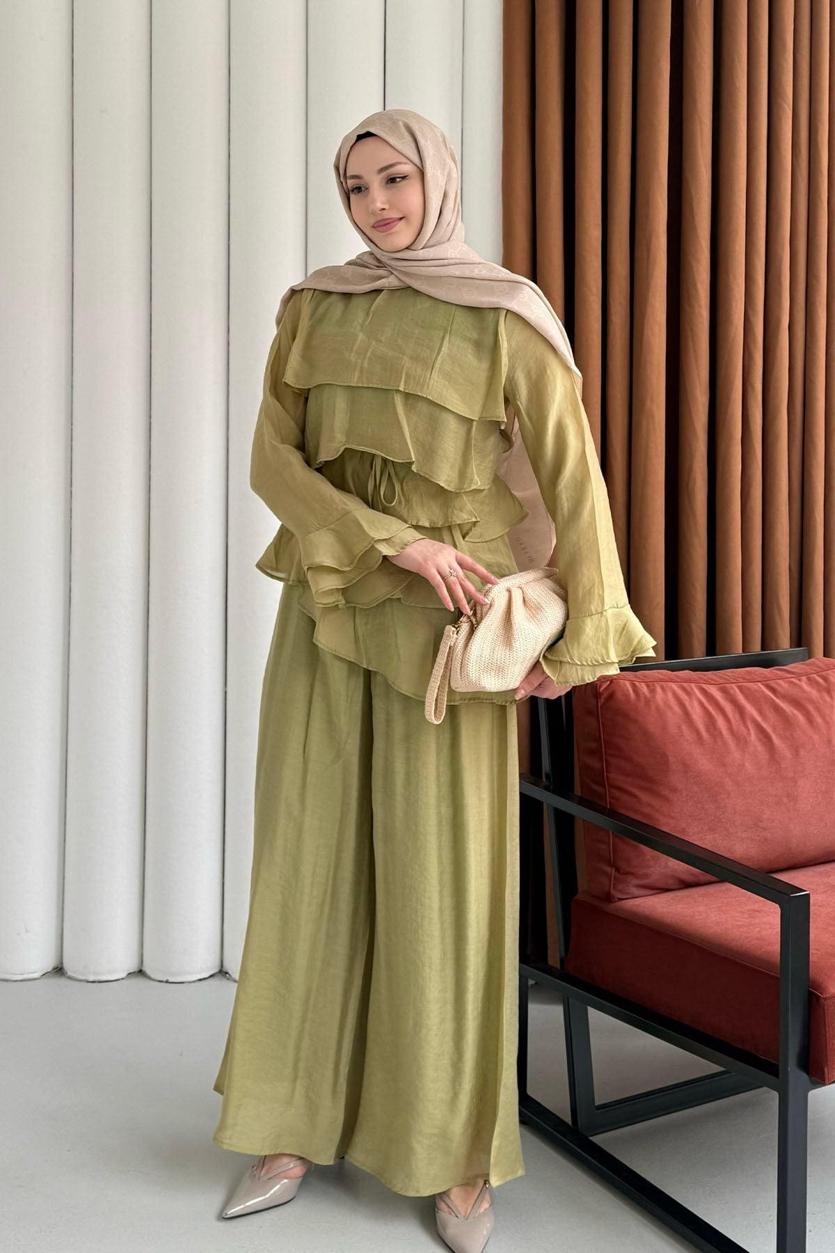 Ön Kat Kat Detaylı Asimetrik Kesim Pantolon Tesettür Takım-YAĞ YEŞİLİ (9033)
