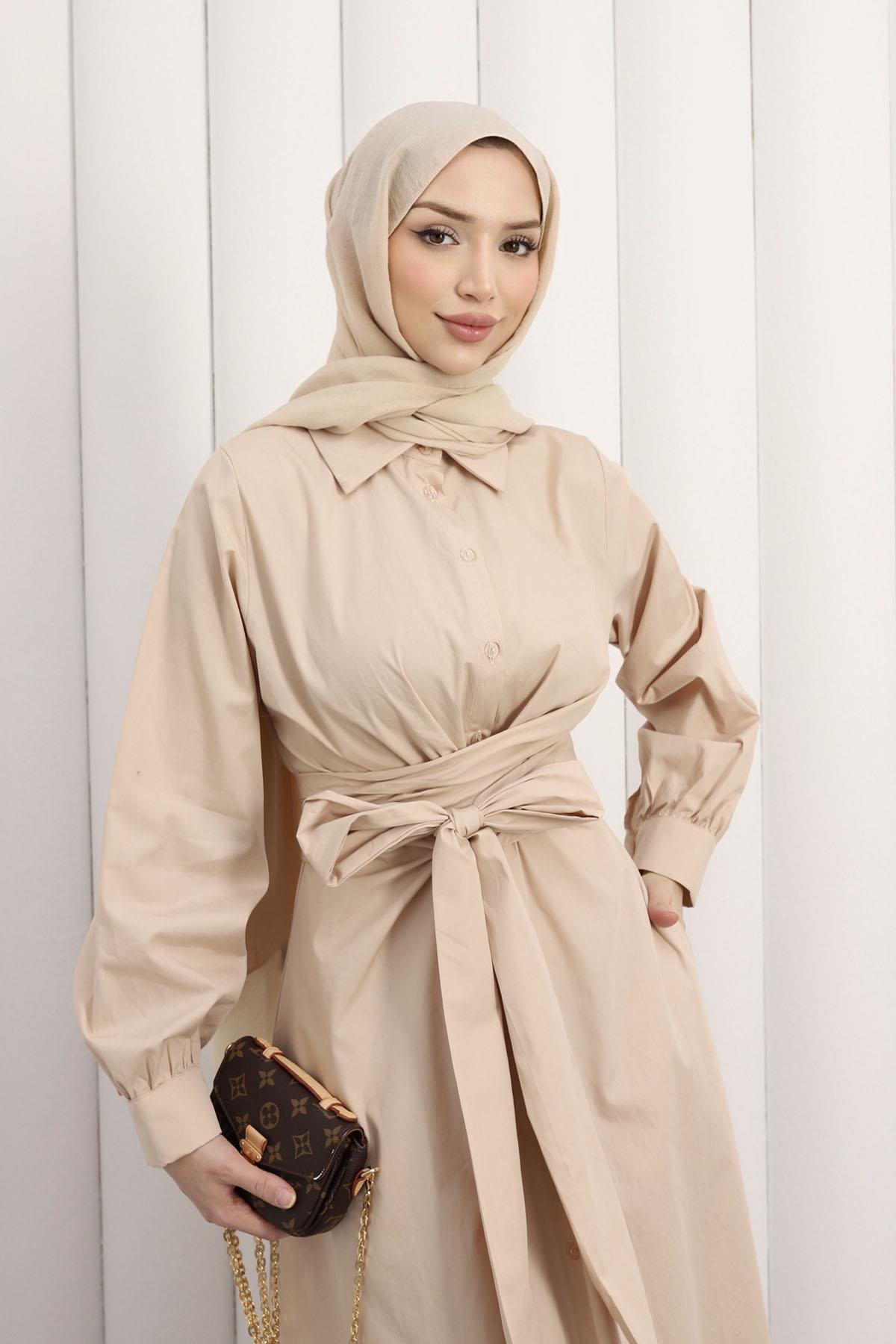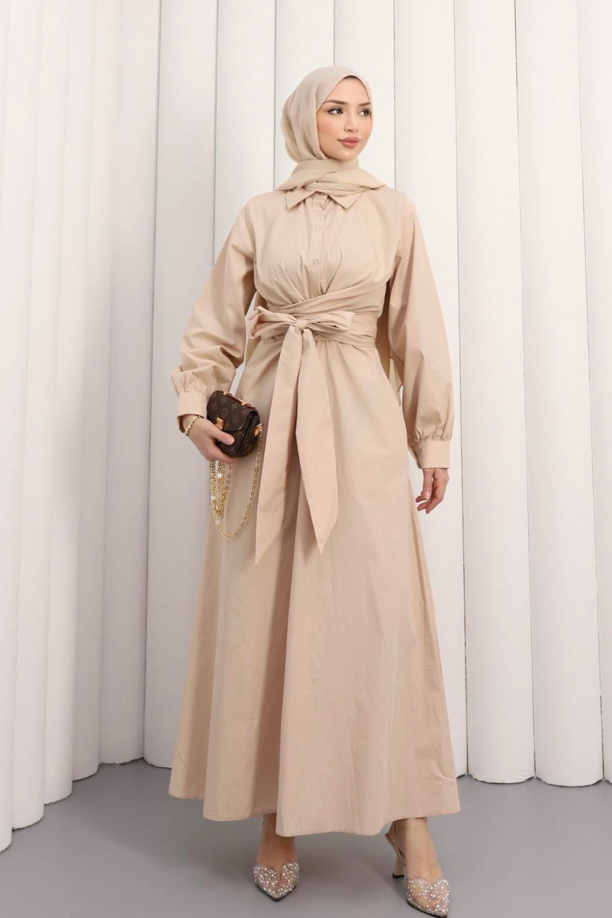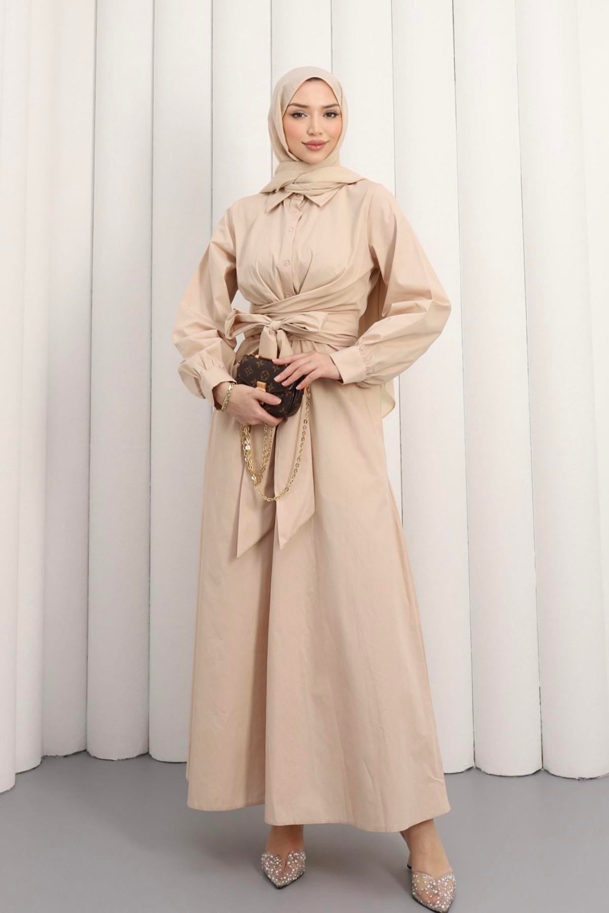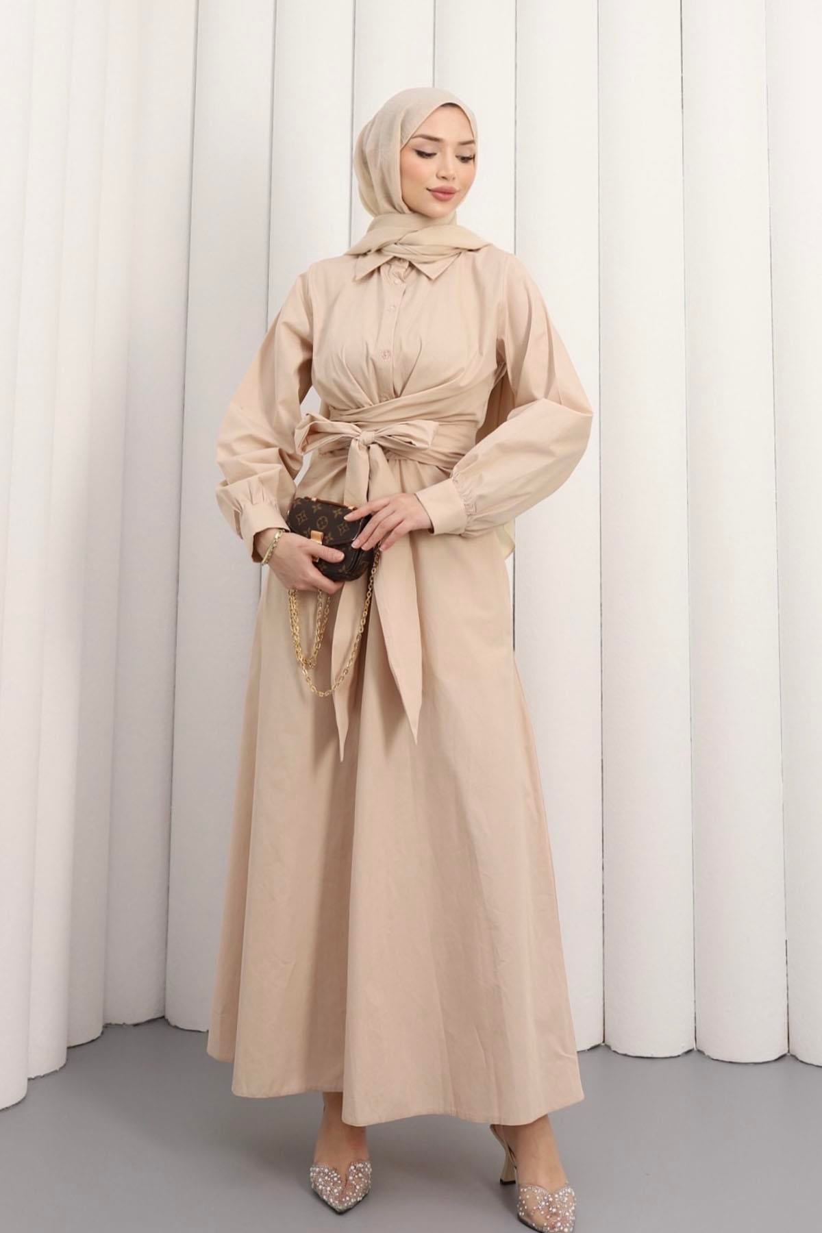 Önden Bağlamalı Poplin Tesettür Elbise-TAŞ (1045)