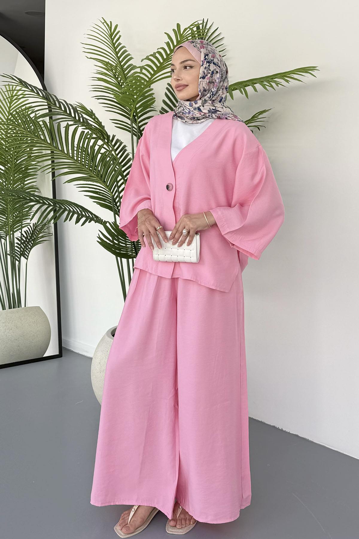 Önden Düğmeli Yanları Yırtmaçlı Ceketli Tesettür Takım-PEMBE (8852)