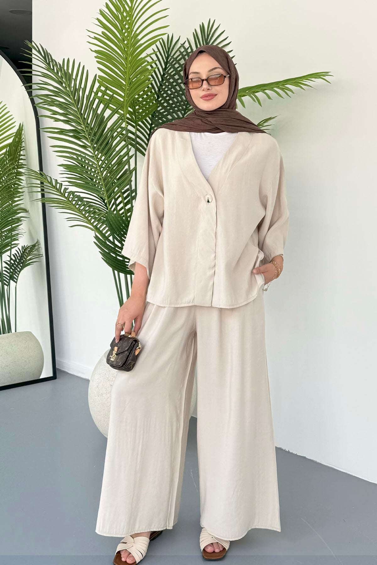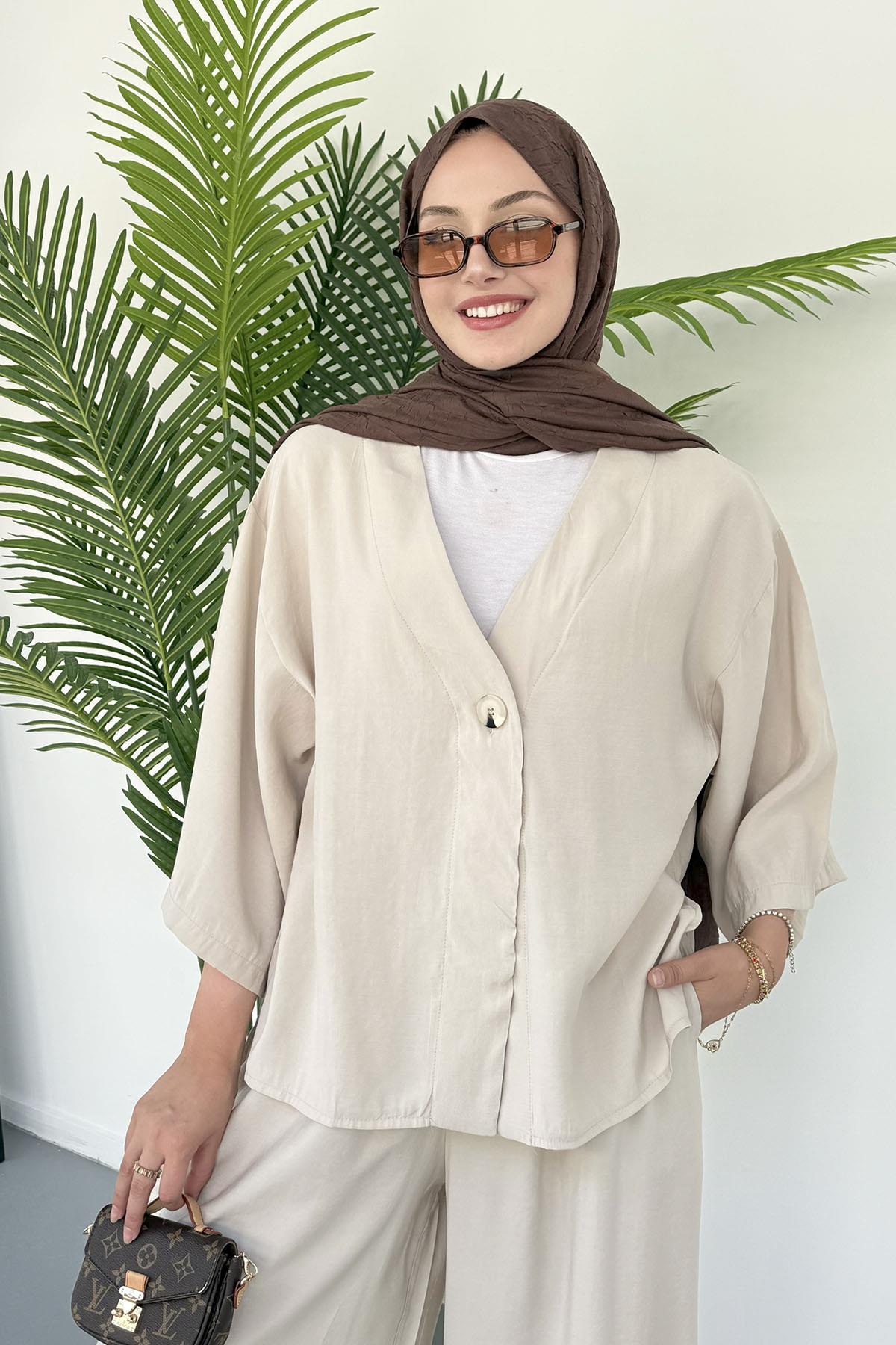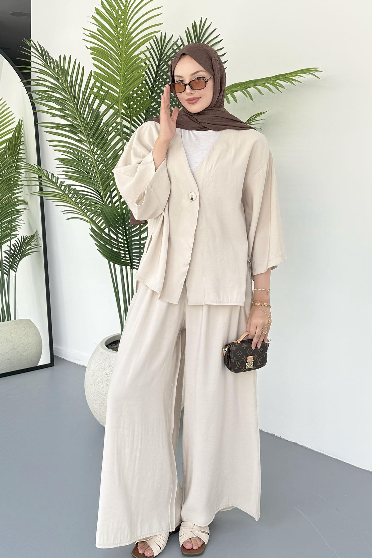 Önden Düğmeli Yanları Yırtmaçlı Ceketli Tesettür Takım-TAŞ (8852)