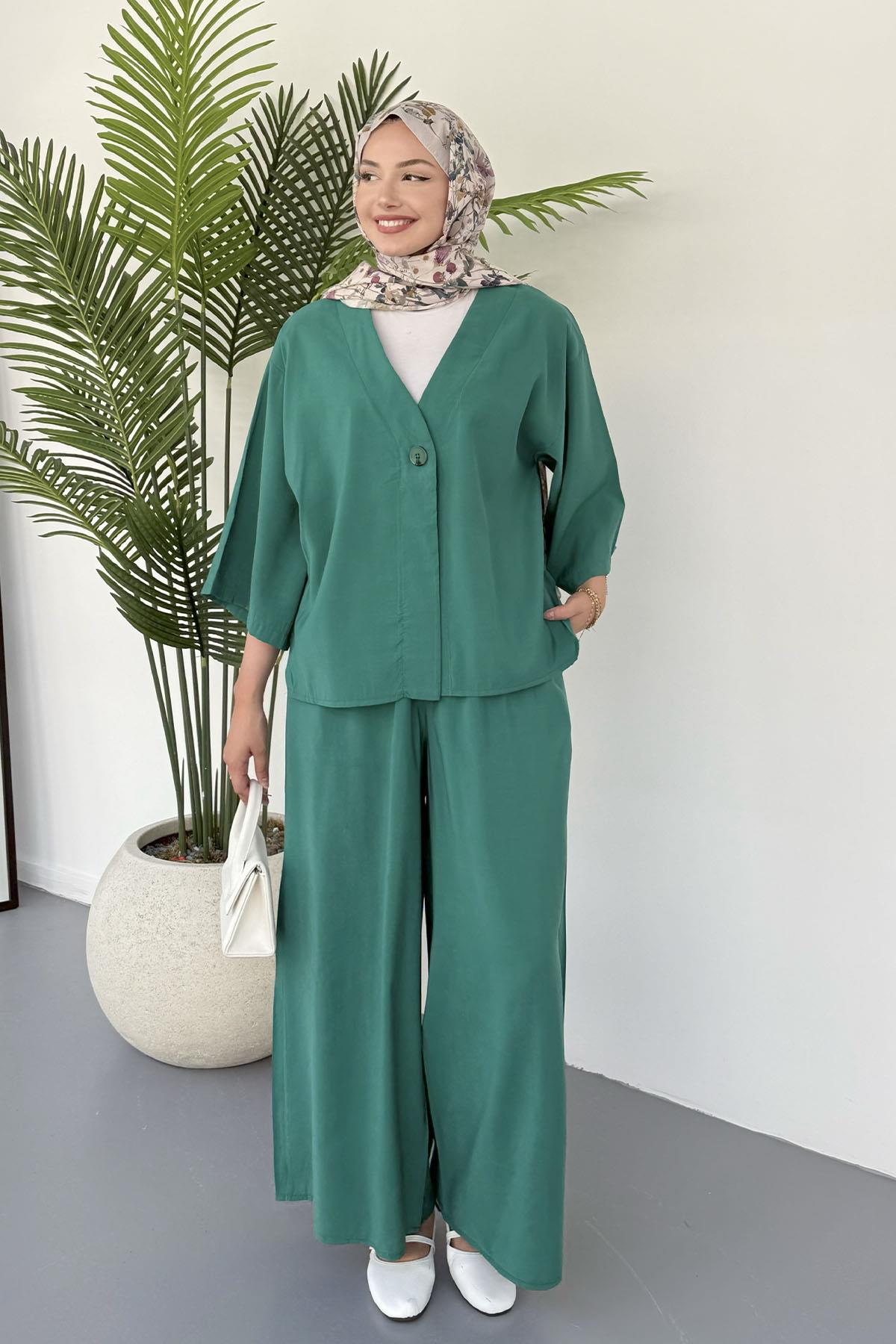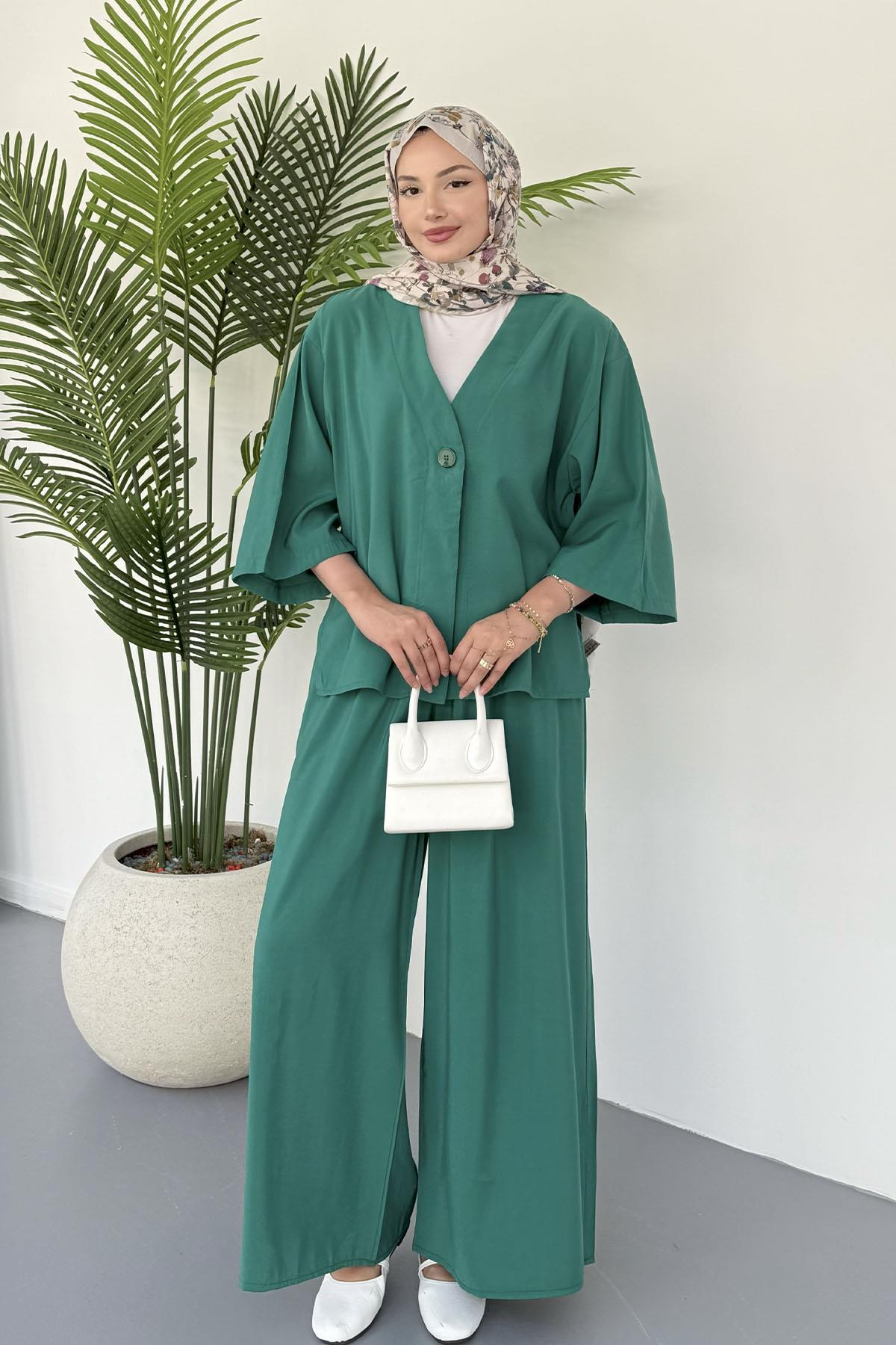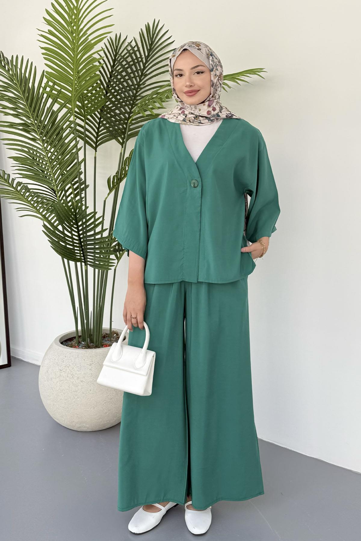 Önden Düğmeli Yanları Yırtmaçlı Ceketli Tesettür Takım-ZÜMRÜT YEŞİL (8852)