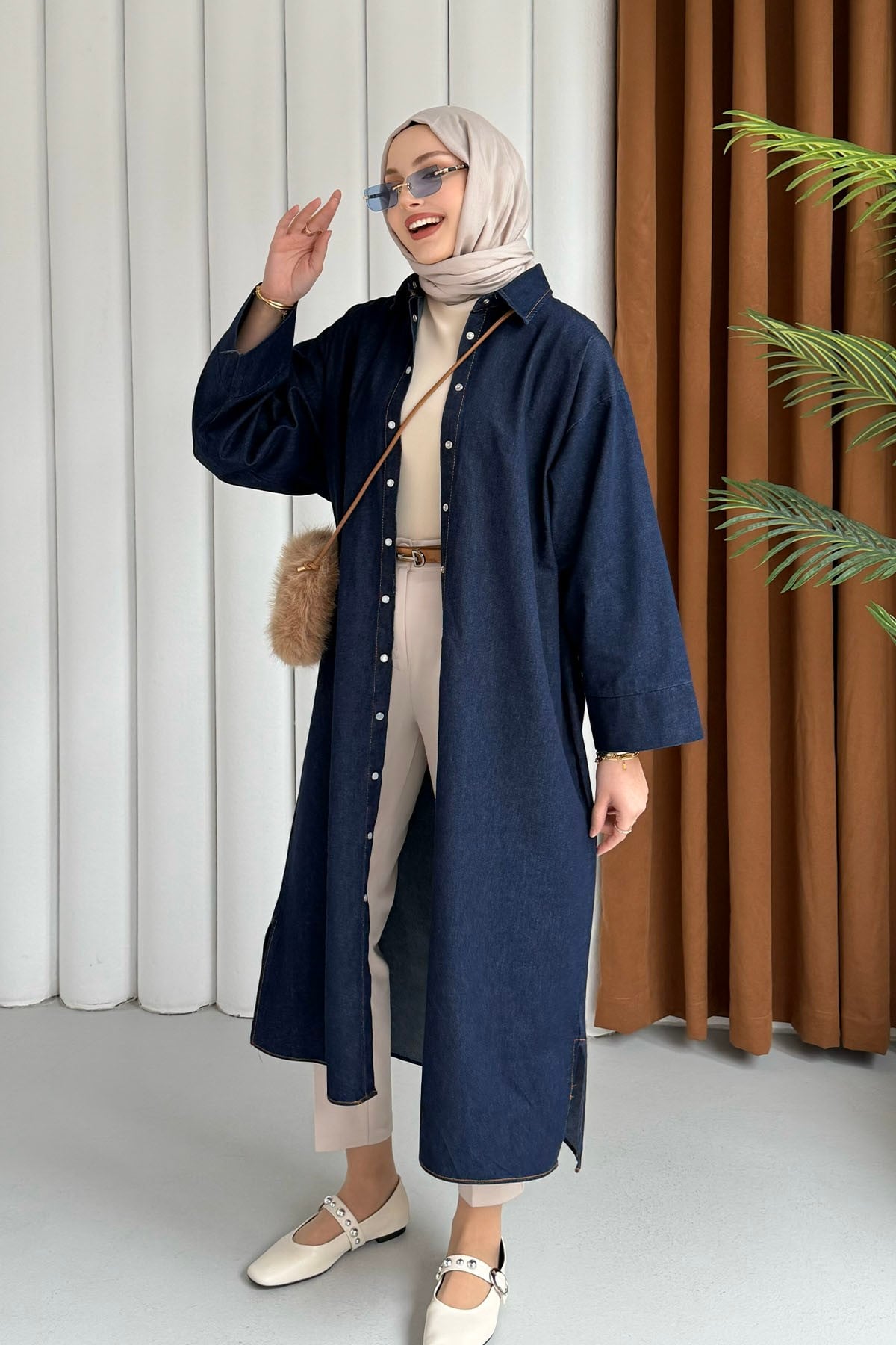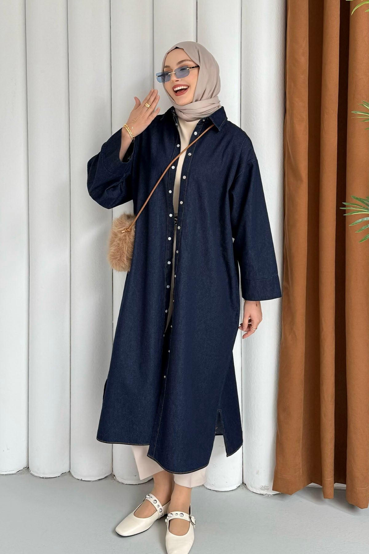 Önü Düğmeli Denim Tesettür Kap-KOYU MAVİ