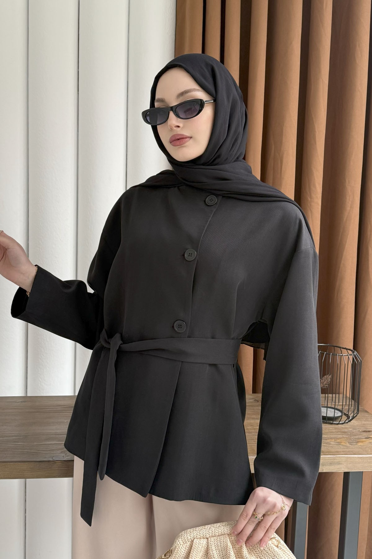 Önü Düğmeli Seyyar Kuşaklı Ceket-SİYAH