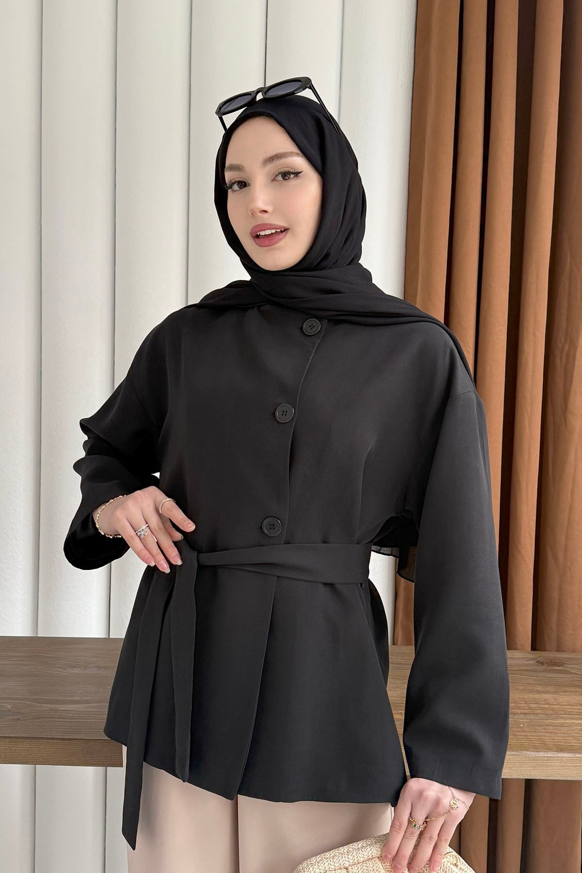 Önü Düğmeli Seyyar Kuşaklı Ceket-SİYAH (1273)