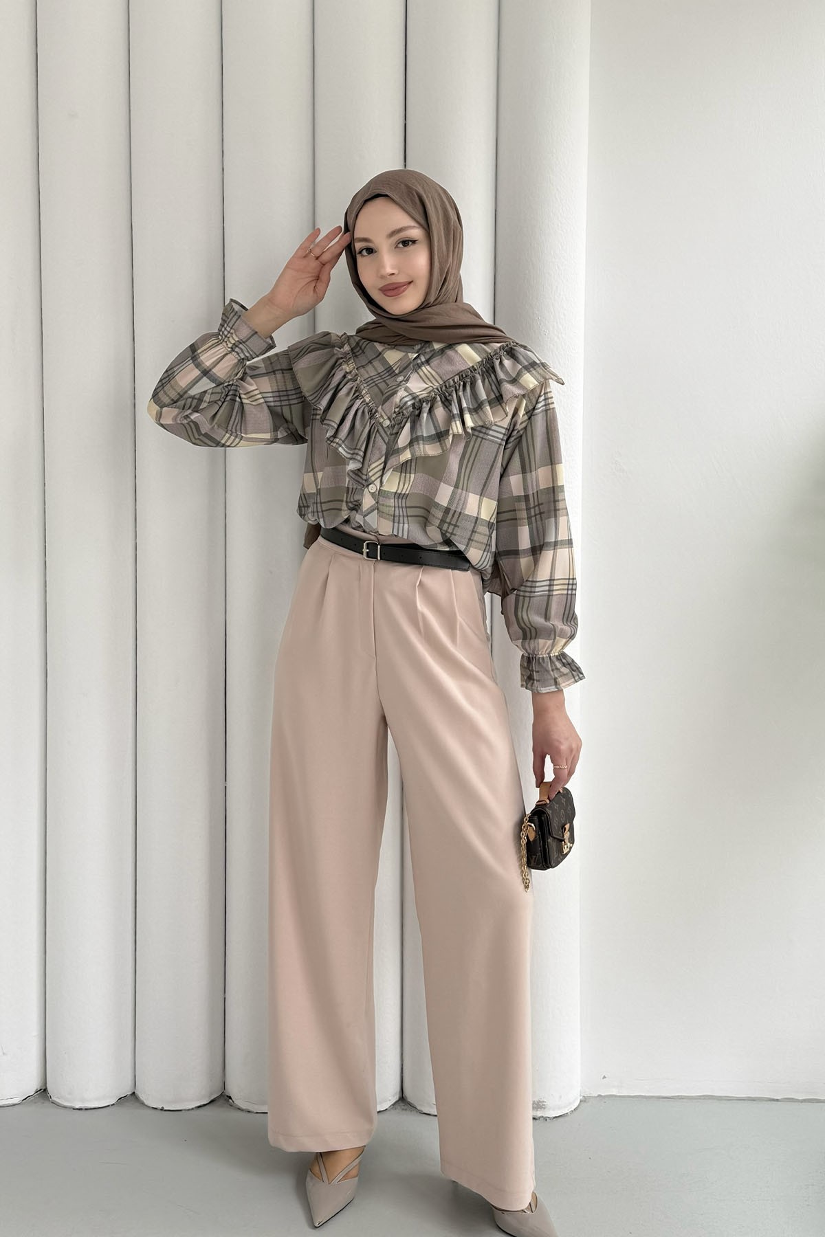 Önü Fırfırlı Desenli Gömlek-MİNT YEŞİLİ Önü Fırfırlı Desenli Gömlek-KAHVERENGİ Önü Fırfırlı Desenli Gömlek-BORDO