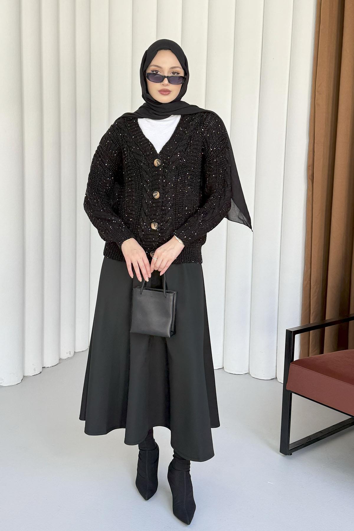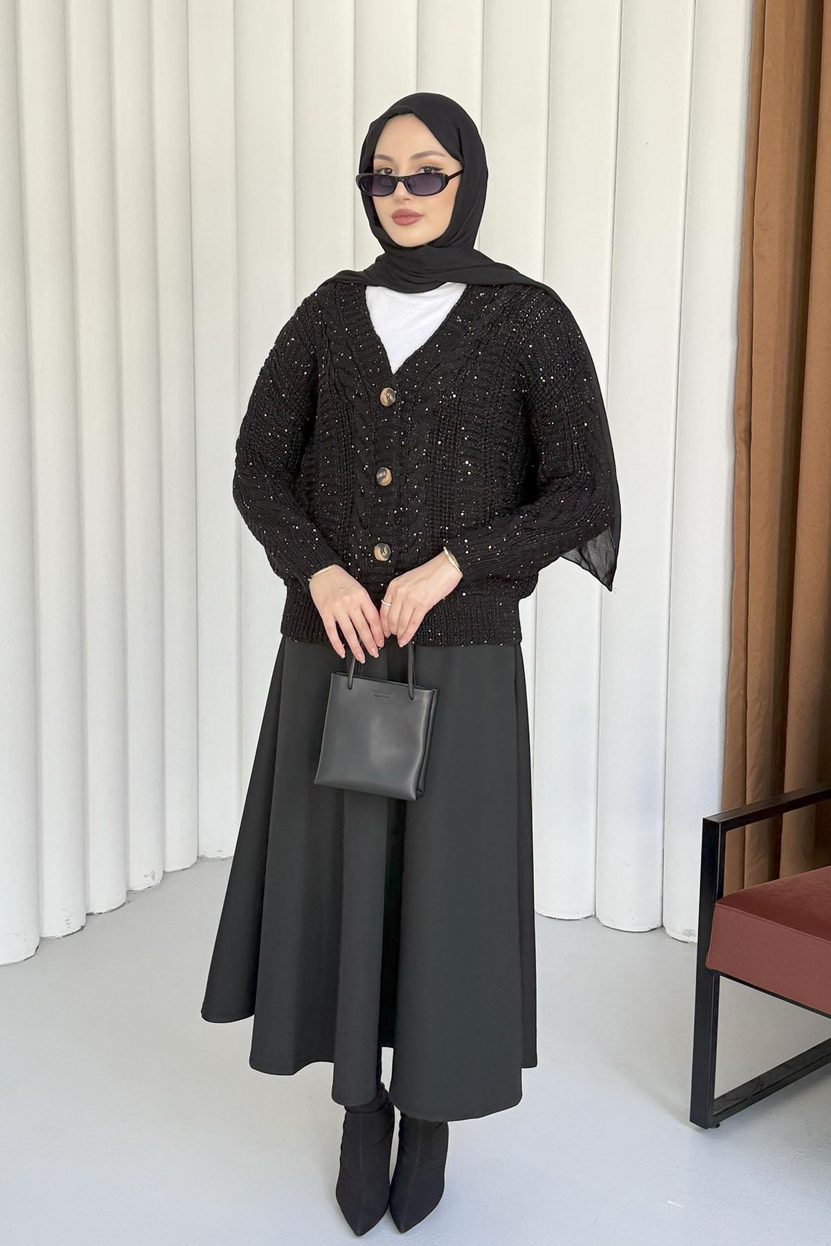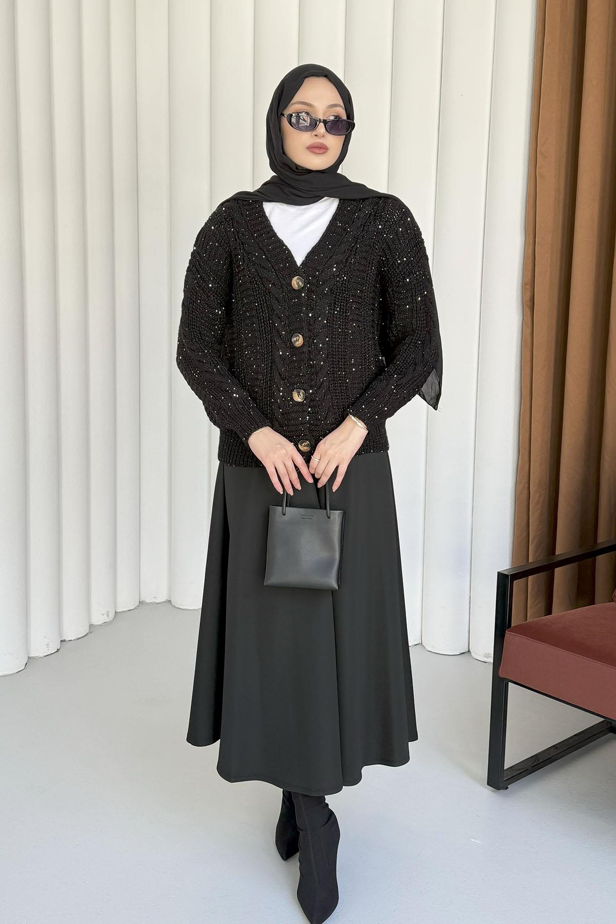 Örgü Detaylı Dört Düğmeli Balon Kol Triko Hırka-SİYAH (1157)