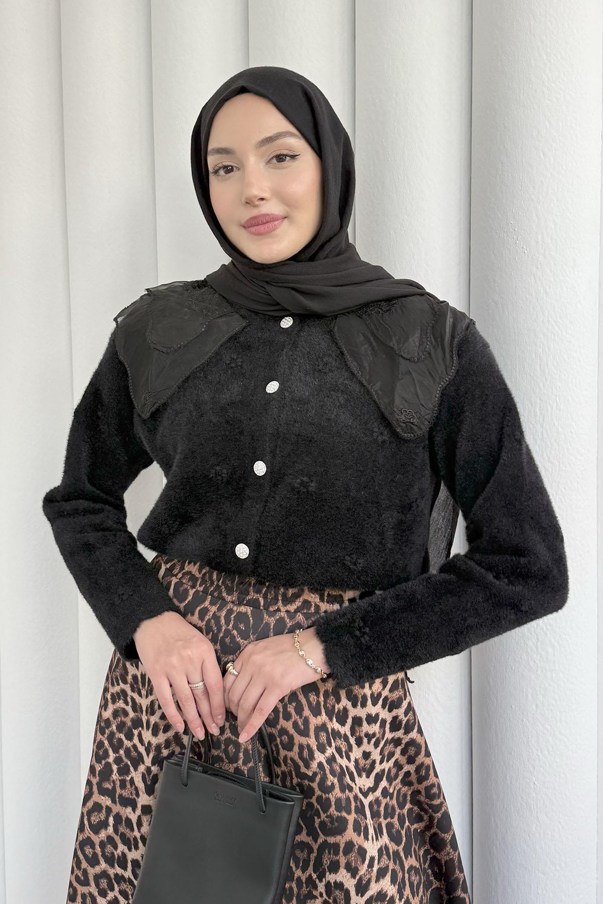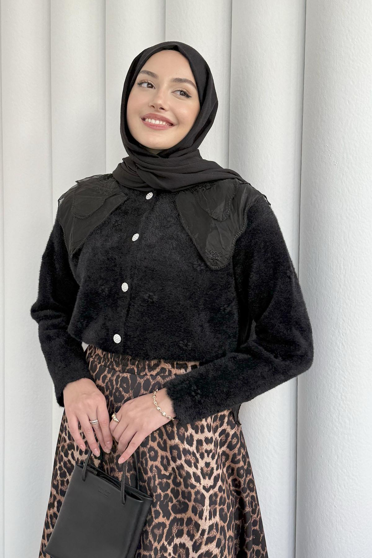 Otantik Dantel Yakalı Triko Hırka-SİYAH (2624)