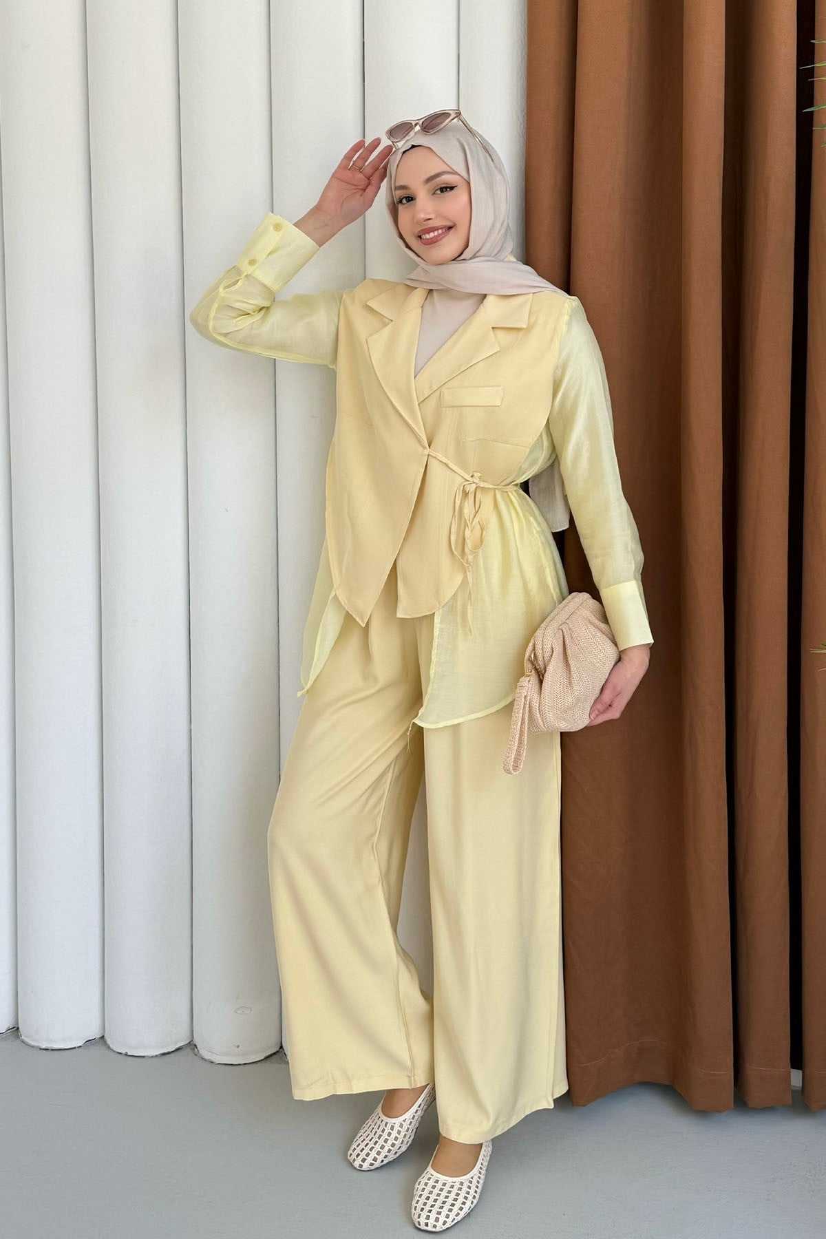 Oversize Şifon & Tül Detaylı Ceket Pantolon Tesettür Takım-SARI (3142)