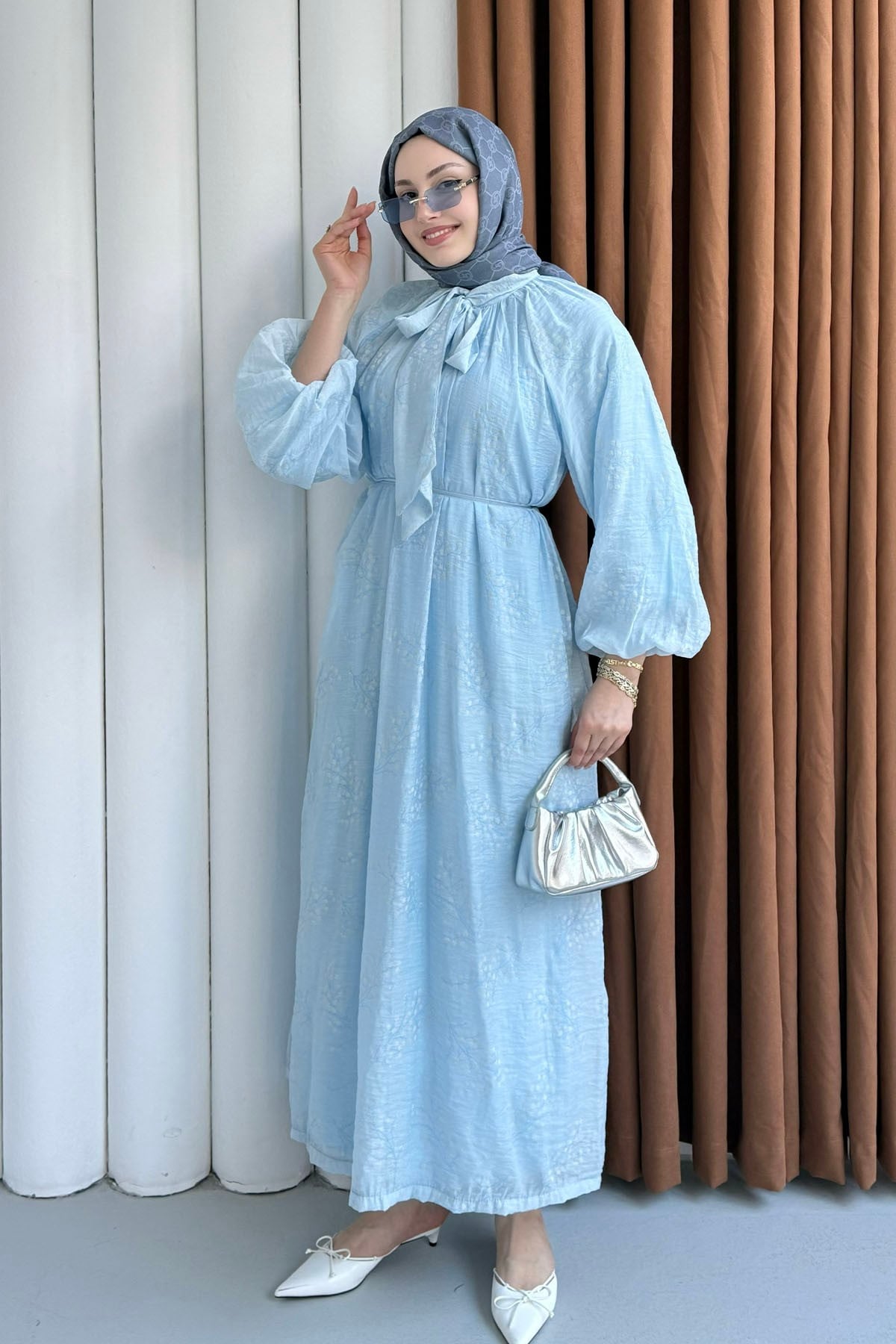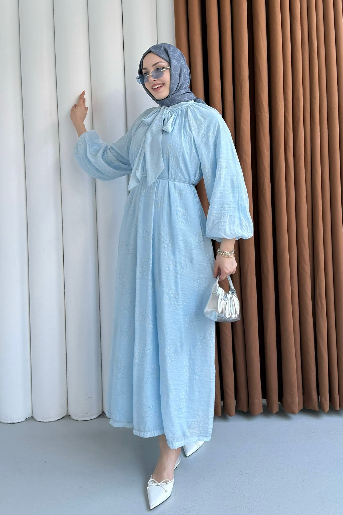 Papatya İşlemeli Biye Kemerli Tesettür Elbise-BEBE MAVİ (25134)