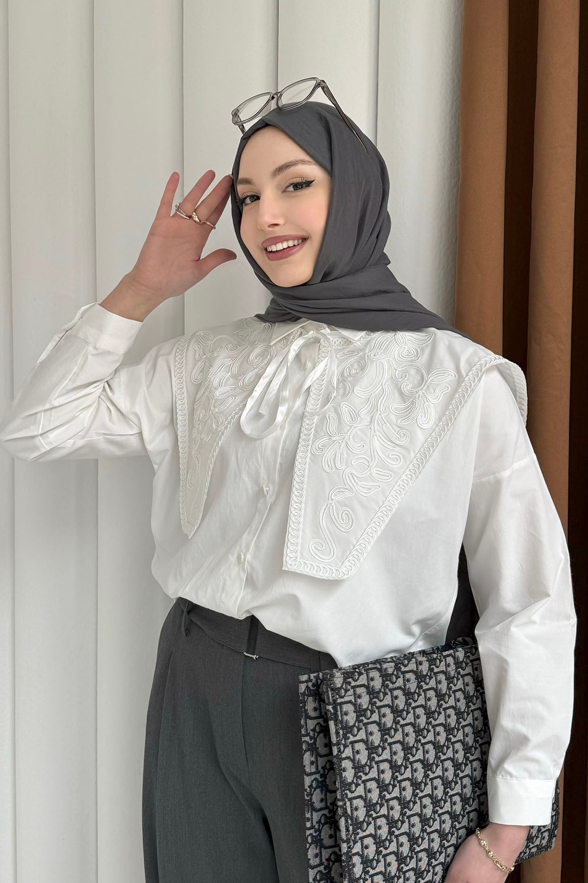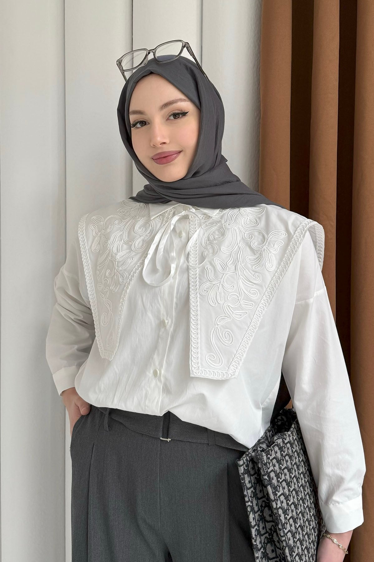 Premium Nakışlı Yaka Detaylı Gömlek-BEYAZ (3119)