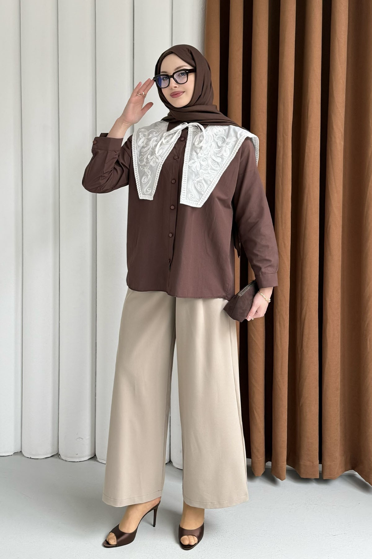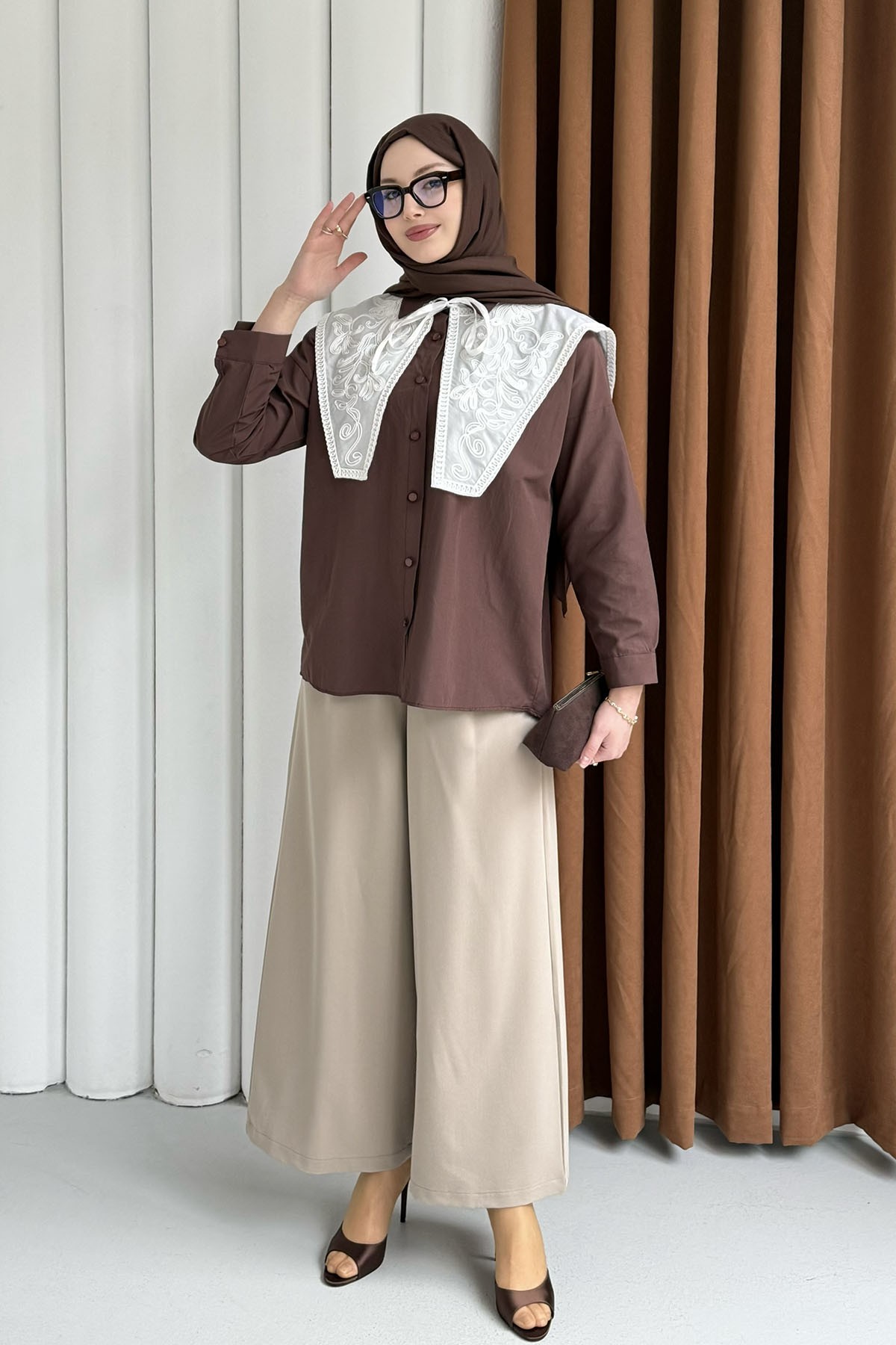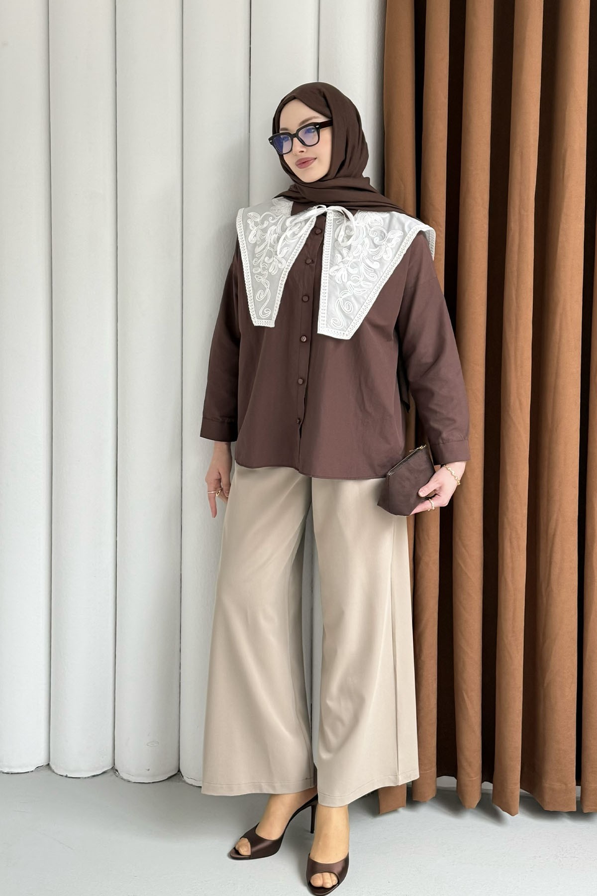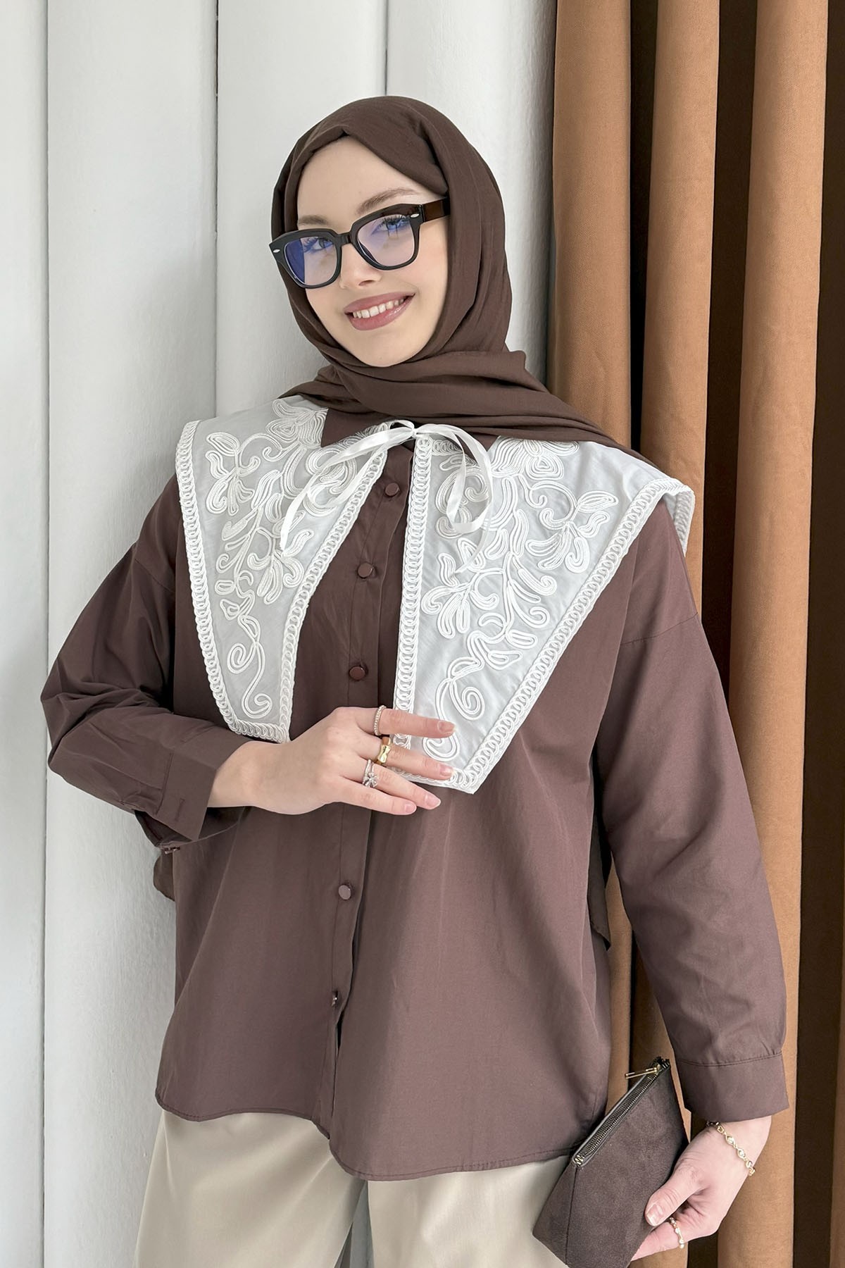 Premium Nakışlı Yaka Detaylı Gömlek-KAHVERENGİ (3119)