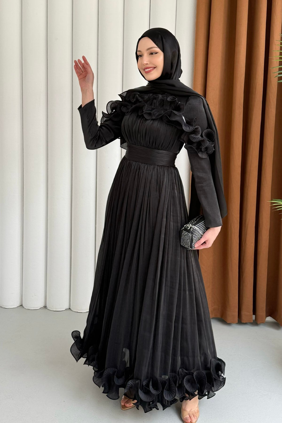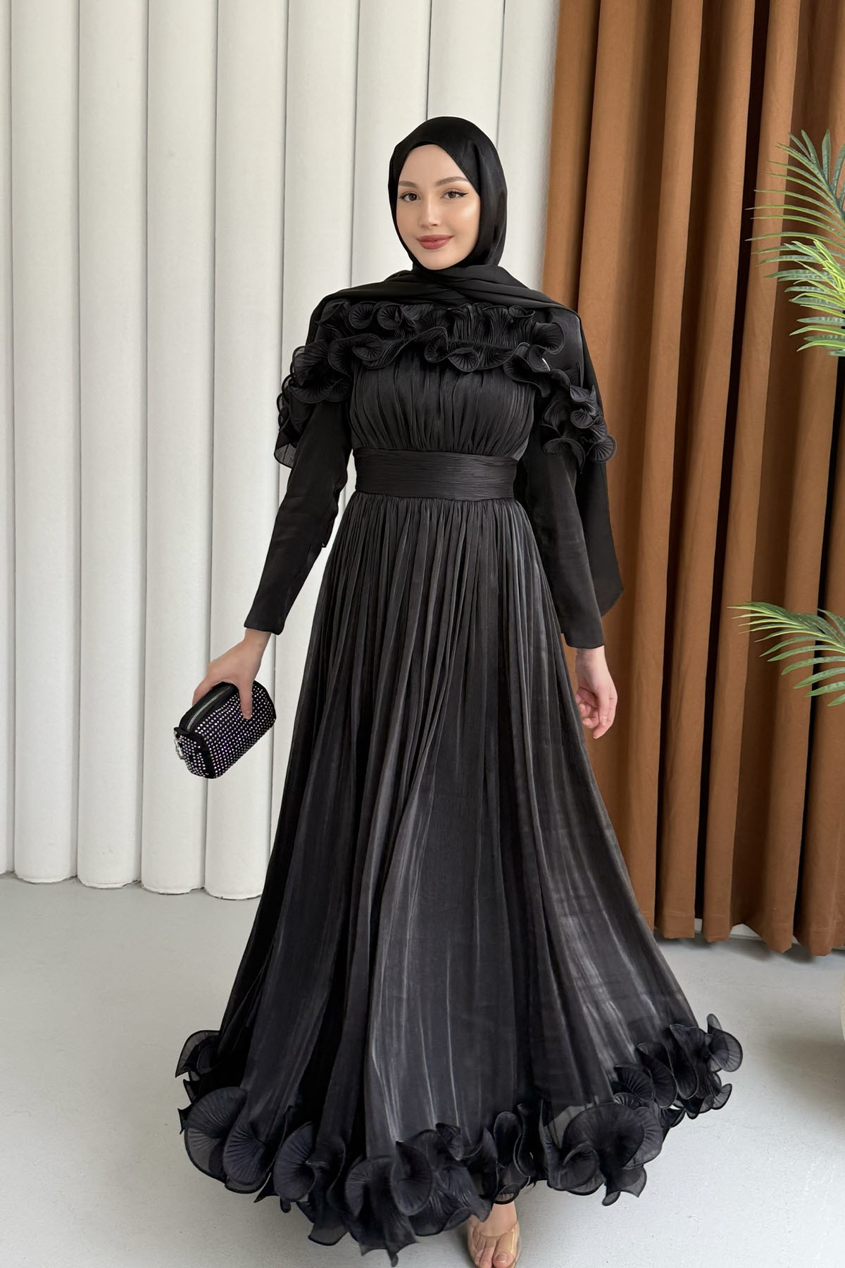 Premium Seri Çiçek İşlemeli Tesettür Abiye-GÜL KURUSU Premium Seri Çiçek İşlemeli Tesettür Abiye-SİYAH