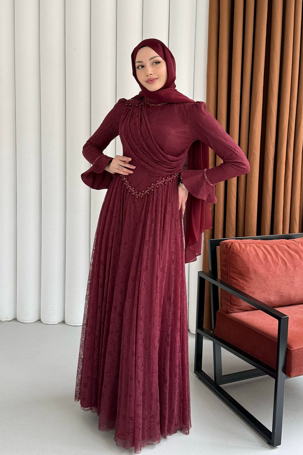 Premium Taş İşlemeli Dökümlü Yaka Tesettür Abiye-BORDO (5230)