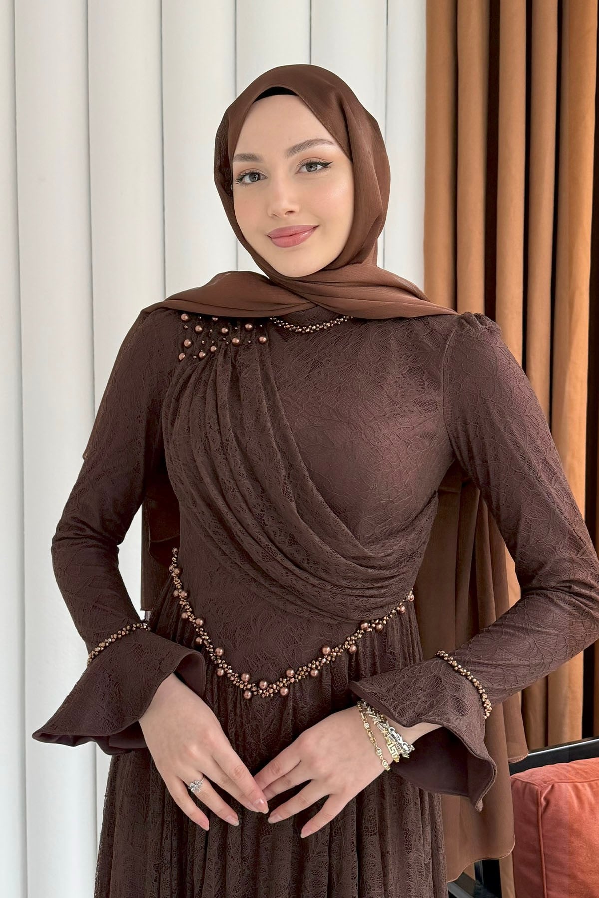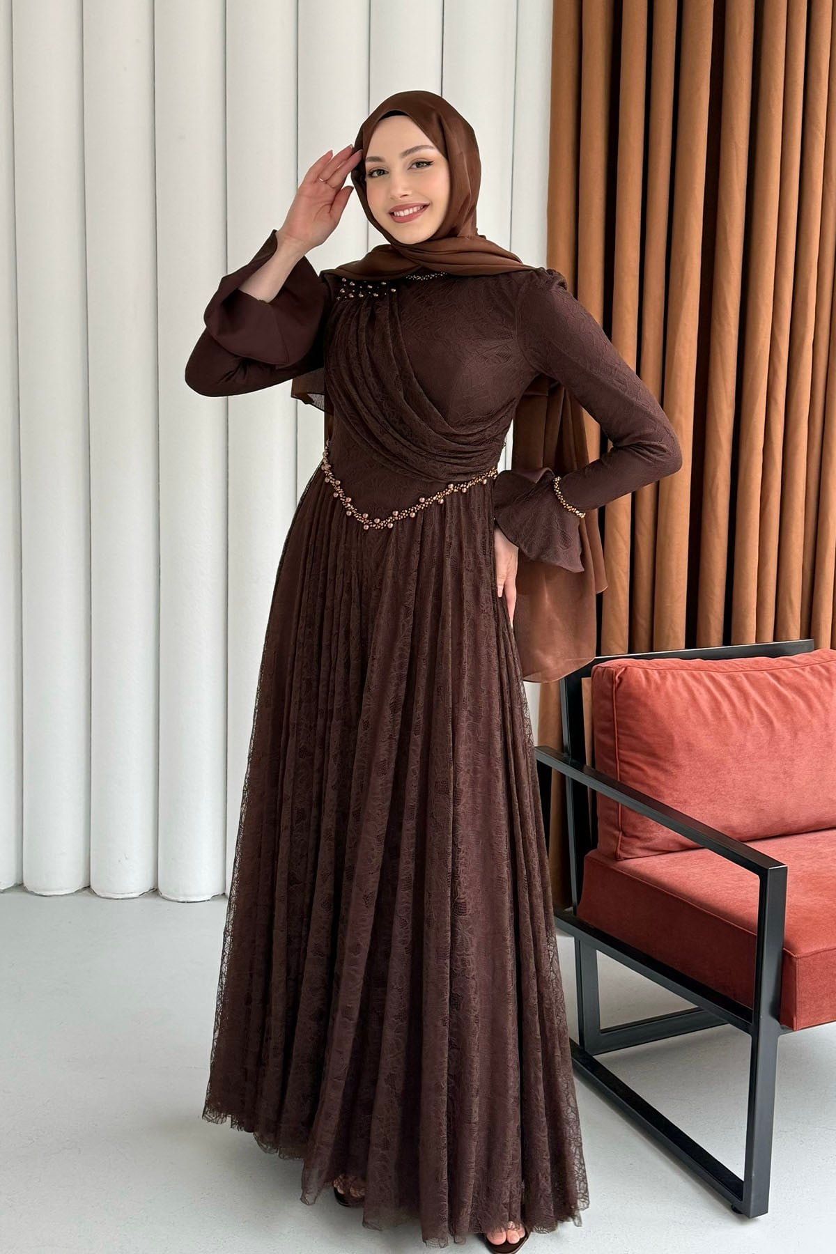 Premium Taş İşlemeli Dökümlü Yaka Tesettür Abiye-KAHVERENGİ (5230)
